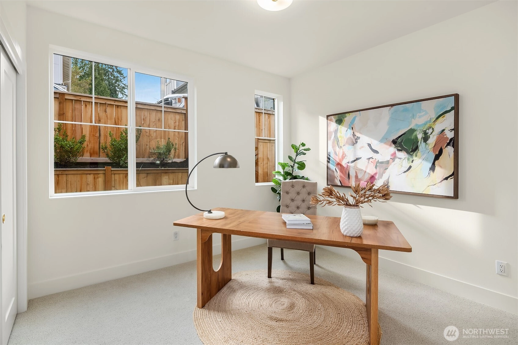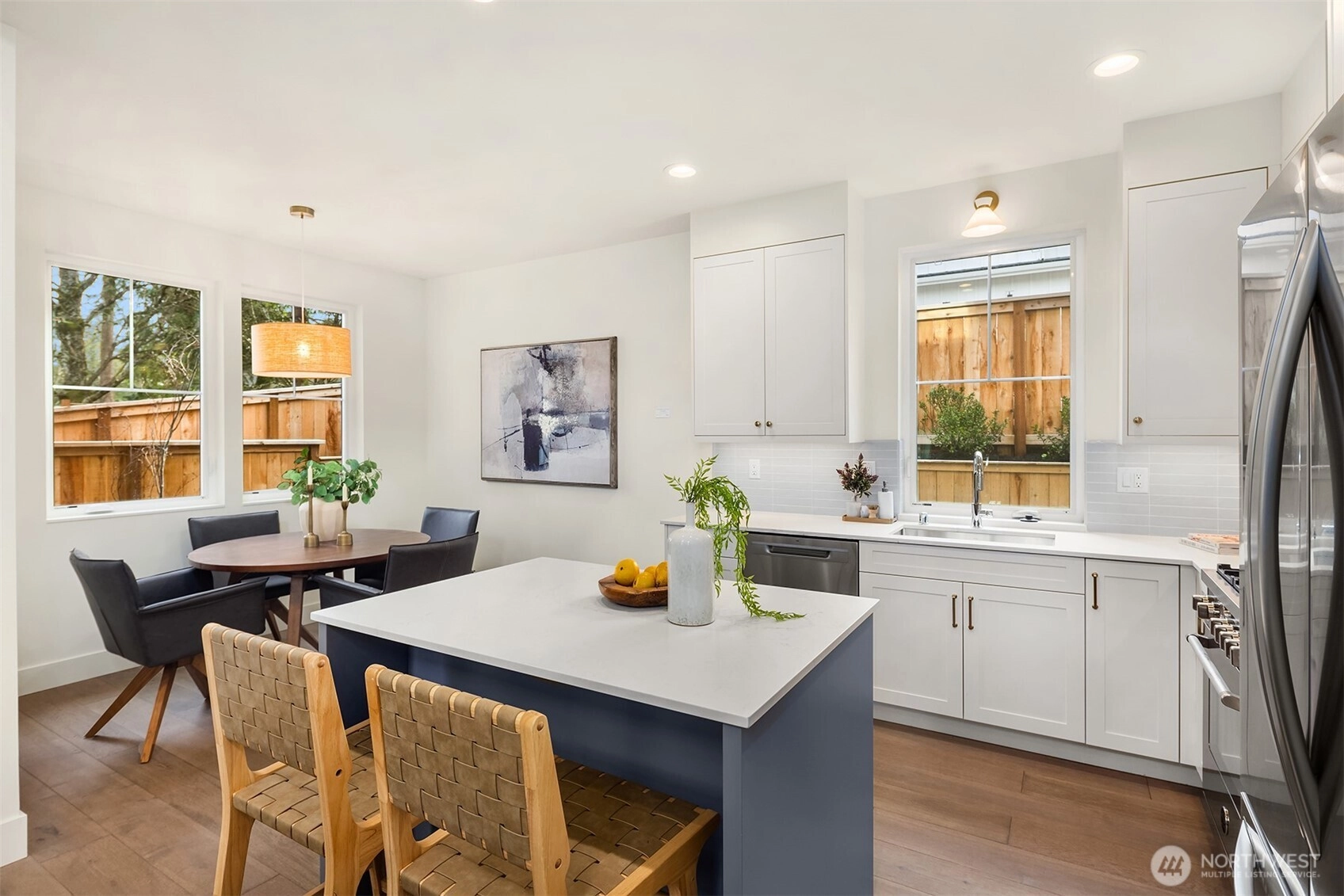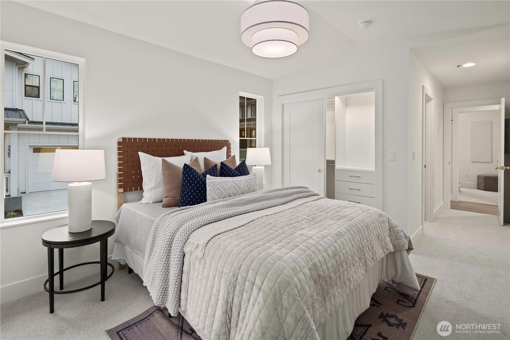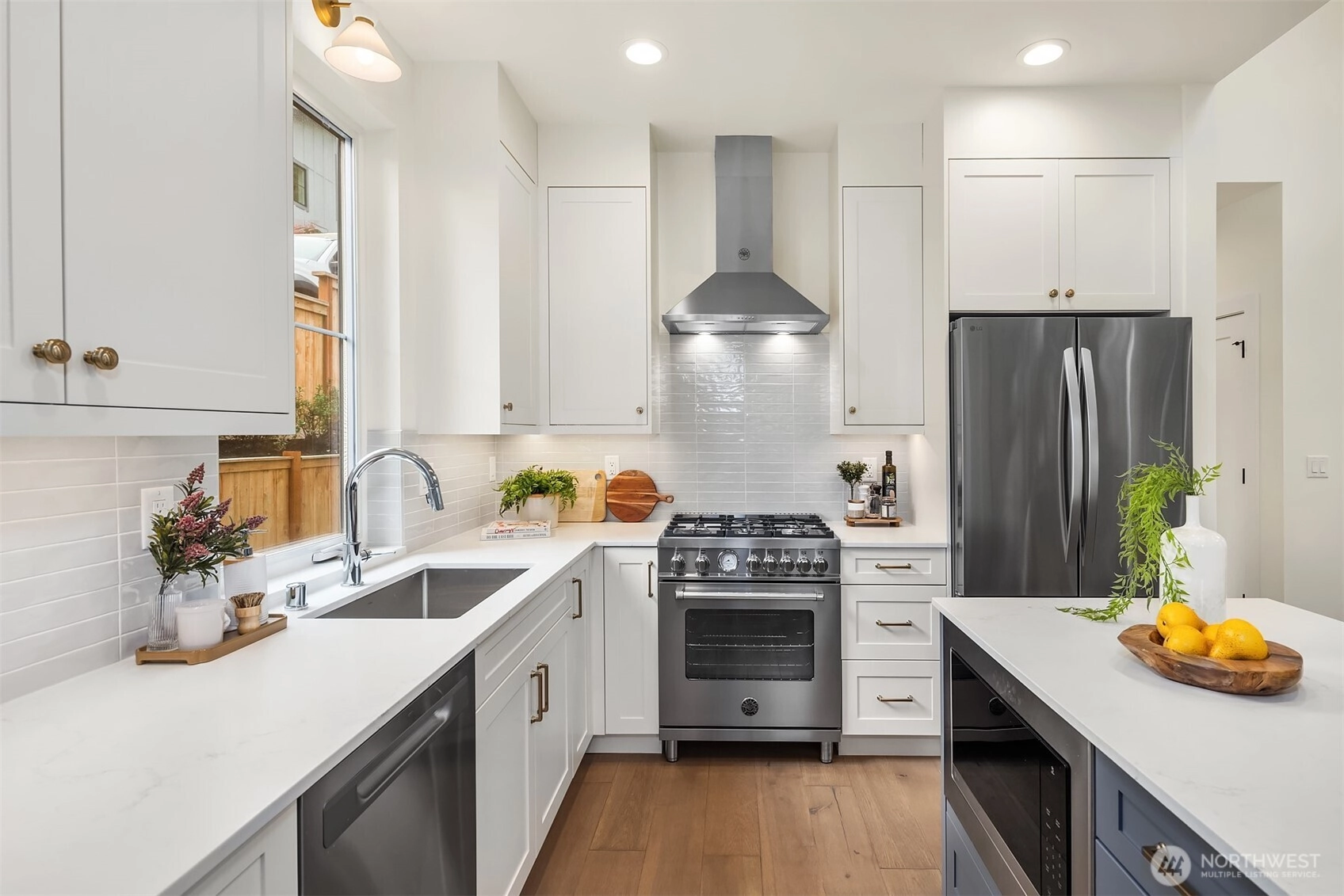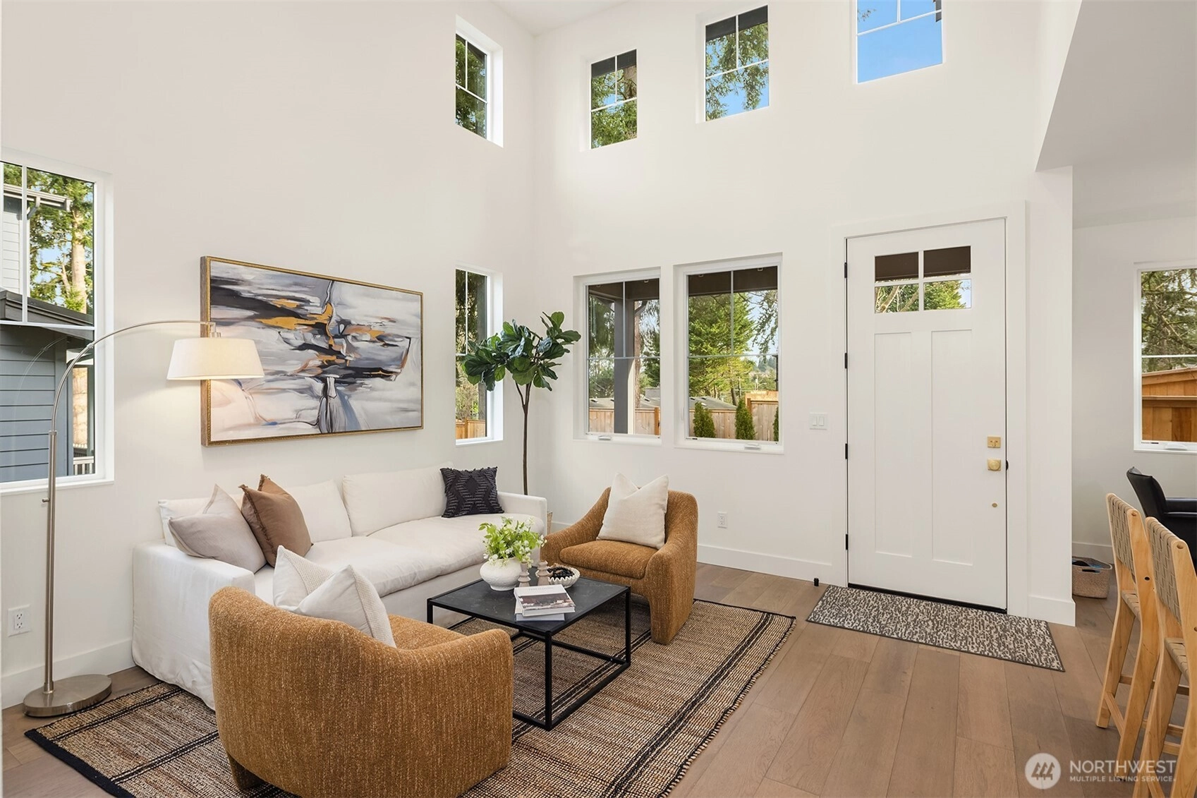 Exceptional new construction cottage by Gerry Homes East of Market, offering refined design & elevated finishes. A charming porch welcomes you to the gracious main level featuring bright & airy two-story living room, with open concept dining and kitchen with gas range and easy access to the yard from the main floor. Unique main floor bedroom and ¾ bath offers flexible floor plan. Upstairs showcases two bedrooms, each with en suite baths for ultimate privacy and convenience. Moments to downtown Kirkland, Lake Washington, & extensive dining.