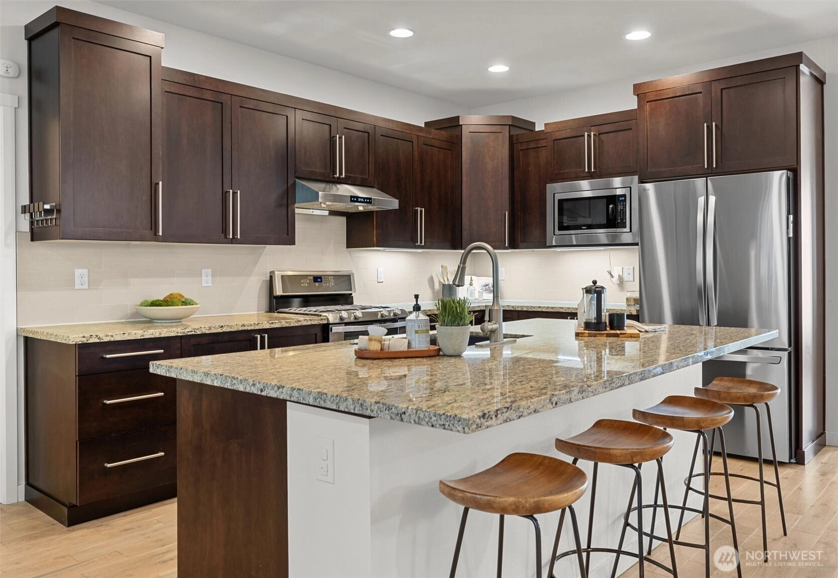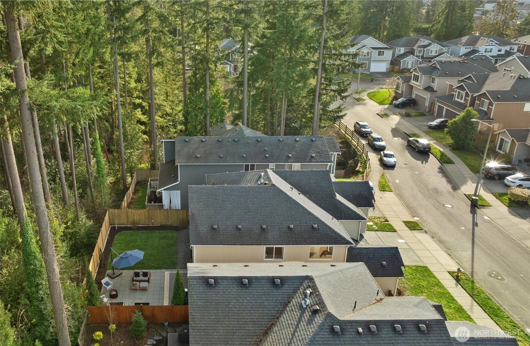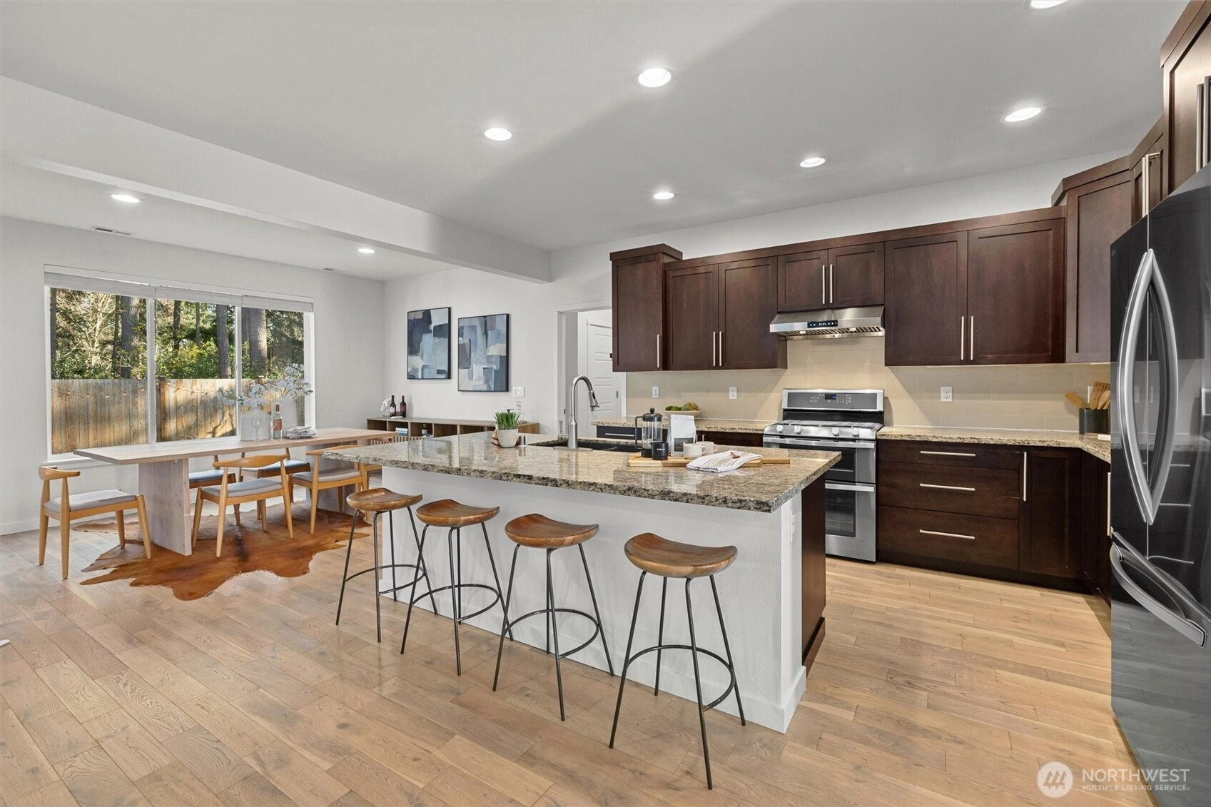 Set against a tranquil nature preserve, this beautiful modern Craftsman offers a rare blend of privacy, elegance, and contemporary design. The light-filled open floor plan with hardwood floors flows effortlessly into a chef-inspired kitchen with granite slab countertops, oversized island, and inviting dining and living spaces—ideal for entertaining. Double corner sliding doors open to a covered outdoor deck with a cozy gas fireplace, creating a seamless indoor-outdoor lifestyle year round. The main level includes a guest bedroom or office with a ¾ bath, while upstairs offers a sun-drenched loft providing versatile flex space, two additional bedrooms, a full bath, laundry room, and a serene primary suite with forest views, dual walk-in closets, and a spa-like bath. The fully fenced, professionally landscaped yard is perfect for relaxing, gardening, or BBQs, and the two-car garage includes extra storage and an EV charger. Ideally located minutes to Costco, Mill Creek Town Center, I-5, Lynnwood Light Rail, and Everett Park & Ride—this home delivers exceptional comfort, style, and convenience.