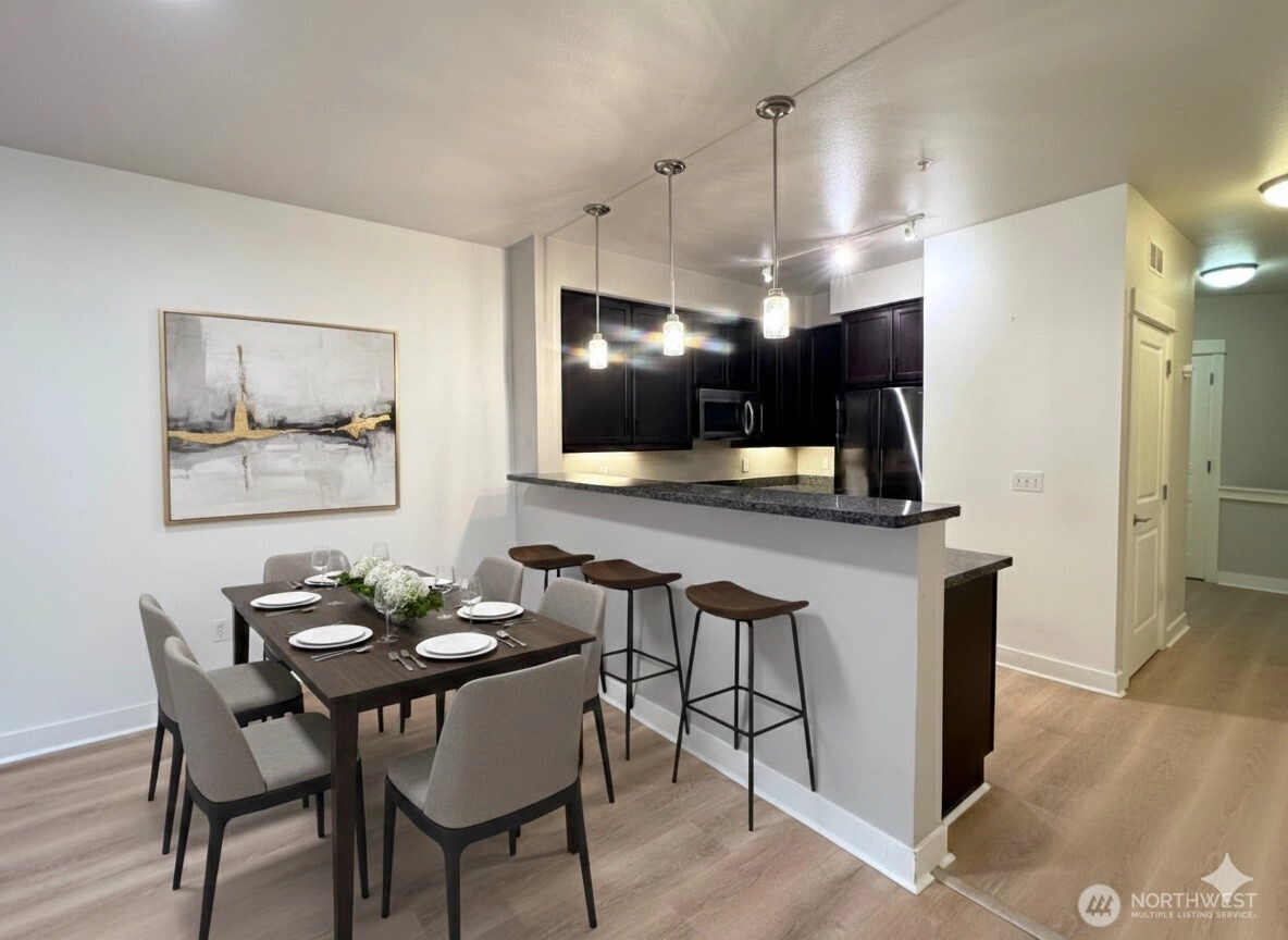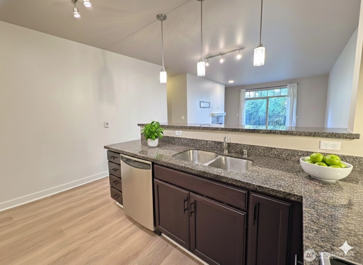Experience the perfect blend of luxury and privacy at Verdeaux. This secluded, secure community offers a spacious open floor plan featuring a grand living and dining area centered around a cozy gas fireplace. The chef-inspired kitchen boasts slab granite countertops, high-end appliances, and a gas cooktop. Retreat to the primary suite, complete with double sinks and an expansive walk-in closet. Enjoy year-round tranquility on your private balcony overlooking a lush, quiet greenbelt. Includes one secured underground parking space and one assigned exterior spot. Ideally located within the acclaimed Northshore School District with seamless access to DT Bellevue, Kirkland, Totem Lake, and major commuter routes.