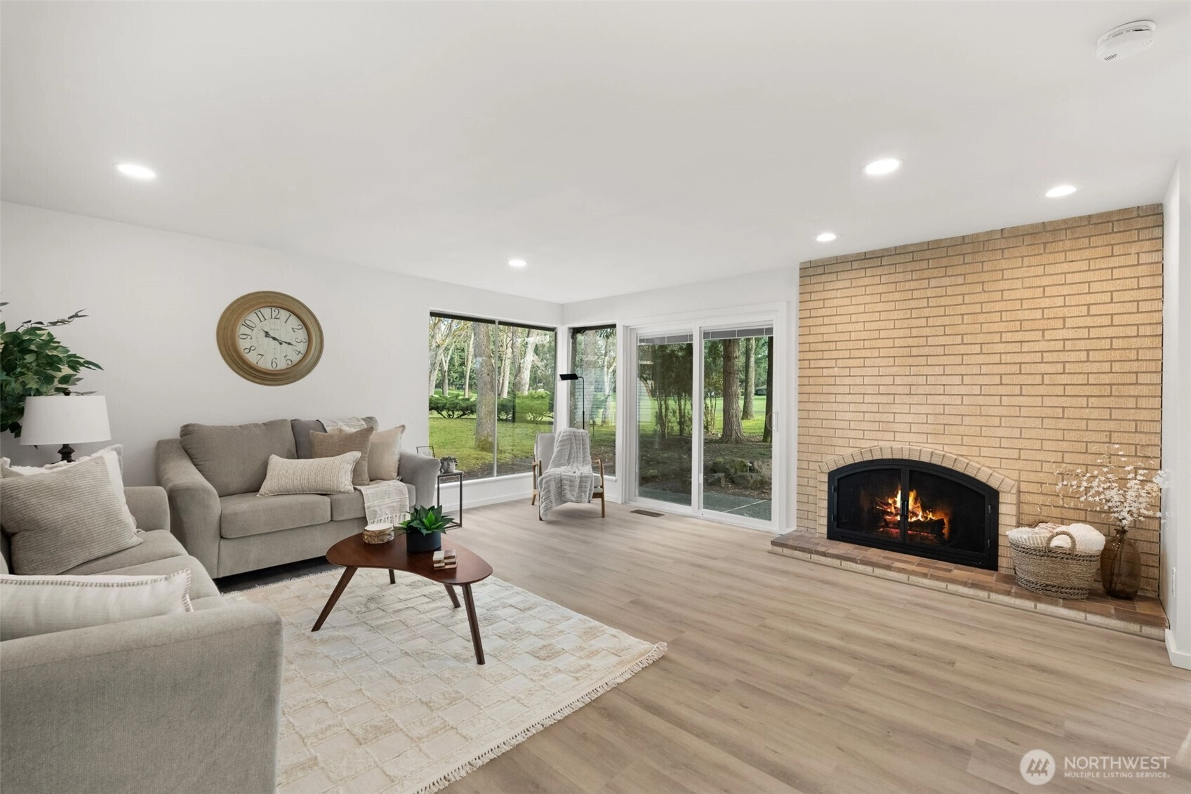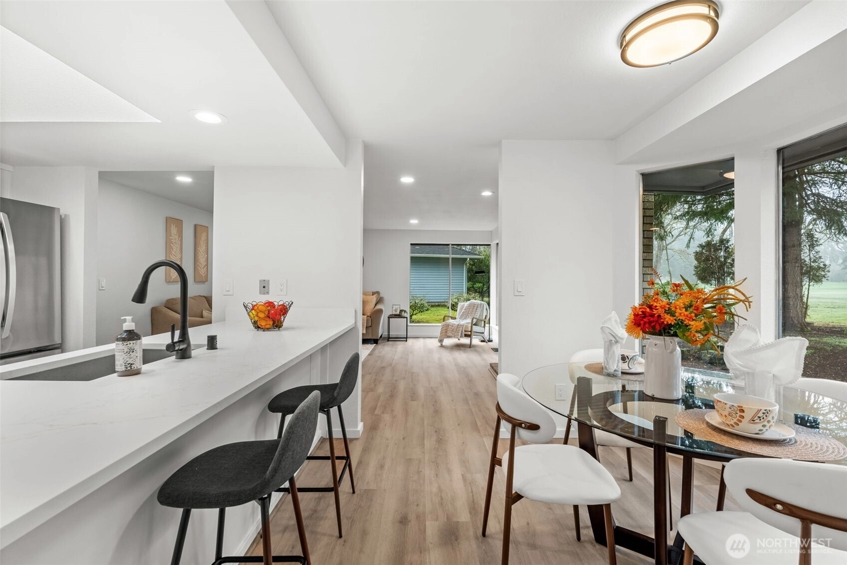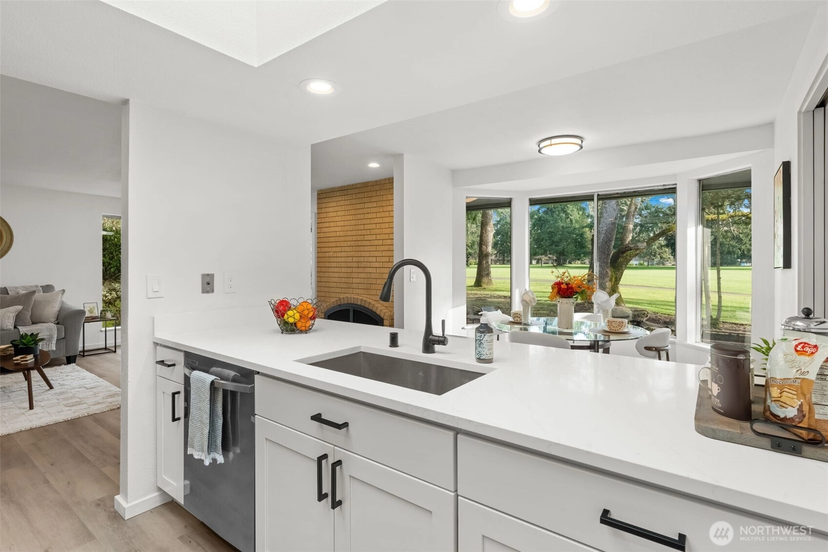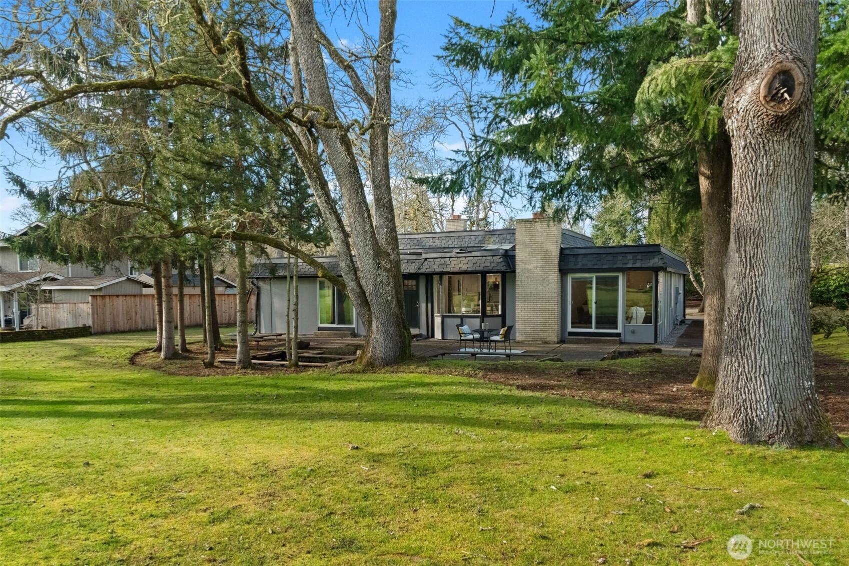 Enjoy golf course living at its finest. Tucked away on a private quarter-acre lot behind the 12th green of Oakbrook Golf Course, this stunning, fully remodeled mid-century modern home seamlessly blends vintage character with new-home luxury. Vaulted ceilings and dramatic floor-to-ceiling windows frame serene golf course and nature views, while new luxury vinyl plank flooring flows throughout. The chef’s kitchen features quartz countertops and opens to the dining and living areas, with sliding doors leading to a spacious patio overlooking the course. The generous primary suite offers a walk-in closet, luxury bath and private patio access. A second bedroom includes its own entrance and patio, while a third bedroom features a Jack-and-Jill bath. Additional spaces include a second living room with fireplace and a versatile finished room ideal for dining, office, or a fourth bedroom. Nearly everything is new—electrical, siding, flooring, lighting, kitchen, baths, and more. Easy access to the Steilacoom waterfront, restaurants, shops & schools.