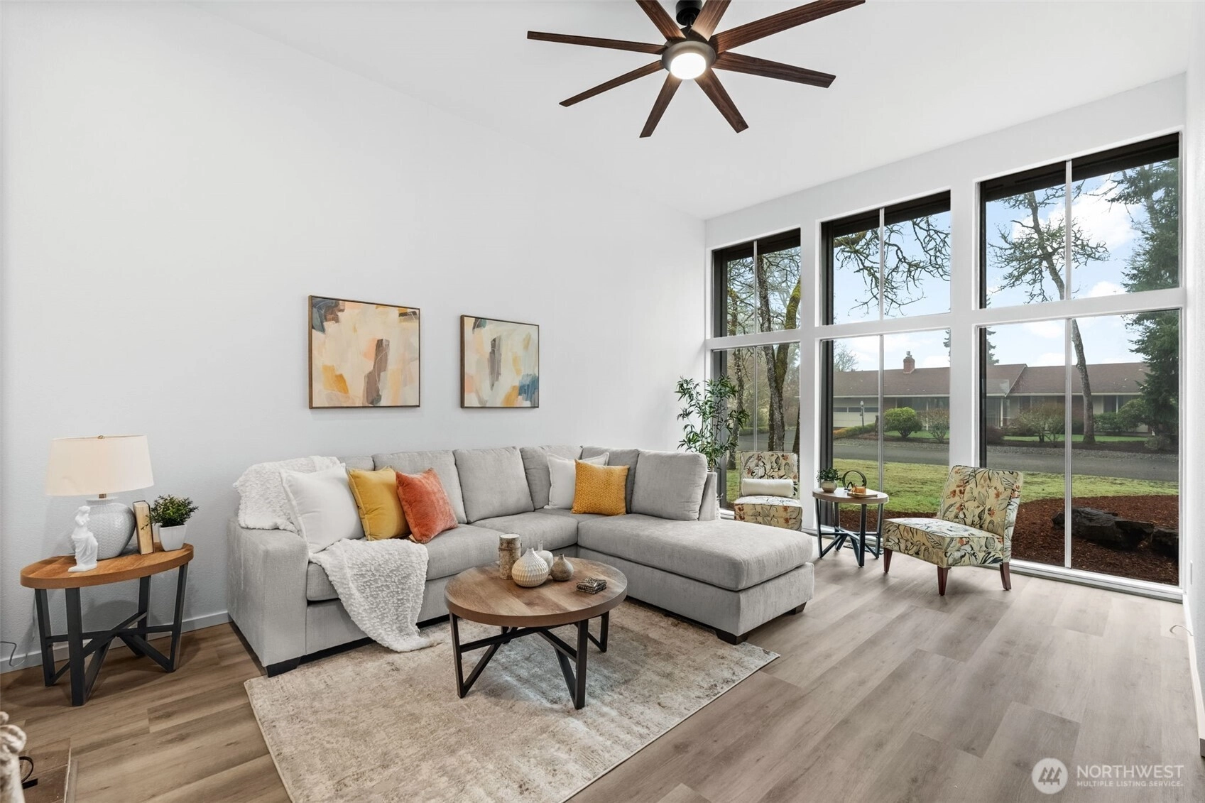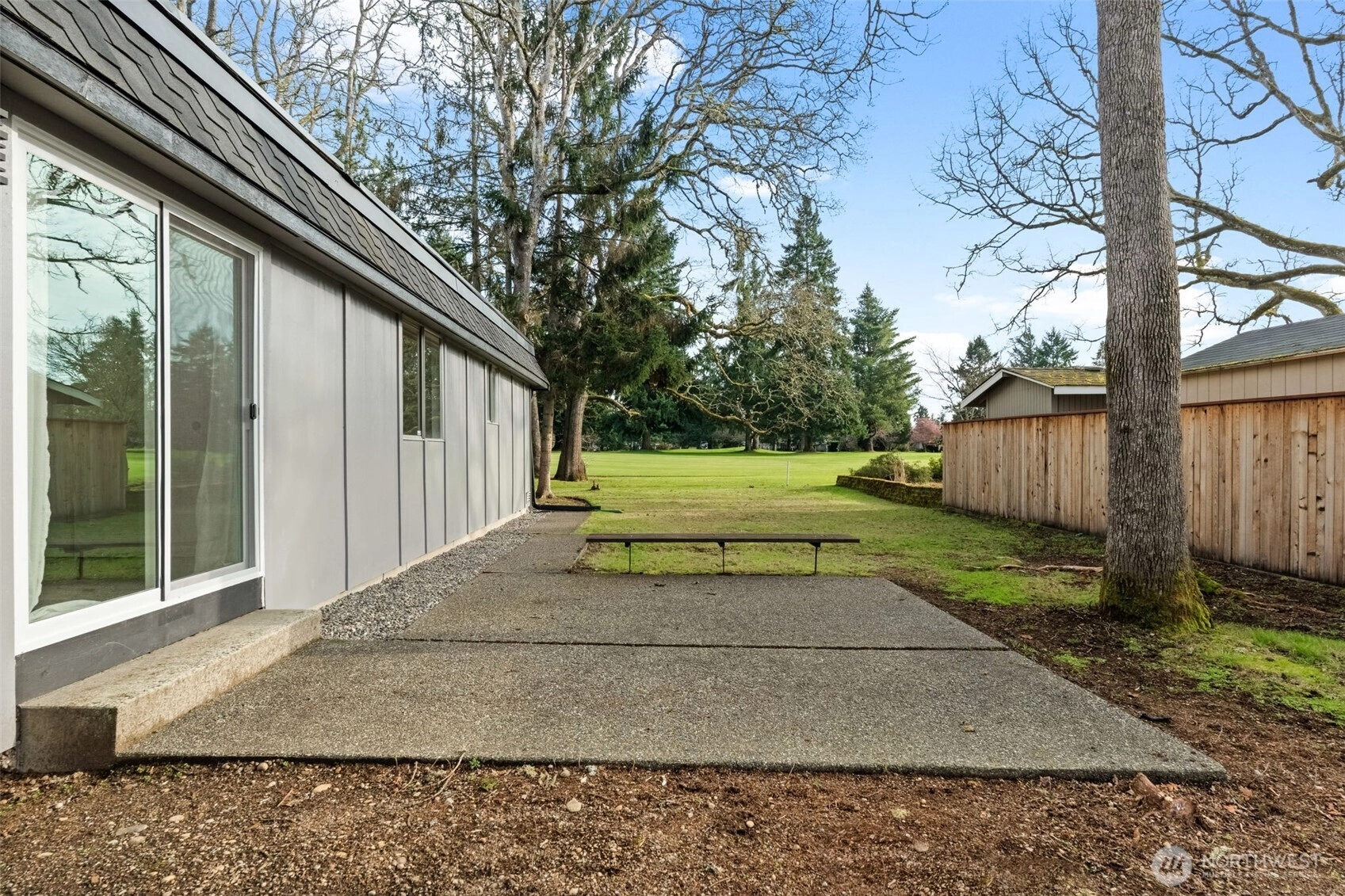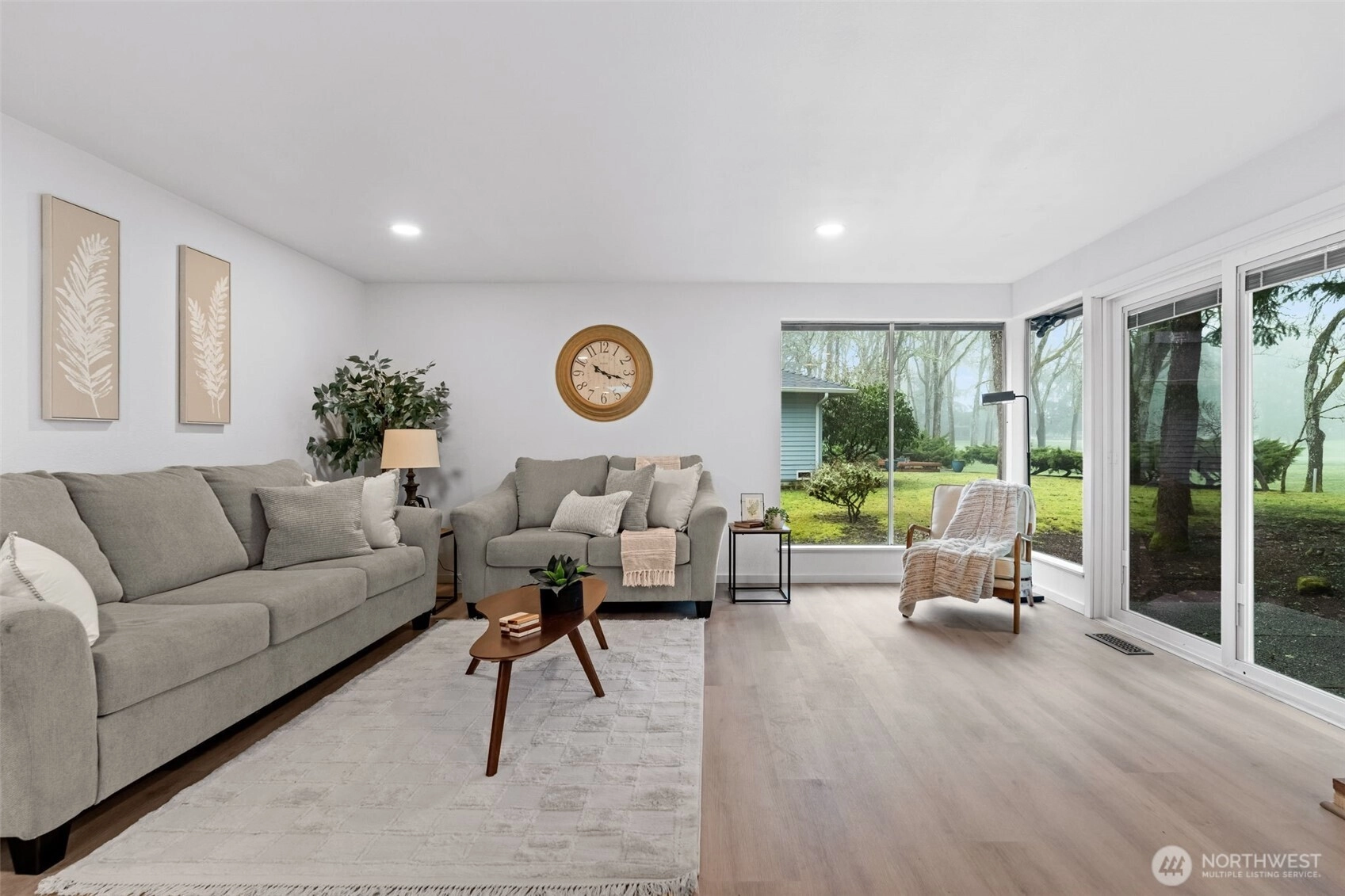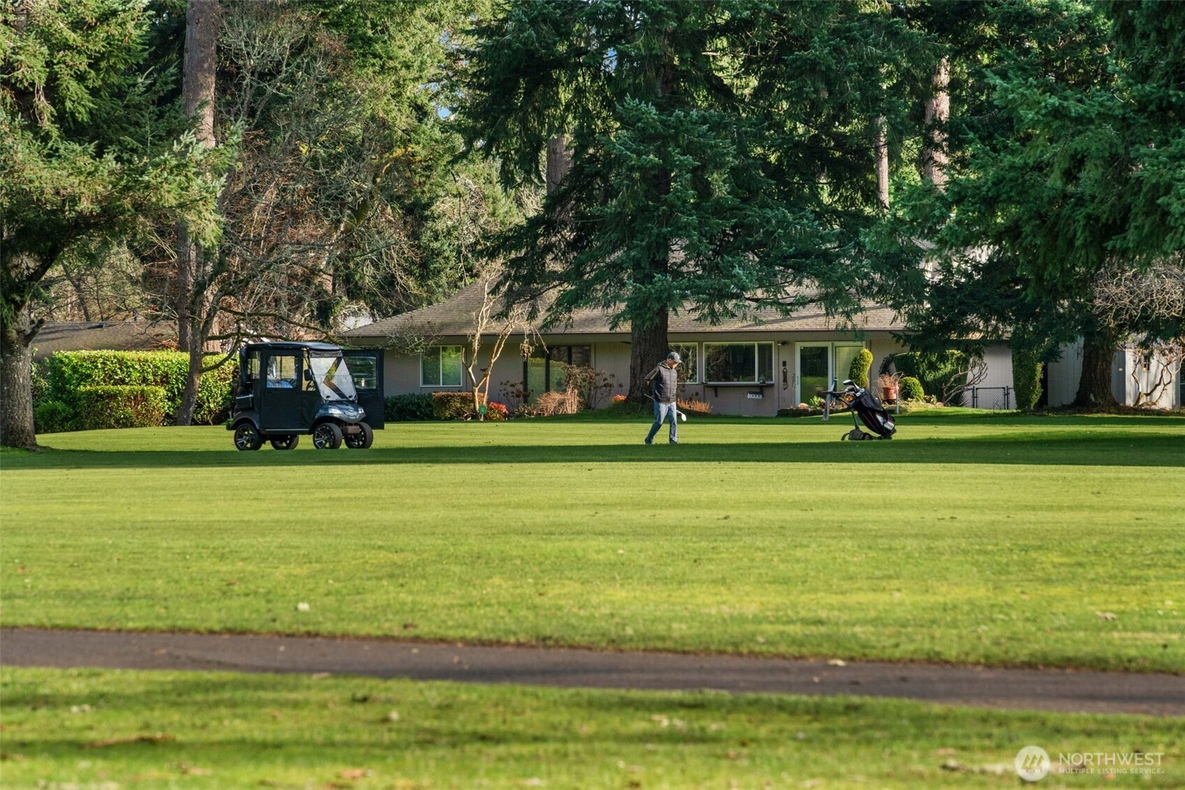 Enjoy golf course living at its finest. Tucked away on a private quarter-acre lot behind the 12th green of Oakbrook Golf Course, this stunning, fully remodeled mid-century modern home seamlessly blends vintage character with new-home luxury. Vaulted ceilings and dramatic floor-to-ceiling windows frame serene golf course and nature views, while new luxury vinyl plank flooring flows throughout. The chef’s kitchen features quartz countertops and opens to the dining and living areas, with sliding doors leading to a spacious patio overlooking the course. The generous primary suite offers a walk-in closet, luxury bath and private patio access. A second bedroom includes its own entrance and patio, while a third bedroom features a Jack-and-Jill bath. Additional spaces include a second living room with fireplace and a versatile finished room ideal for dining, office, or a fourth bedroom. Nearly everything is new—electrical, siding, flooring, lighting, kitchen, baths, and more. Easy access to the Steilacoom waterfront, restaurants, shops & schools.