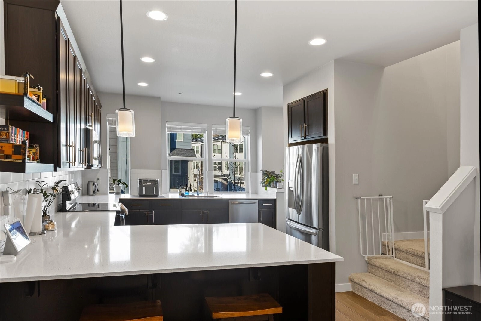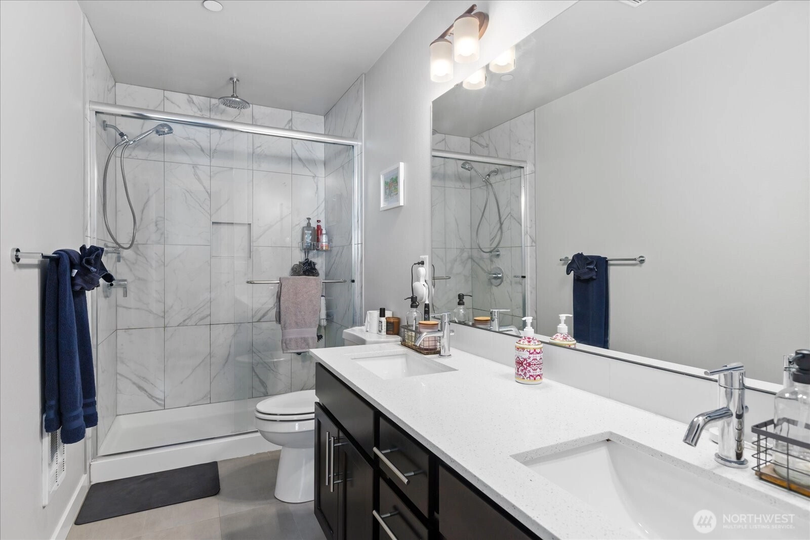 Welcome home to this newer-build townhome-style residence in the Lake Stickney neighborhood! Mukilteo schools & modern living at it's finest! The light-filled main level features a huge, show-stopping kitchen with quartz countertops, stainless appliances, ample cabinetry, a walk-in pantry, and a wall of windows that bring the outdoors in. Stylish LVP flooring throughout the main and lower level, enhances the open, contemporary feel, ideal for both daily living and entertaining. This home offers three spacious bedrooms, **each with its own private en-suite bath** providing exceptional flexibility for working from home, guests, roommates, or multi-generational living. Stay comfortable year-round with energy-efficient mini-splits and A/C. Perfectly positioned backing to a peaceful greenbelt and community playground, this three-level home offers rare privacy, natural views, and modern comfort. Enjoy the perfect blend of nature and convenience—greenbelt views out back with quick access to Lake Stickney Park, shopping, dining, and major commuter routes including the Lynnwood light rail station, I-5 and I-405. Modern, move-in ready, and thoughtfully designed, this home truly has it all.