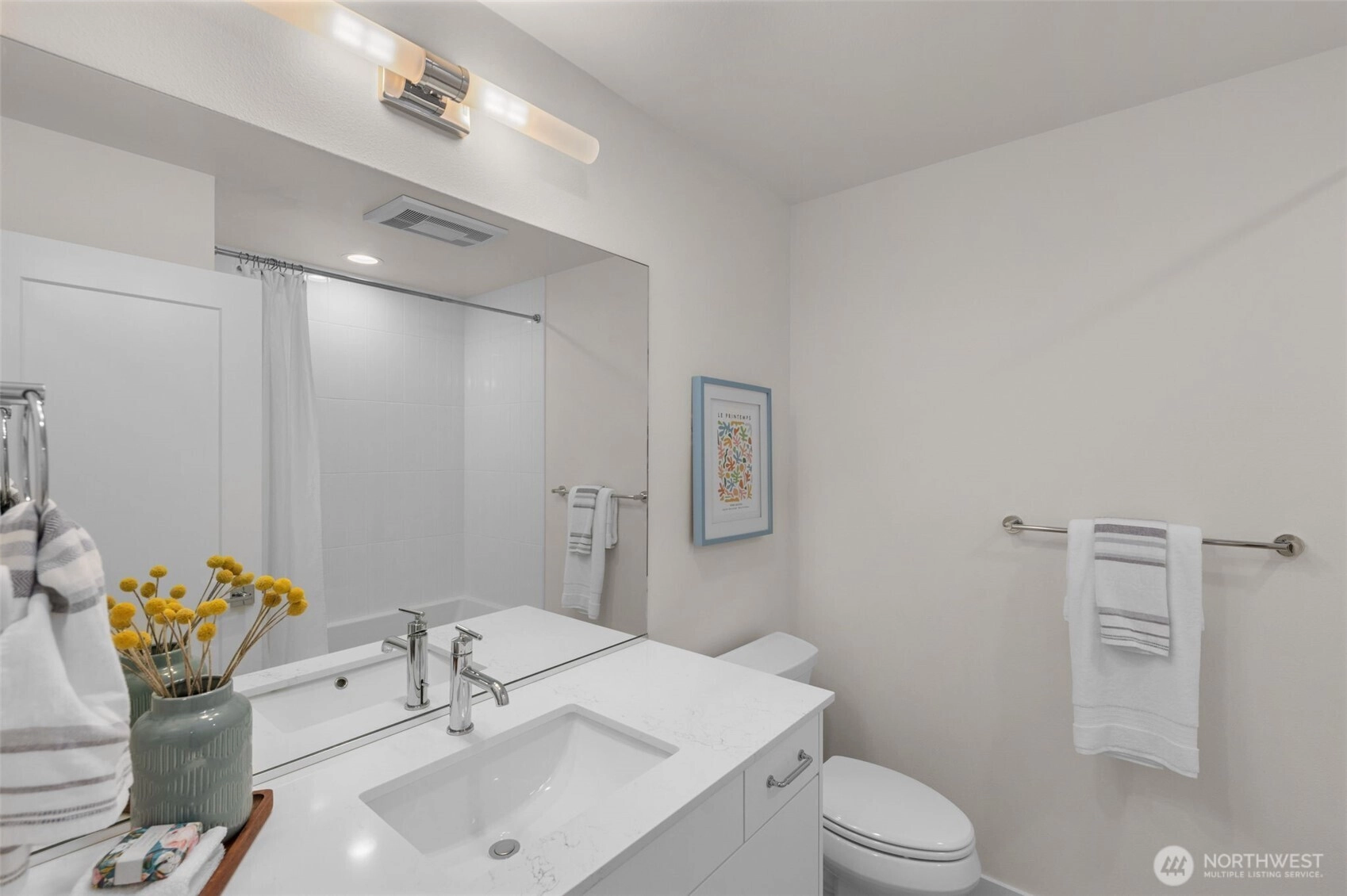 A light filled space with an outdoor space to match, this modern Ballard home offers 1,793 sq ft of flexible living plus courtyard access and a private rooftop deck. The entry level welcomes you with two bedrooms, a full bath, and a dedicated utility room—ideal for guests, work-from-home needs, or everyday functionality. Upstairs, the main level opens wide with generous living and dining spaces anchored by a thoughtfully designed kitchen featuring stainless steel appliances, ample cabinetry, bonus storage, and custom window coverings. A convenient powder bath completes the floor, making it equally suited for daily living and entertaining. The upper level is reserved for the primary suite and an additional bedroom that easily flexes as a nursery, office, or fitness space. The primary retreat is well-proportioned and private, complemented by a spacious bath and comfortable separation from the rest of the home. At the top, a rooftop deck expands living outdoors with gas, water, outlets, and perimeter lighting—perfect for hosting, relaxing, or enjoying long summer evenings. A deeded, EV-capable parking space in the alley adds everyday convenience. Just blocks from Soundview Playfield, Baker Park, Met Market, and Ballard’s dining and shopping scene, this home delivers space, flexibility, and neighborhood connection—wrapped in a modern design that truly lives well. (Call to learn about rate incentives)***