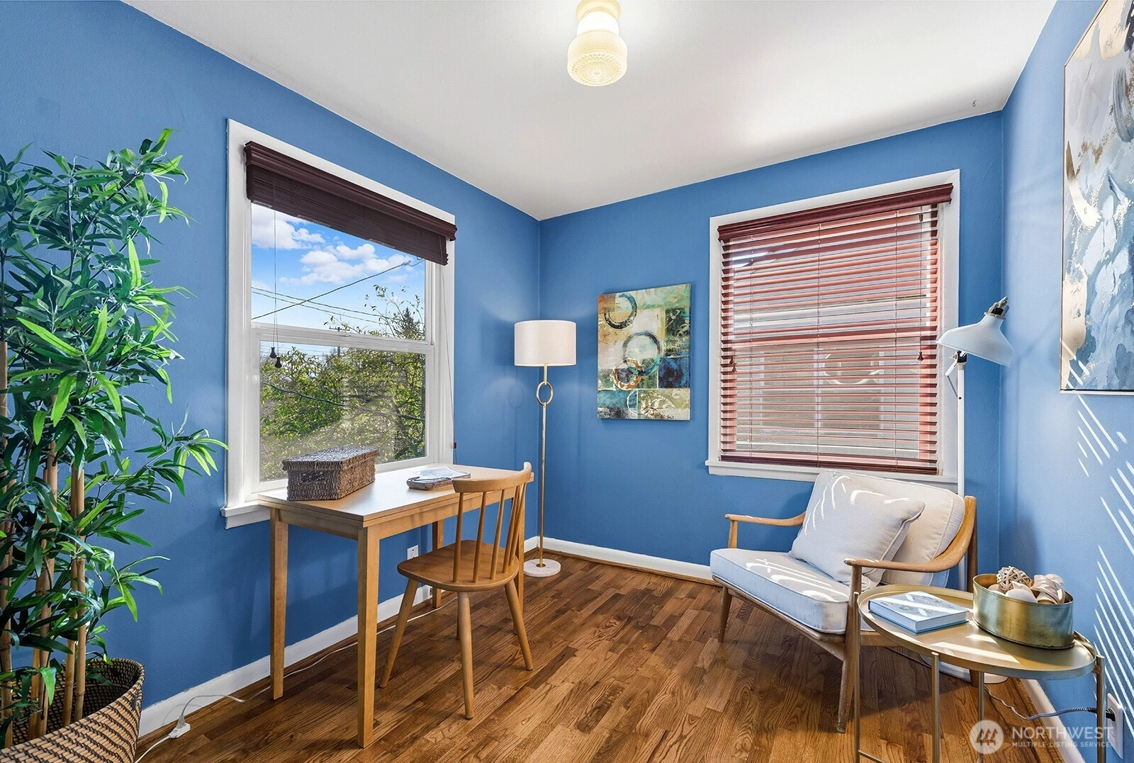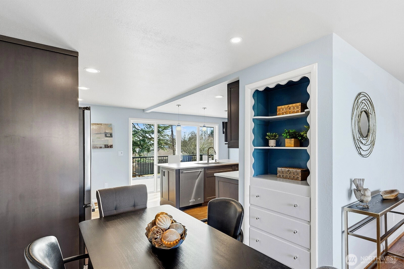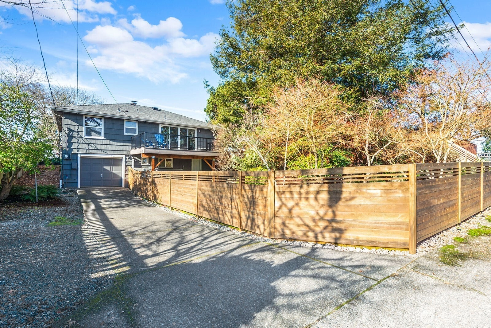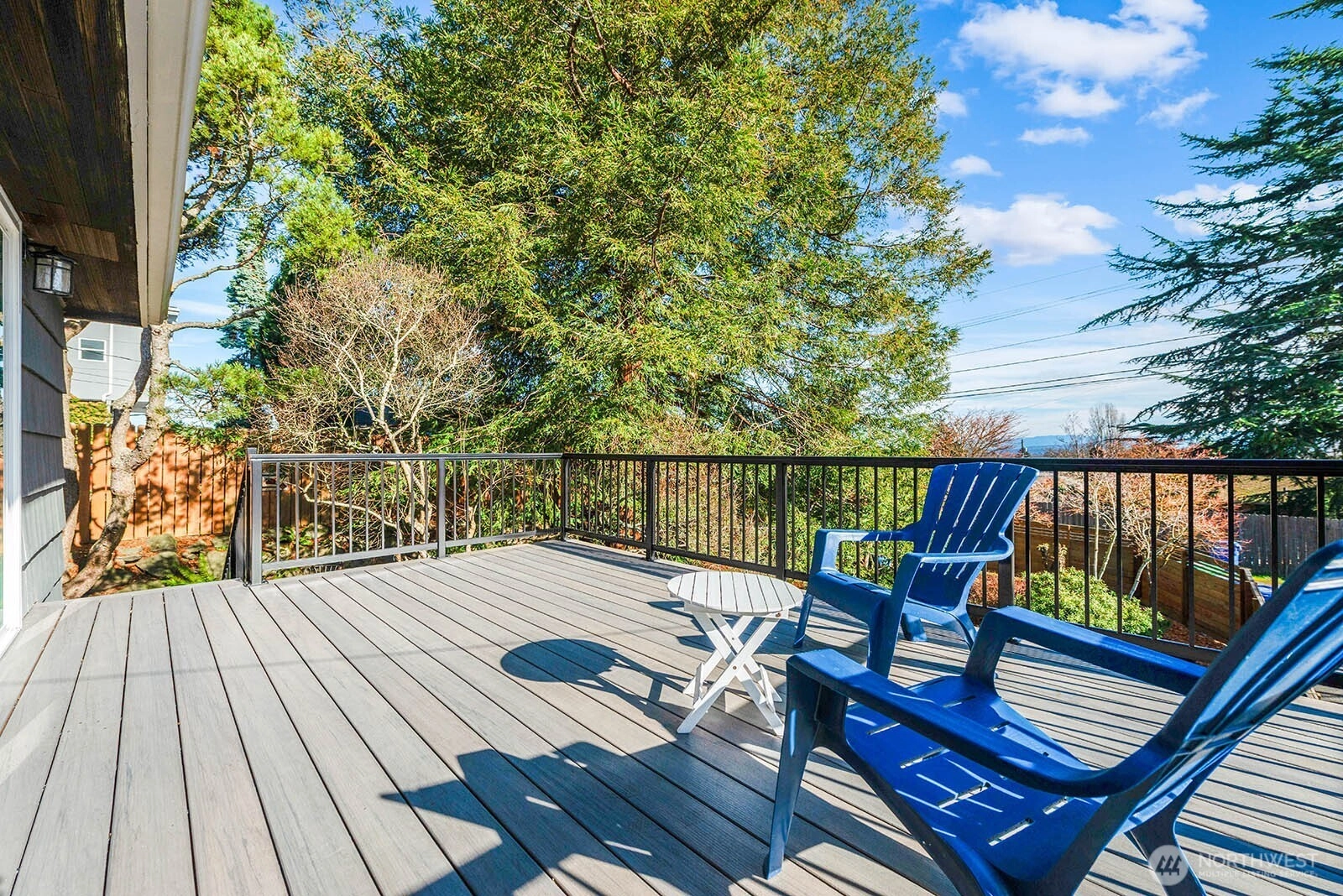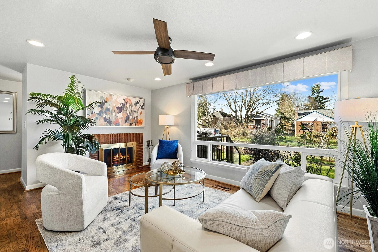 Beautifully Maintained Mid-Century Home on Gatewood Hill combines timeless character with thoughtful updates throughout. A welcoming front porch ushers you into the living room with wide picture window and brick fireplace. Adjacent dining area can accommodate 8 easily. The kitchen, completely remodeled in 2021 offers center island with seating, beautiful tile, quartz countertops and abundant cabinets and even a bar area. Pristine refinished hardwood floors flow through this level which also includes a tastefully updated full bath and 3 bedrooms. Enjoy morning sunrises and mountain views from the spacious east-facing deck added in 2022, also from the kitchen and back bedroom. The comfortable lower level includes a family room with second brick fireplace, a dedicated laundry room, a small den or work room, an updated 3/4 bath and storage. New roof installed in 2018, heating and A/C with heat pump in 2023, new hot water tank in 2025 and fencing in 2020. The large lot provides plenty of space for gardening, play, and outdoor entertaining. Parking is easy with a tandem 2-car garage plus room for 4 additional cars in the driveway, accessible from the paved alley. Located in the sought-after Gatewood Hill neighborhood, just half a block to Myrtle Reservoir Park and conveniently close to bus routes offering easy access to downtown Seattle. This home has been beautifully maintained and updated throughout—a true gem offering comfort, style, and exceptional livability.