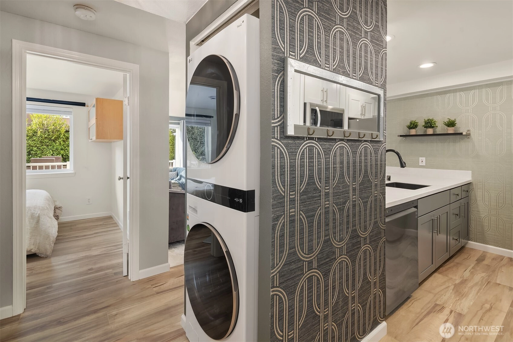 Discover The Victorian, Northgate's tucked away urban enclave, where convenience & affordability meet in stunning luxurious fashion! Elegantly appointed & move-in ready, this art deco inspired jewel box dazzles with modern new upgrades & infinitely alluring style. The spacious open layout lives large with grand living room, tiled gas fireplace, bay window & office nook open to designer kitchen with two-tone shaker cabinets, quartz counters, stainless steel appliances & extra deep dining bar. You'll fall in love with the opulent wall coverings, decorative paint, white millwork, high-end lighting, & gorgeous spalted maple LVP flooring. Primary suite with walk-in closet + full-size washer/dryer & tiled bath with soaking tub. A sought-after ground-floor gem on a solid slab foundation featuring secure underground parking, updated elevator & covered paver patio with private entrance overlooking sprawling courtyard garden. I-5 pedestrian bridge with direct access to Northgate light rail station is just steps away. A prime investment opportunity, pet-friendly & no rental cap!