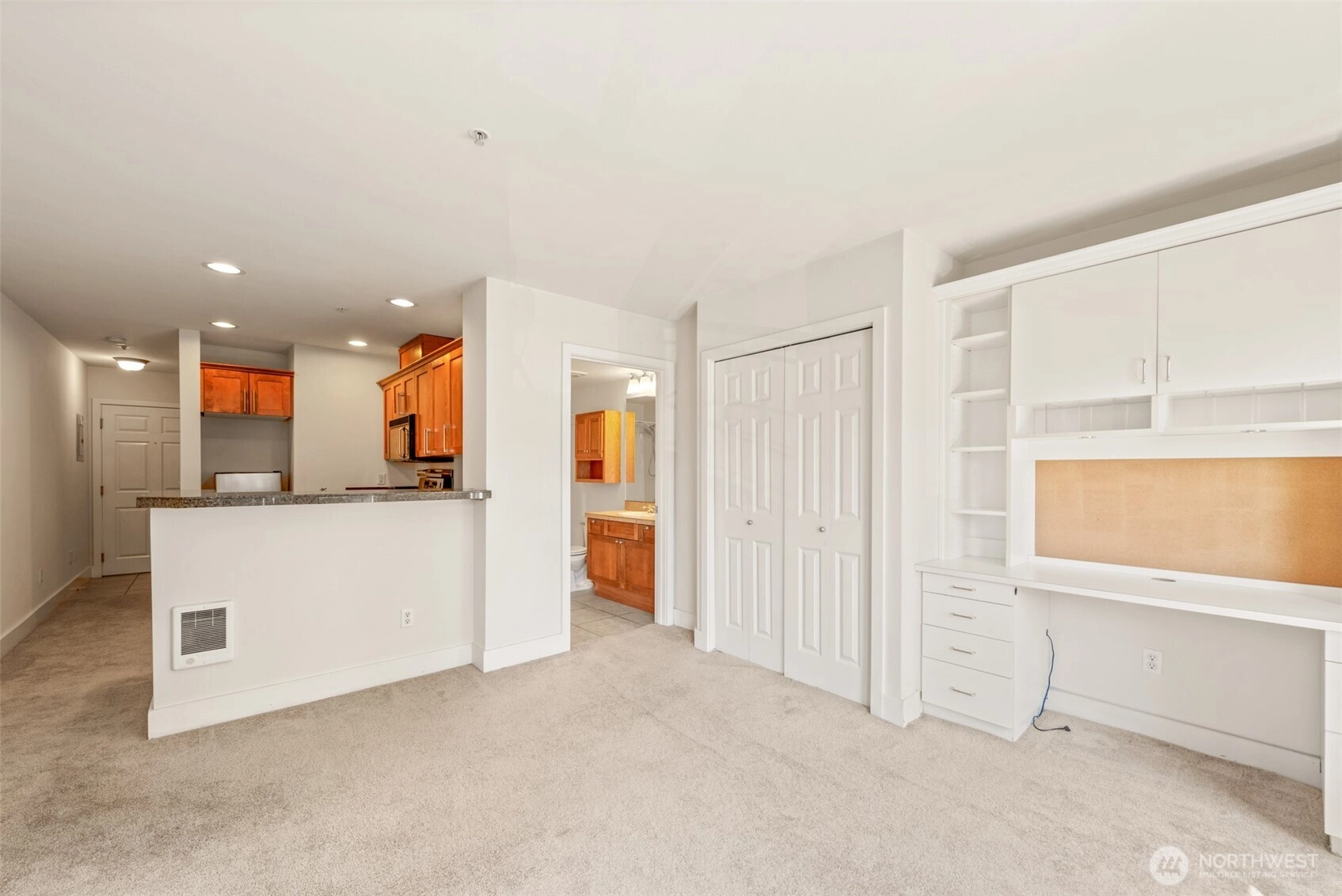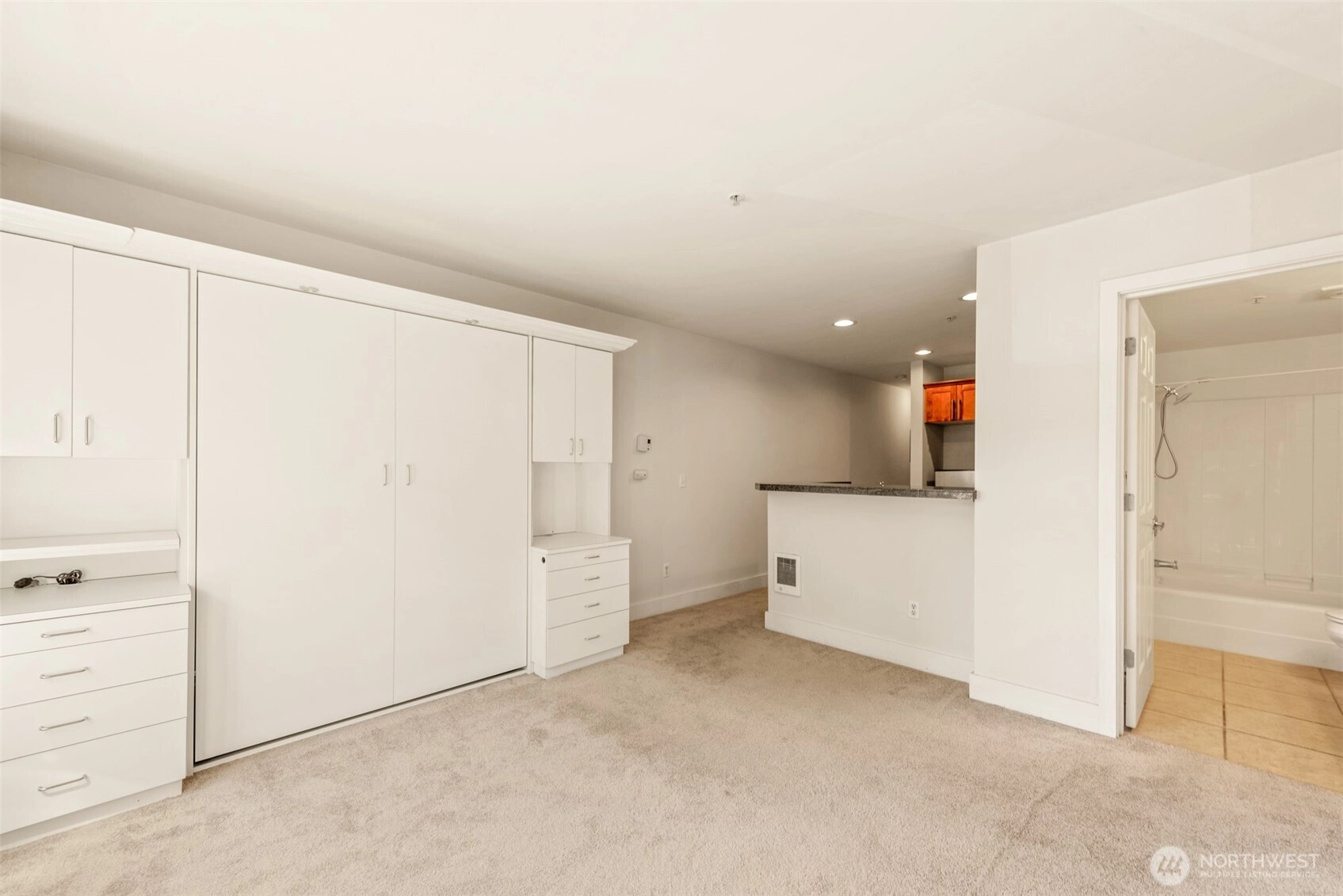 Step into this bright studio, boasting a custom Murphy bed and ample built-in storage solutions. The open kitchen showcases cherry cabinets, granite countertops, and a convenient breakfast bar. Set within a charming brick building, enjoy the tranquil garden courtyard and secure garage parking. Explore just steps from your doorstep, with a bridge leading to the waterfront park nearby and all the delights of Seattle within a few minutes' walk. Welcome to your new home!