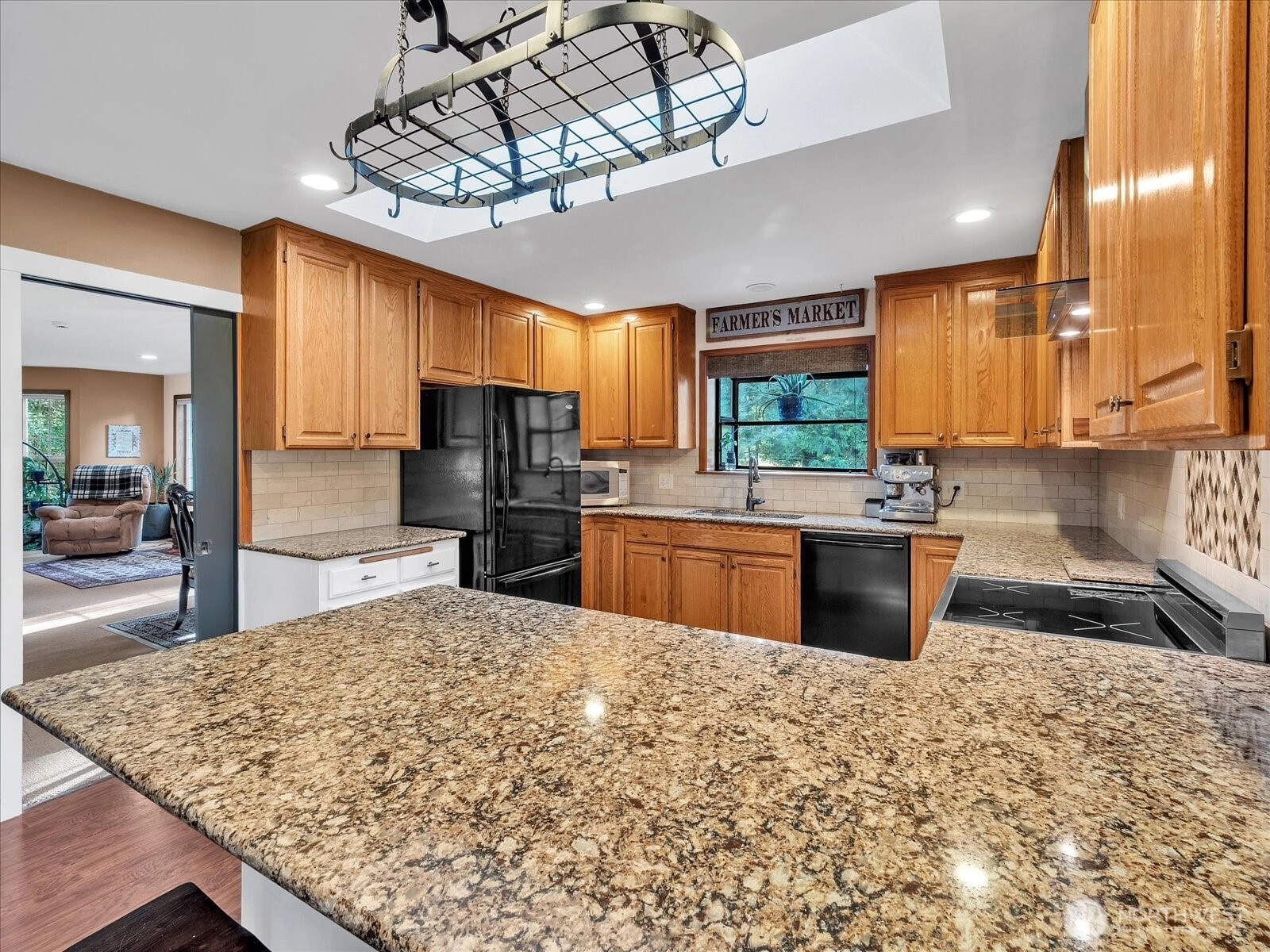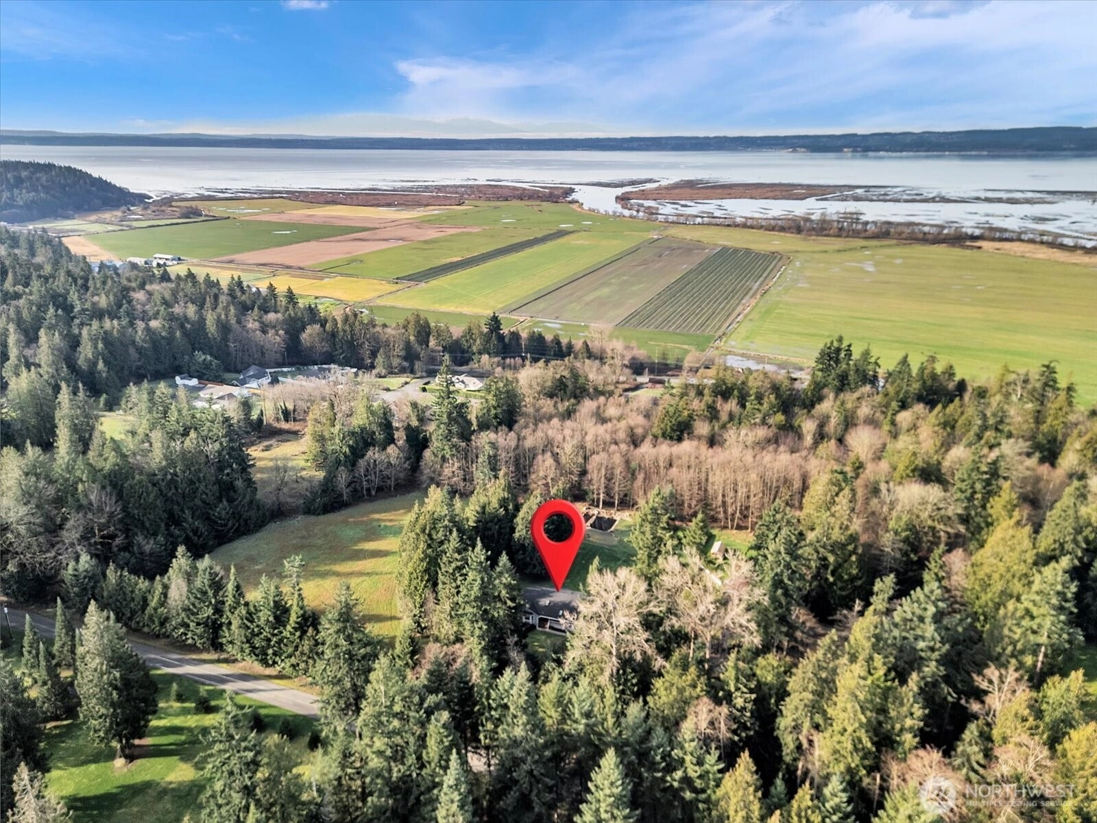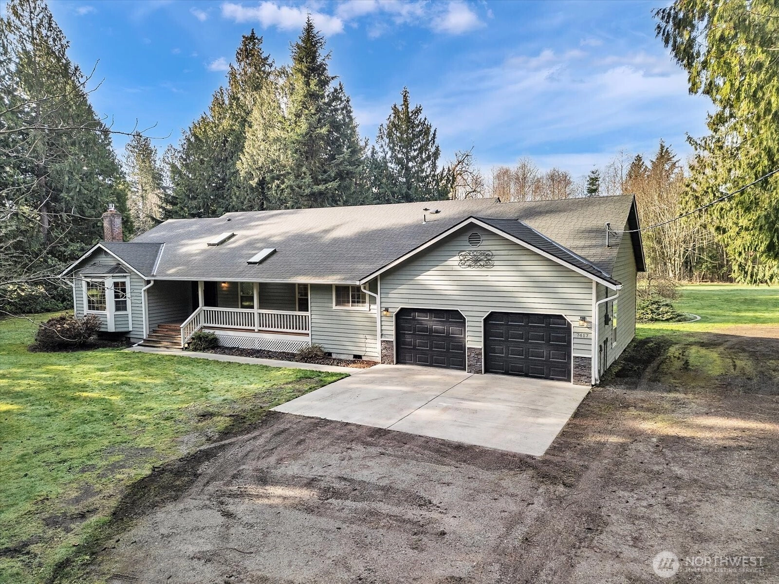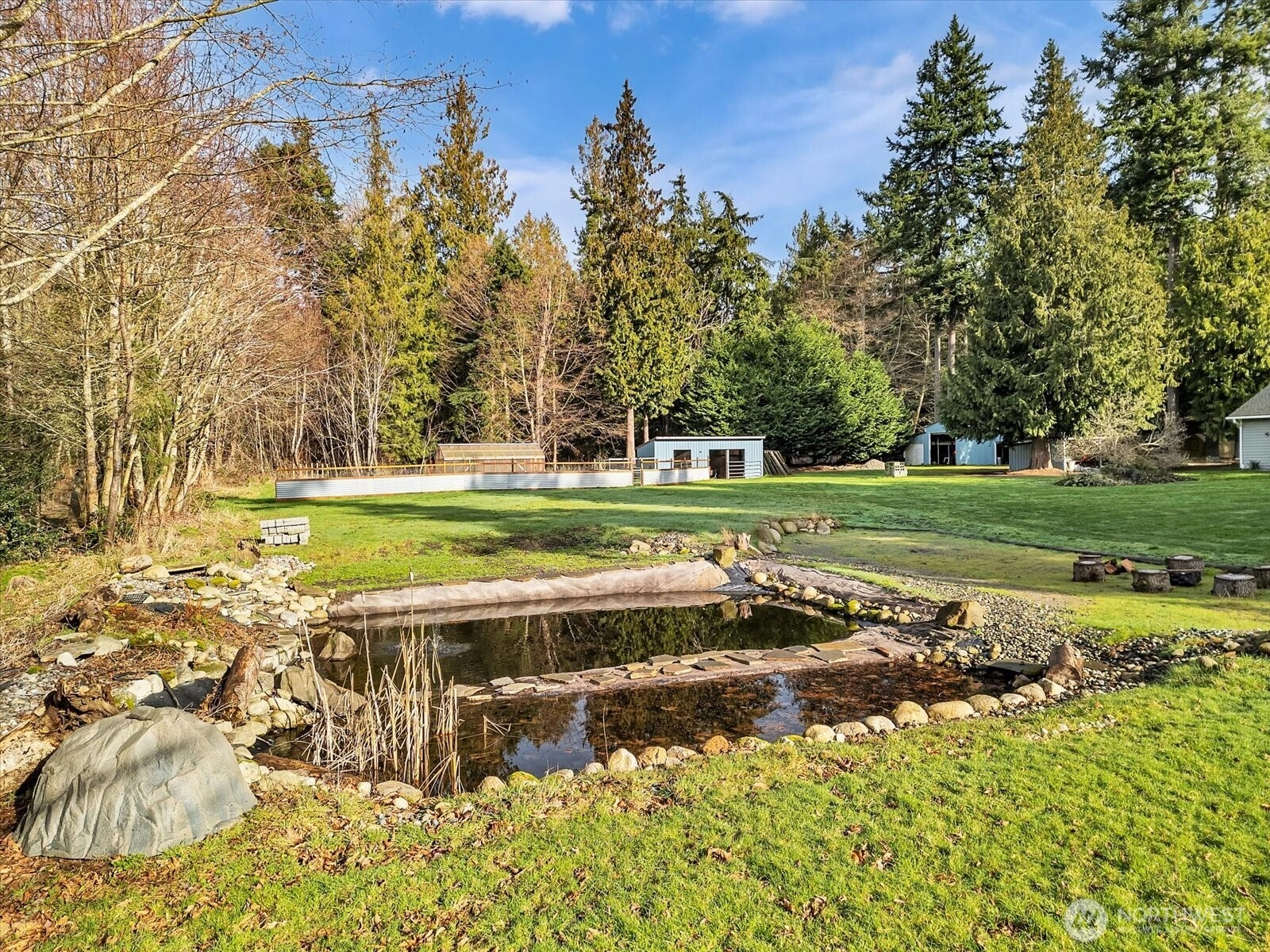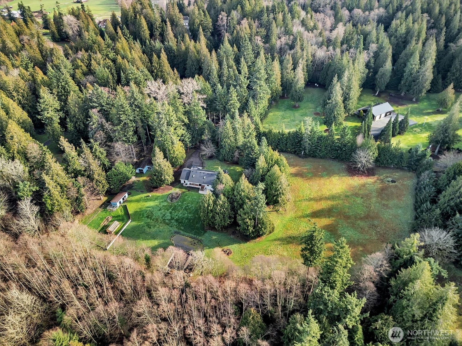 In the gated Silvana Crest community, set back on a private drive, this inviting 5 acre rambler offers peaceful privacy surrounded by nature. Inside, enjoy bright, spacious living with oversized windows, warm wood trim, and a cozy brick fireplace. The kitchen shines with granite counters, ample cabinetry, and easy flow to the dining area for everyday living or entertaining. Updated bath with crisp finishes and modern fixtures. Comfortable bedrooms plus flexible spaces for work, hobbies, or guests. Outside, soak in the serenity of the open lawn, pond with water feature, and wooded backdrop, perfect for gardening, play, or quiet evenings. Attached two-car garage, ample parking, additional outbuildings, and fenced garden/pasture. A rare blend of space, comfort, and nature.
