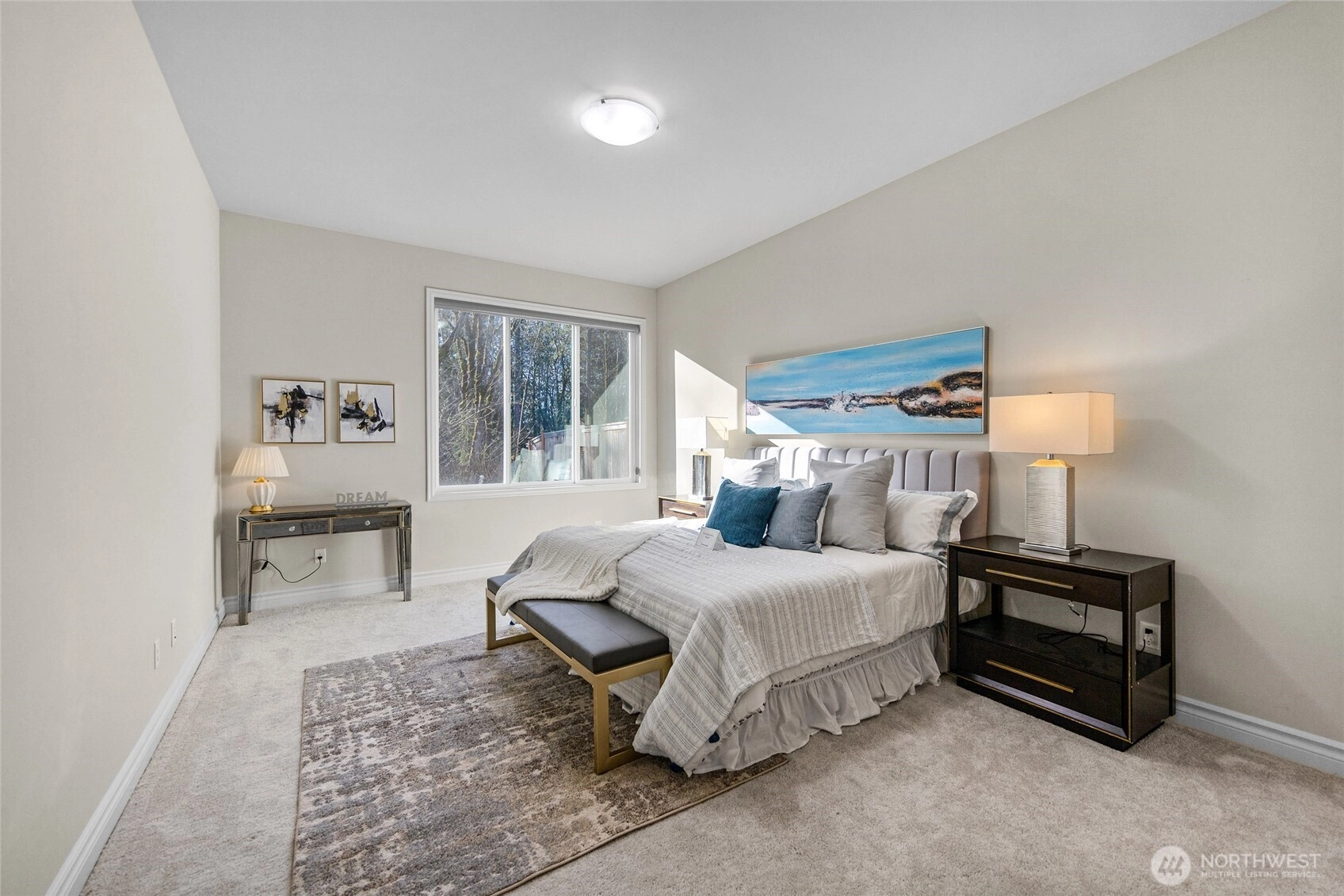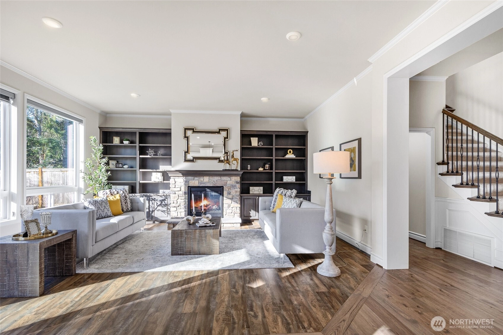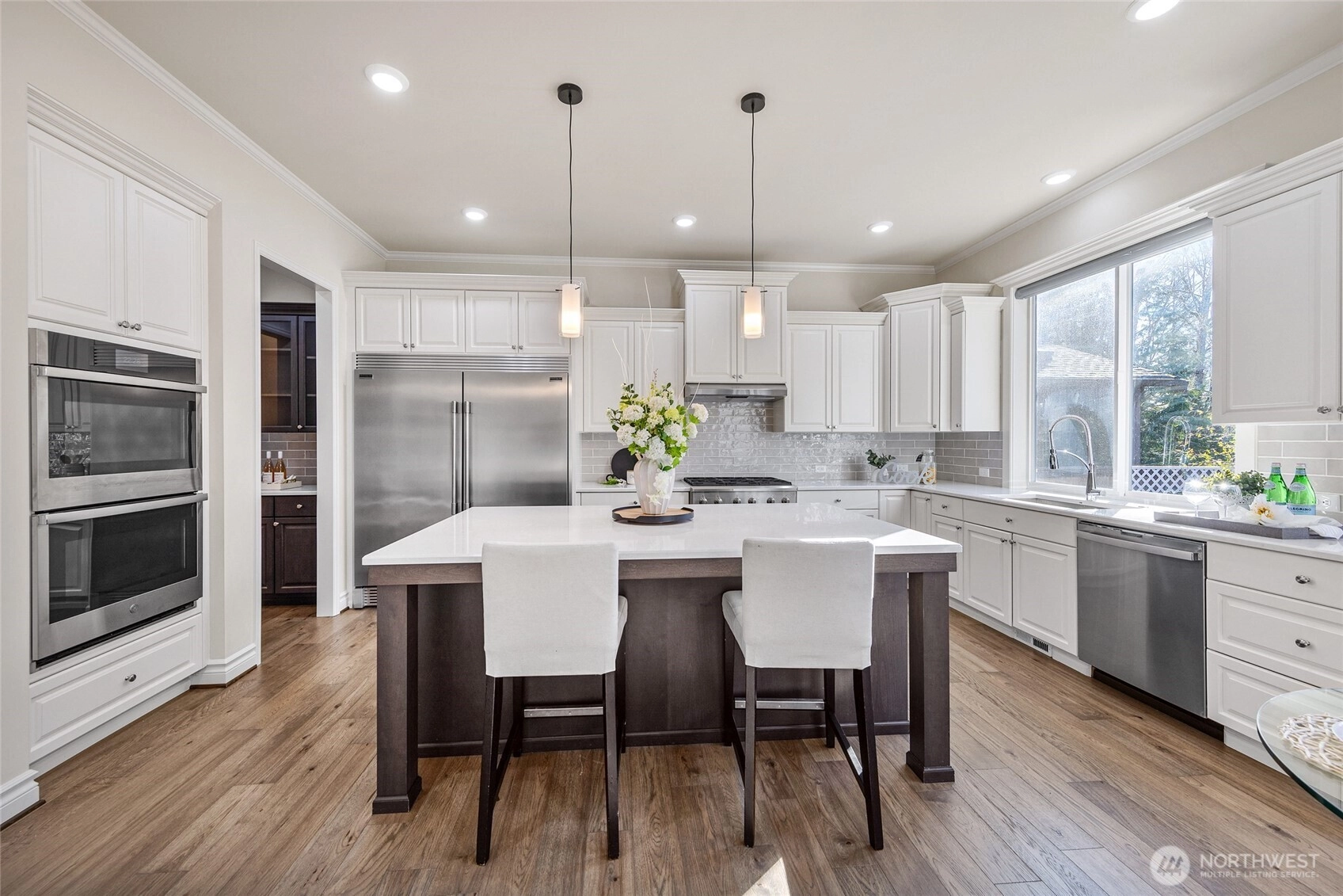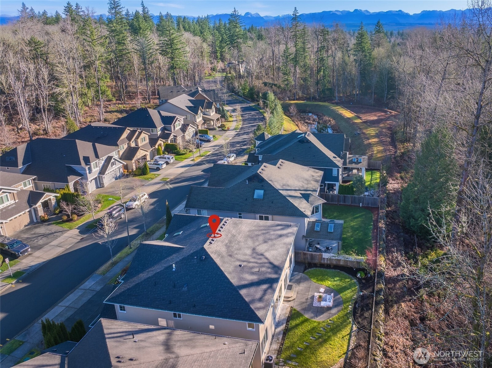 Nestled in a quiet and peaceful neighborhood, this William Buchan home is a perfect blend of modern luxury and suburban charm. Open-concept layout effortlessly connects the south facing, sun-drenched living, dining, and kitchen areas. Gourmet kitchen features high-end appliances, stylish cabinetry, quartz countertops, butler's pantry and huge center island - great for entertaining! Luxurious primary suite on upper level boasts spacious bedroom, spa-like bath with soaking tub and separate shower, and large walk-in closet. Enjoy a movie night or game day in the versatile bonus room. Private office on main floor is perfect for work from home. Guest suite on main floor is ideal for visitors or multi-generation living. Large patio facing serene wooded area: perfect for outdoor relaxation. Tankless hot water, central A/C, fully-fenced back yard. Parks, trails, playgrounds, sports field and Aldarra Golf Club nearby. Highly-rated Issaquah Schools. Suburban living at its finest!