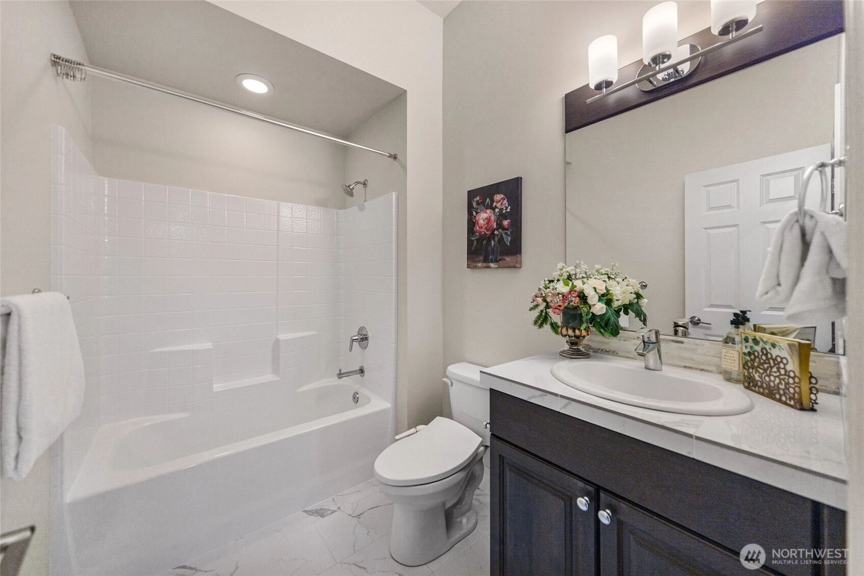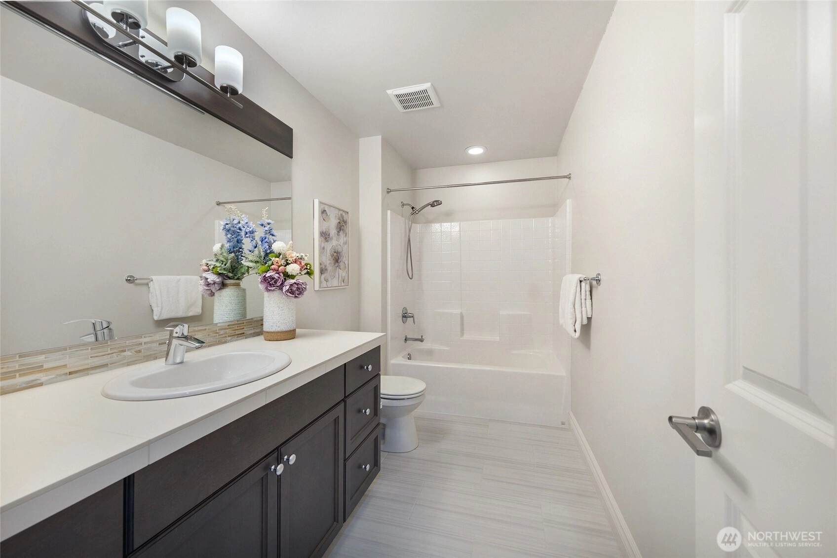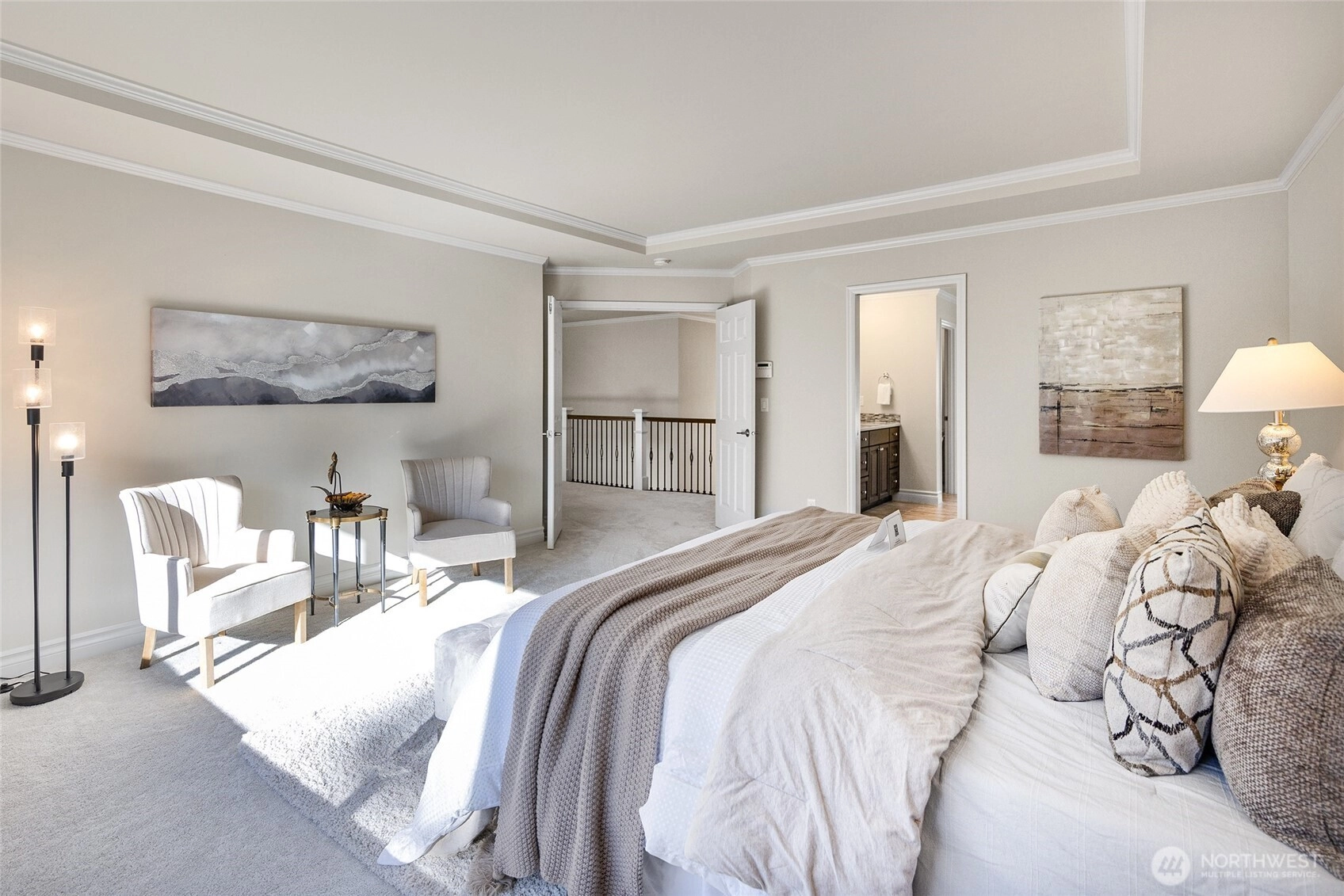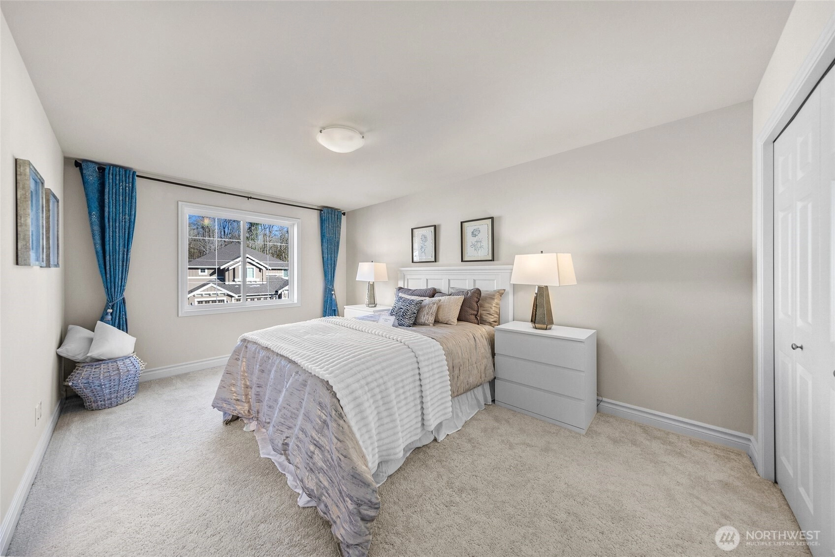 Nestled in a quiet and peaceful neighborhood, this William Buchan home is a perfect blend of modern luxury and suburban charm. Open-concept layout effortlessly connects the south facing, sun-drenched living, dining, and kitchen areas. Gourmet kitchen features high-end appliances, stylish cabinetry, quartz countertops, butler's pantry and huge center island - great for entertaining! Luxurious primary suite on upper level boasts spacious bedroom, spa-like bath with soaking tub and separate shower, and large walk-in closet. Enjoy a movie night or game day in the versatile bonus room. Private office on main floor is perfect for work from home. Guest suite on main floor is ideal for visitors or multi-generation living. Large patio facing serene wooded area: perfect for outdoor relaxation. Tankless hot water, central A/C, fully-fenced back yard. Parks, trails, playgrounds, sports field and Aldarra Golf Club nearby. Highly-rated Issaquah Schools. Suburban living at its finest!