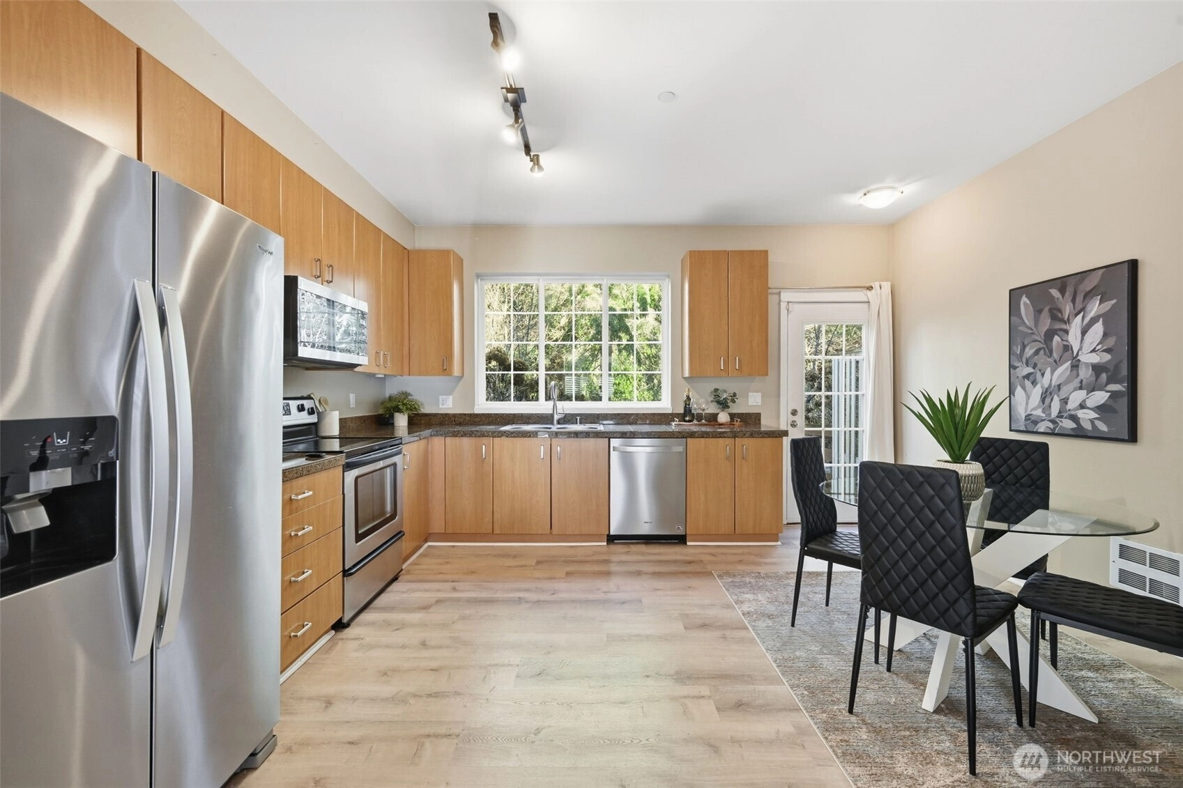 Welcome to Nature’s Walk at Redmond Ridge, a highly sought-after community known for its trails, award winning schools, and neighborhood feel. This well-appointed 2 bedroom, 2 full bath home spans 1,120 SF, featuring an open-concept floor plan that perfectly balances style and functionality. Recent updates include luxury vinyl flooring, plush new carpeting throughout and a new water heater. The heart of the home is a spacious kitchen equipped with stainless-steel appliances and ample cabinetry, flowing effortlessly into the dining and living areas. The primary suite serves as a true retreat, featuring an en-suite bath and views of the lush greenbelt. Step outside to a fully fenced private backyard offering rare privacy and a serene natural setting. Two parking spaces, an oversized detached garage plus an additional designated parking right out front. Conveniently located, just steps to Rosa Parks Elementary, parks and trails. With no rental cap, this property also presents an excellent investment opportunity close to major employers such as Microsoft and SpaceX.