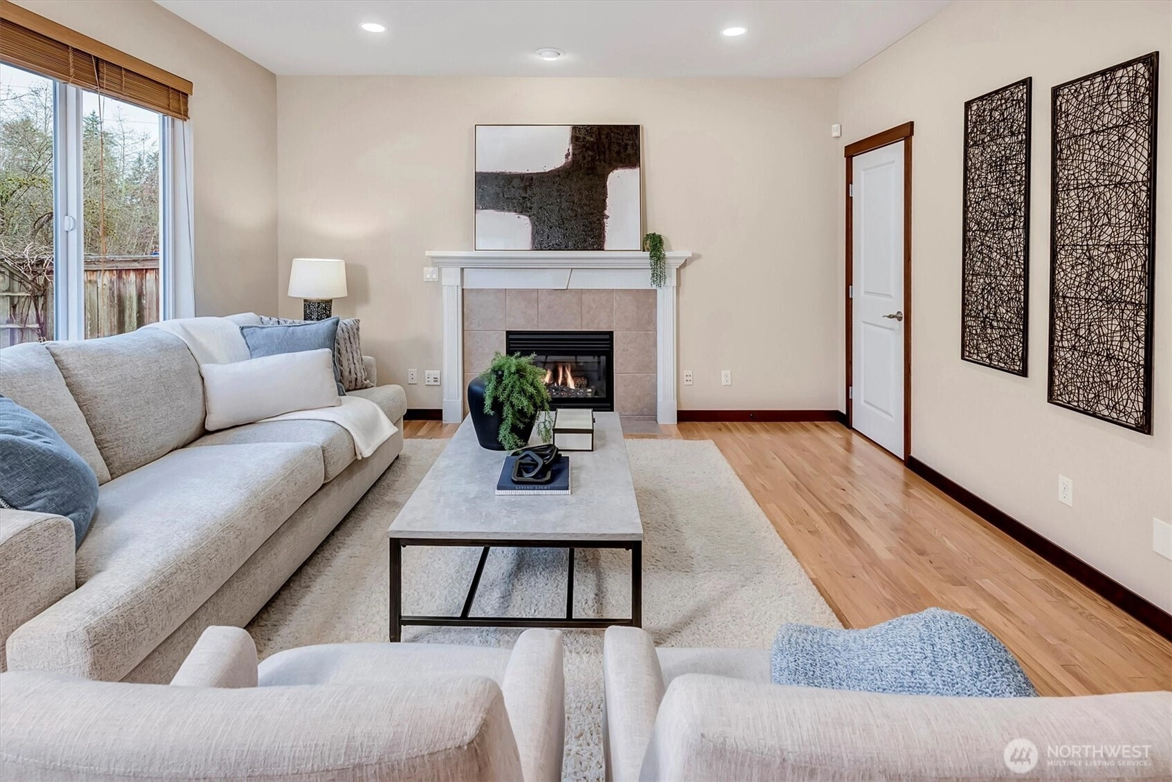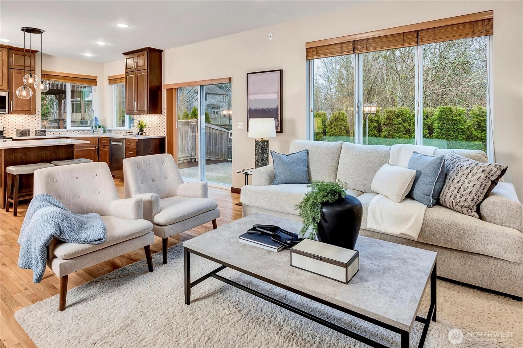 Welcome to this beautifully refreshed Smart Home in the highly sought-after Mill Creek Terrace community. Thoughtfully designed and move-in ready, this residence blends modern luxury with everyday convenience. The centerpiece is a fully renovated, open-concept chef’s kitchen featuring gorgeous quartzite countertops, custom cabinetry with pull-out organization, and new premium appliance suite by Bosch and LG. The freshly painted interior feels bright and contemporary, accented by new contemporary door handles, custom trim, and high-end blinds throughout, including blackout blinds. Enjoy three spacious bedrooms plus a versatile den or optional fourth bedroom, featuring new hardwood flooring, perfect for a professional remote work setup or guest space. The home is fully equipped with a sophisticated smart home and security ecosystem, including a whole-home security system with hardwired cameras, Ring Doorbell, smart lighting, and a MyQ enabled garage with an integrated camera. Movie nights are complete with a pre-wired 5.1 surround sound system. Outside, a private backyard with an extended concrete patio is the perfect setting for morning coffee or summer dinners set to music via hardwired outdoor speakers. The home remains comfortable year-round with central AC. Critical infrastructure upgrades include a new high-capacity water heater, new gutters, and an optimized garage with ceiling storage and professional paint. Don’t miss this tech-forward, turnkey home!