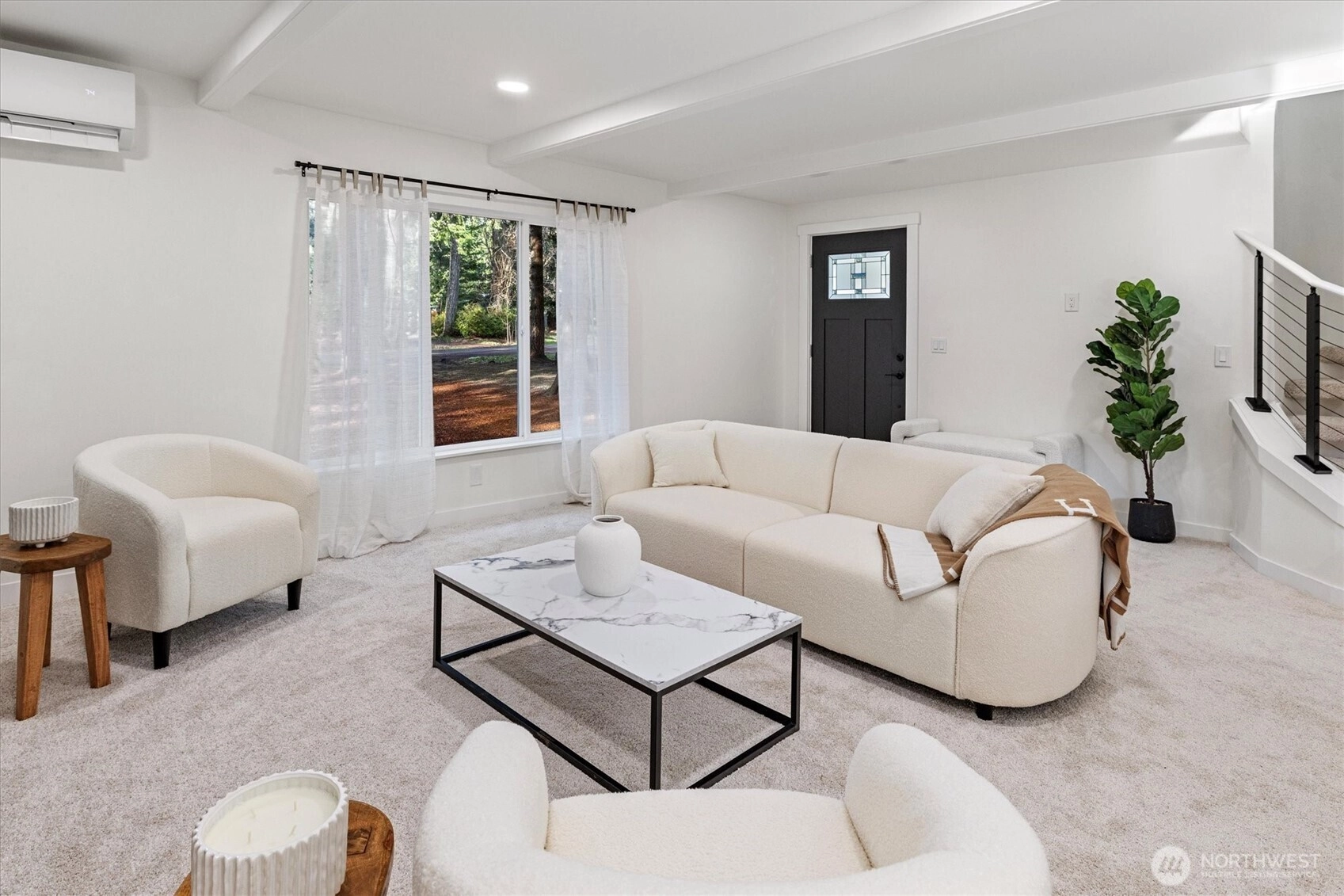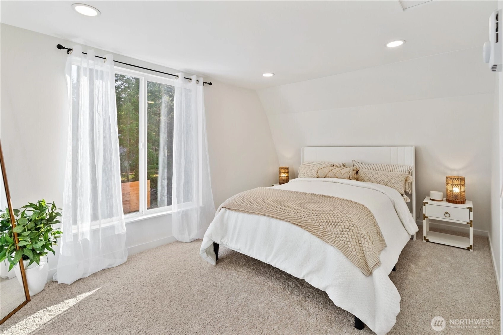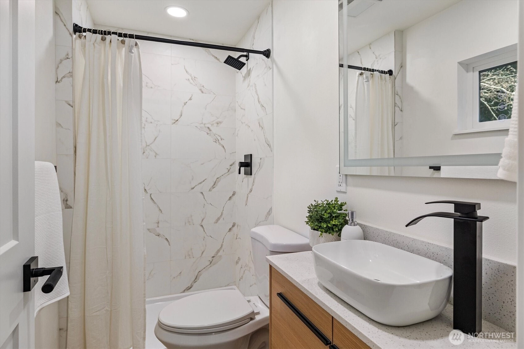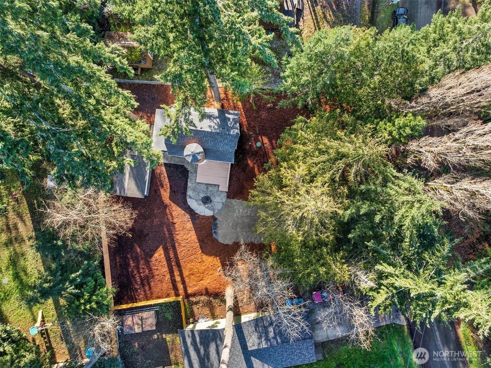 Charming, fully updated home tucked away in Lakebay, offering privacy, style, and modern comfort. A long driveway lined with mature trees leads you to this peaceful retreat. Inside, the open-concept layout features great sightlines and an easy flow for everyday living and entertaining. The living room showcases new flooring, tray ceiling details, a cozy electric fireplace, and a striking dark accent wall. The modern kitchen is beautifully designed with two-tone white and oak cabinetry, farmhouse sink, stainless steel appliances, quartz countertops, subway tile backsplash, and a large center island with eating bar. The main-level full bath features stylish black hardware, a tiled shower surround, and a modern vanity. A spiral staircase leads to the upper-level bedrooms and a ¾ bath with a walk-in shower and tile surround. One bedroom opens to a private upper-level deck through a sliding door. Recent upgrades include a new roof, new windows, new interior and exterior paint, new trim, updated interior doors and fixtures, luxury vinyl plank flooring, a new mini-split AC system in the primary bedroom and living room, and new fencing. The spacious lot offers a deck, patio with built-in fire pit, and a storage shed—perfect for enjoying the outdoors year-round.