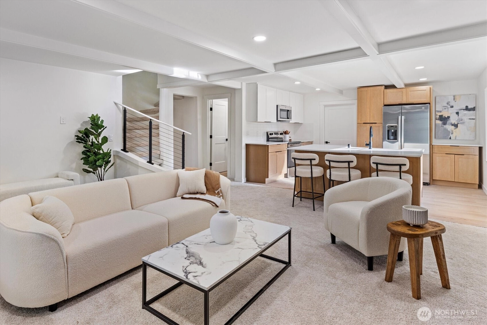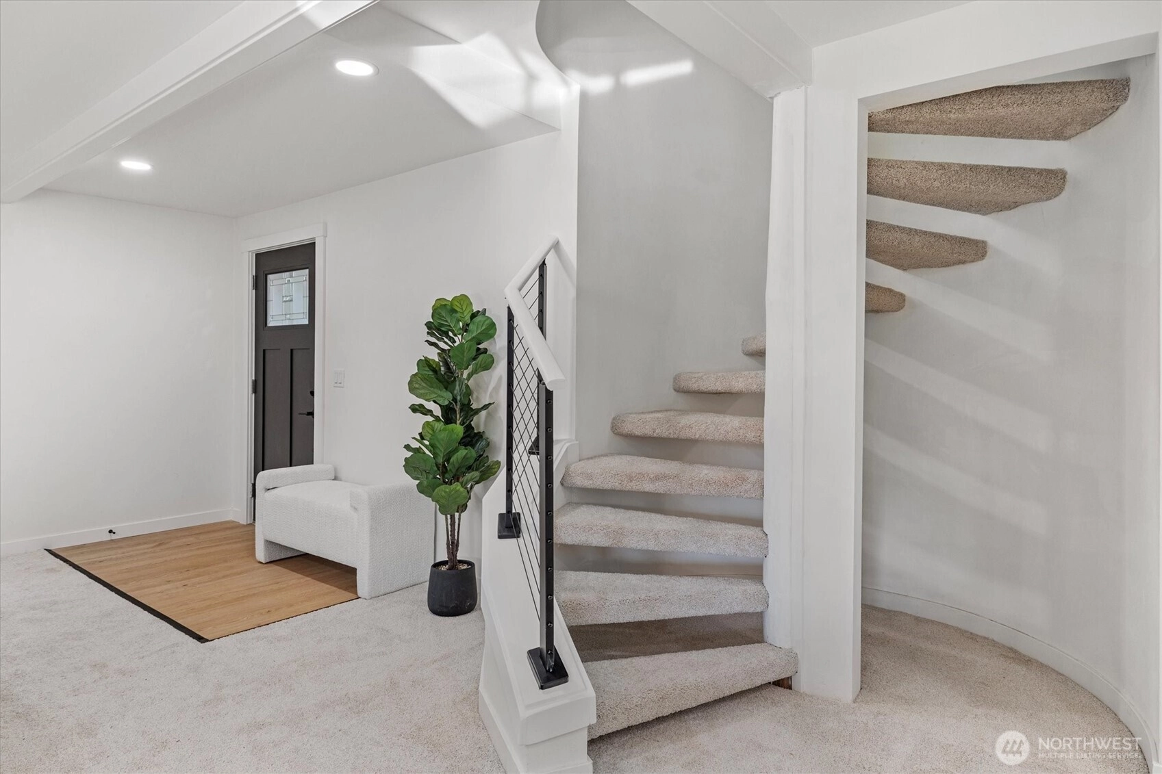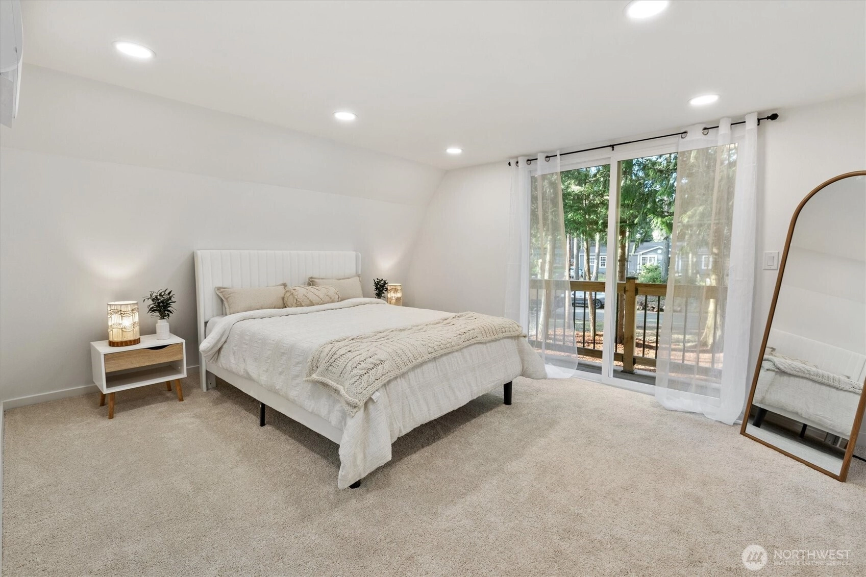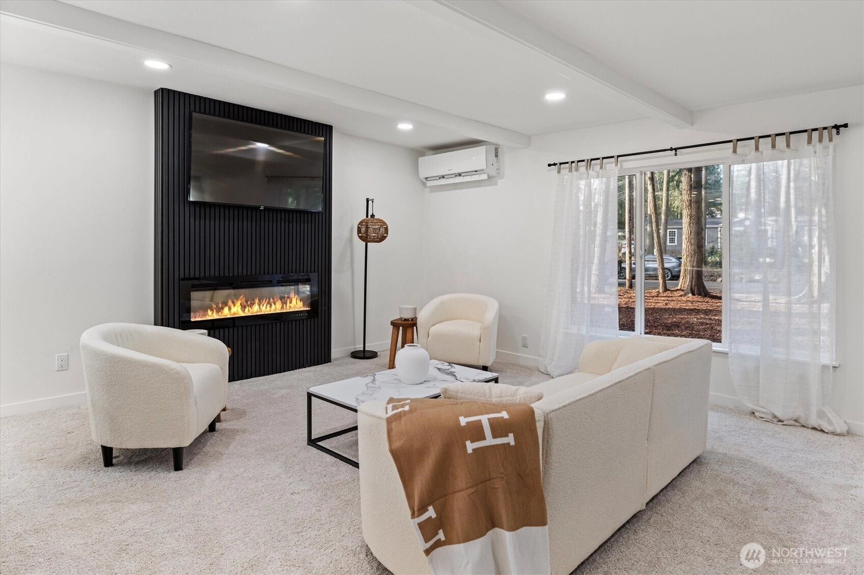 Charming, fully updated home tucked away in Lakebay, offering privacy, style, and modern comfort. A long driveway lined with mature trees leads you to this peaceful retreat. Inside, the open-concept layout features great sightlines and an easy flow for everyday living and entertaining. The living room showcases new flooring, tray ceiling details, a cozy electric fireplace, and a striking dark accent wall. The modern kitchen is beautifully designed with two-tone white and oak cabinetry, farmhouse sink, stainless steel appliances, quartz countertops, subway tile backsplash, and a large center island with eating bar. The main-level full bath features stylish black hardware, a tiled shower surround, and a modern vanity. A spiral staircase leads to the upper-level bedrooms and a ¾ bath with a walk-in shower and tile surround. One bedroom opens to a private upper-level deck through a sliding door. Recent upgrades include a new roof, new windows, new interior and exterior paint, new trim, updated interior doors and fixtures, luxury vinyl plank flooring, a new mini-split AC system in the primary bedroom and living room, and new fencing. The spacious lot offers a deck, patio with built-in fire pit, and a storage shed—perfect for enjoying the outdoors year-round.