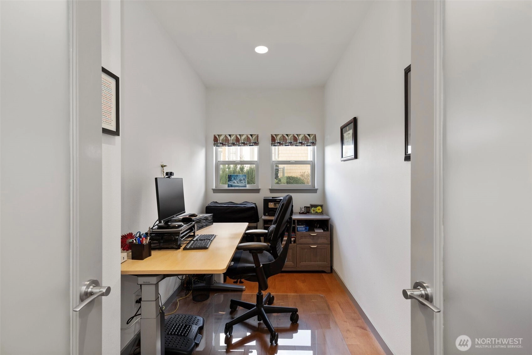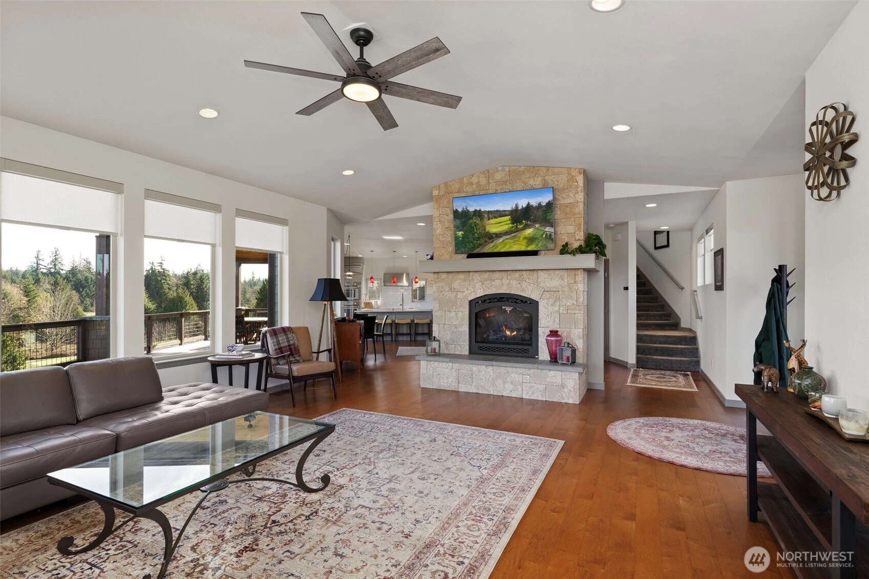 Beautifully crafted Estes-built home in the desirable White Horse neighborhood, offering privacy, Mountain and Sound views, and high-end finishes throughout. Built in 2019, this 2,383 sq ft home features 3 bedrooms, 2.5 baths, and sits on a generous .59-acre lot. Enjoy golf course living with views of the 13th hole from the covered deck—perfect for year-round enjoyment. The great room features a gas fireplace and expansive windows and doors that flood the main level with natural light and seamlessly connect indoor and outdoor living. The stunning kitchen showcases quartz countertops, custom cabinetry, high-end appliances including a steam oven, a walk-in pantry, and a built-in coffee bar. A dedicated office and exercise room add flexibility to the main level. Retreat to the spacious primary suite with a luxurious 5-piece bath. Three-car garage provides ample parking and storage. Extensive, thoughtfully designed landscaping enhances the curb appeal and outdoor spaces. Just minutes from the Kingston Ferry for easy commuting to Seattle, this home offers the perfect blend of peaceful golf course living and convenient access to the Puget Sound lifestyle.