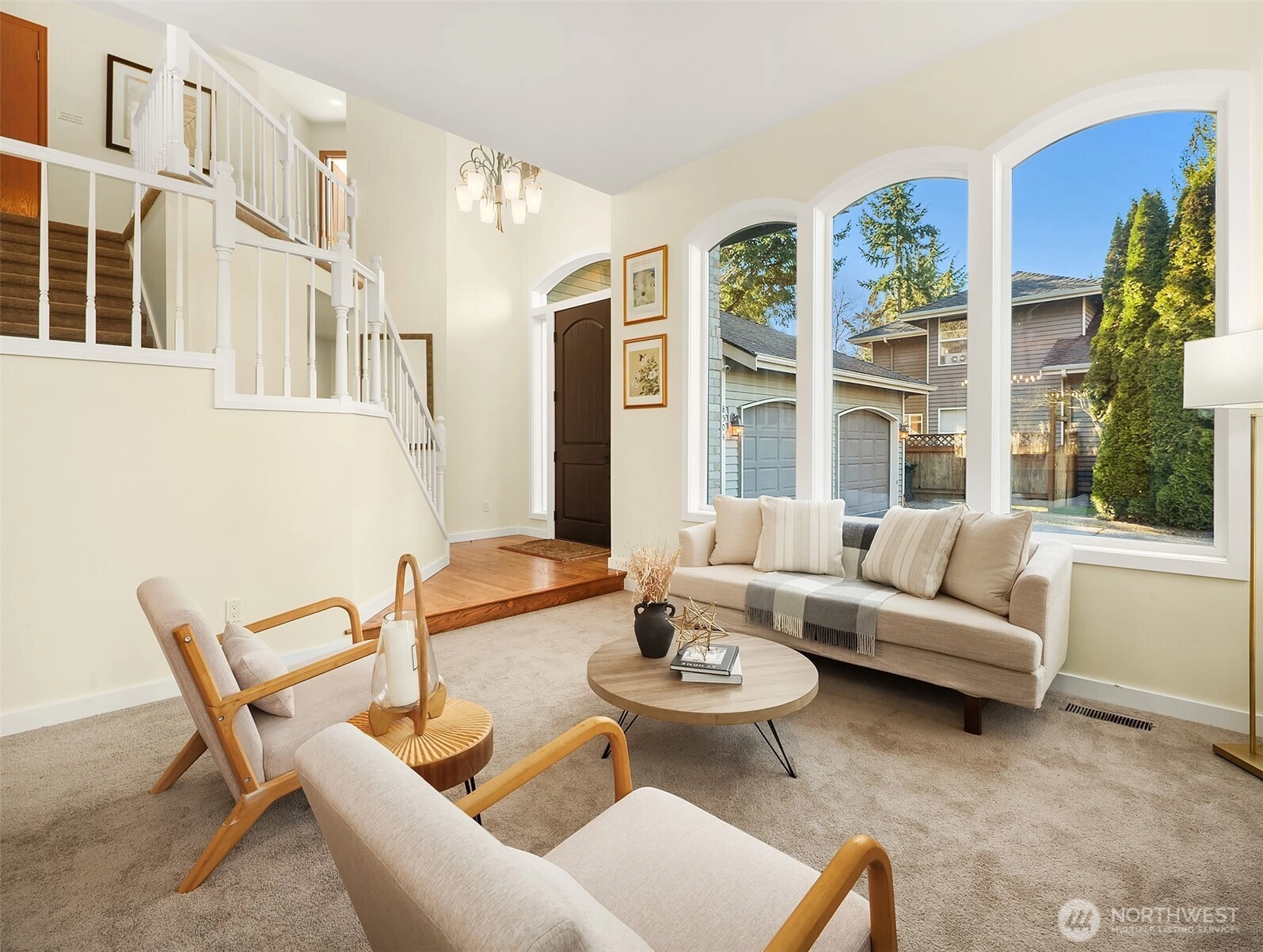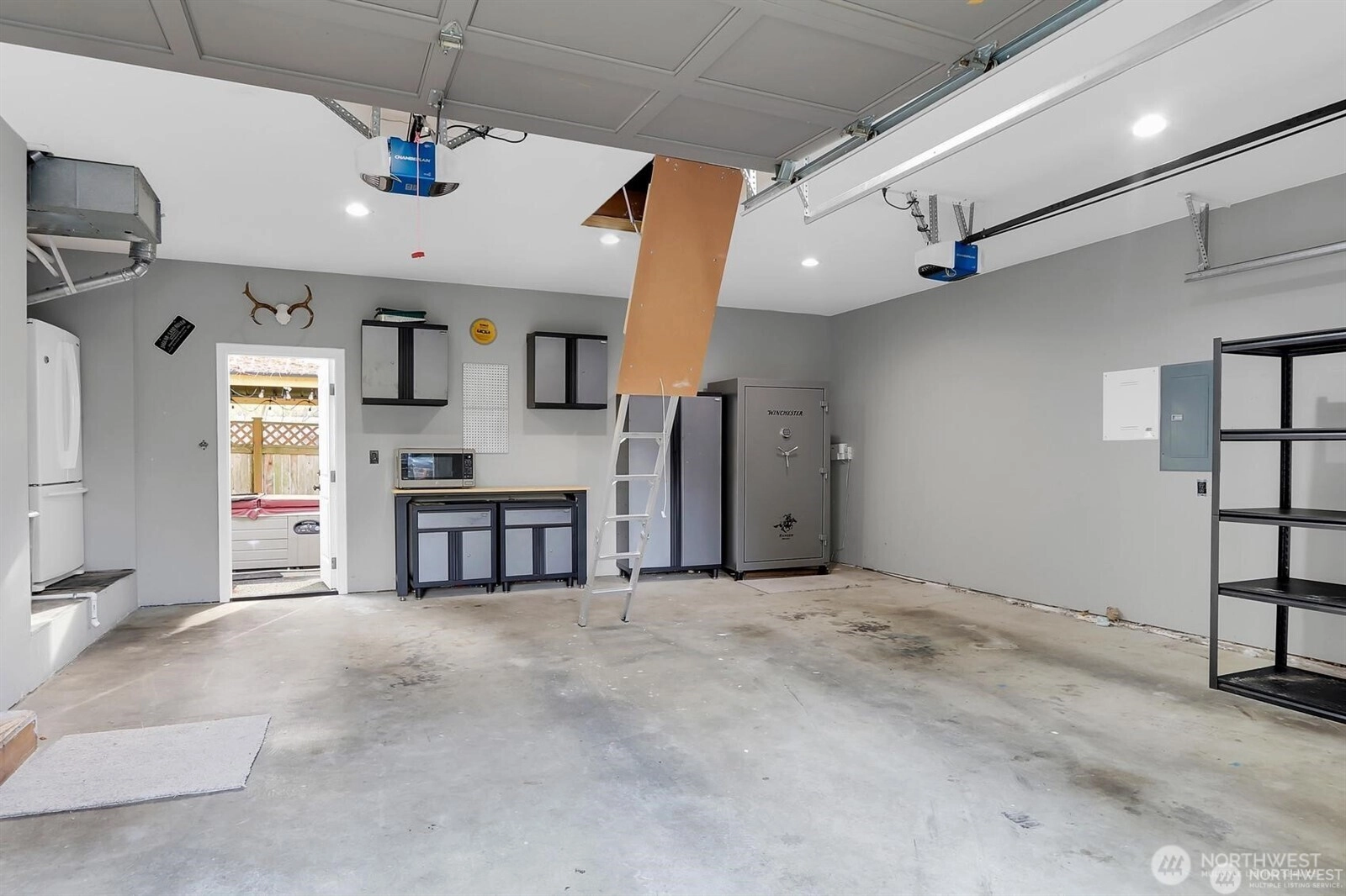 Tucked away at the end of a charming cul-de-sac, this 4-bedroom home welcomes you with a grand two-story entry. The vaulted great room features an array of arched windows that flood the space with natural light and style. The kitchen is designed for entertaining, with a center island hosting a built-in range and counter seating, updated cabinetry, and an open layout to the family room. The main-floor bedroom is conveniently located across the hall from the updated ¾ bathroom, making it an ideal home office or a comfortable bedroom option for those seeking stair-free living. Step outside the back door onto a peaceful back deck, an inviting retreat for quiet mornings or lively gatherings. The primary suite is a true escape, featuring a skylight, generous closet space, and a well-appointed five-piece bath. The expansive two-car garage includes a workshop area and a pull-down ladder for abundant overhead storage. Outside is a detached shed, cozy gas fireplace and a covered gazebo- already wired for a hot tub!