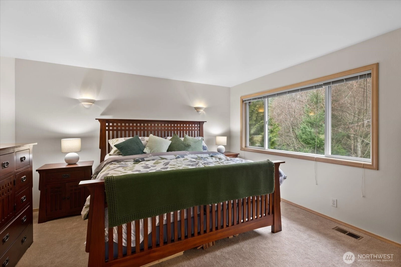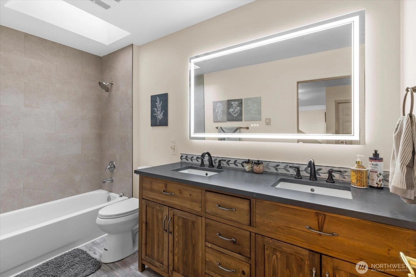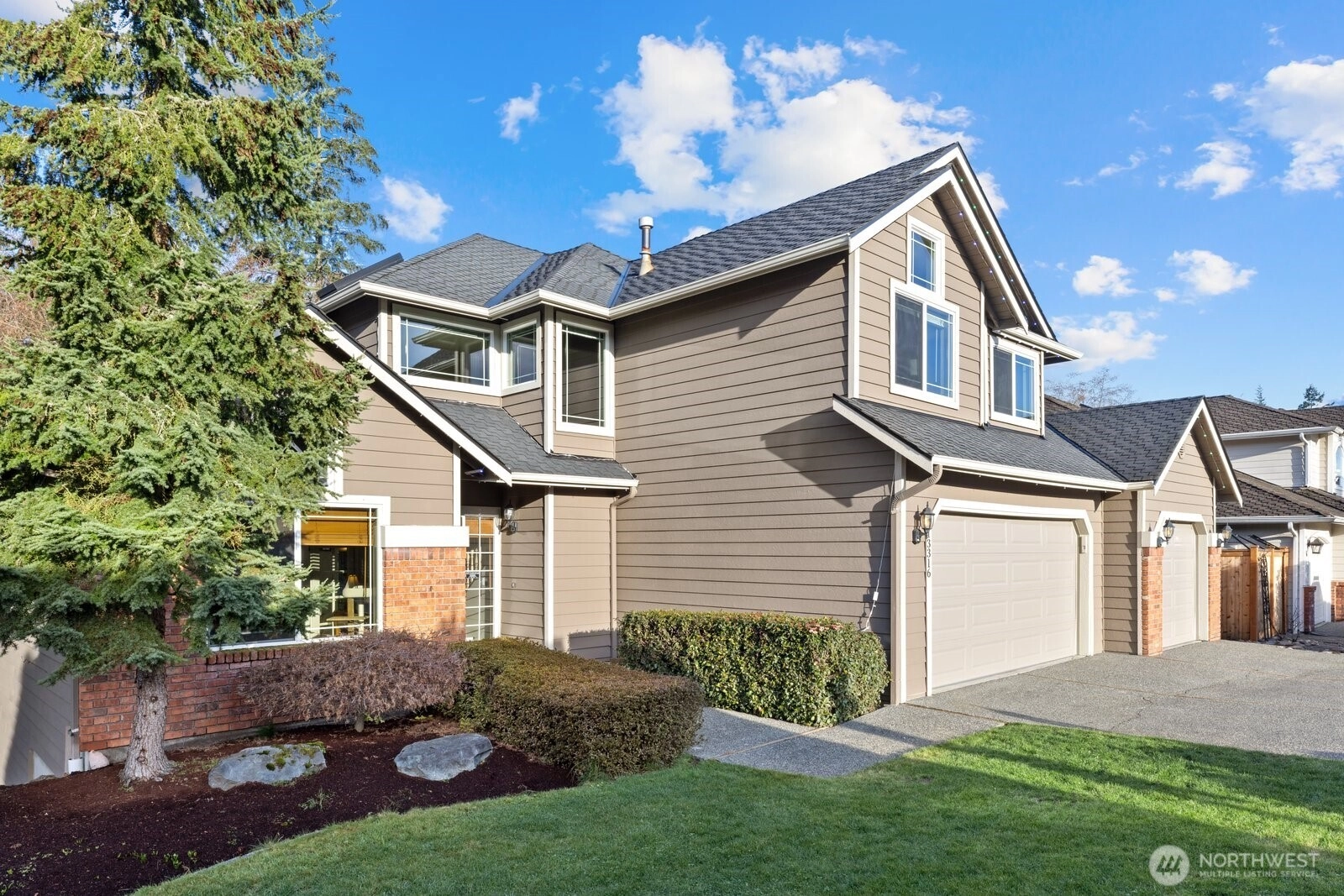 Located in the highly sought-after Faire Harbour neighborhood, this beautifully designed home offers space, privacy, and timeless Northwest charm. Step inside to soaring ceilings and beautiful oak hardwood floors that flow throughout the main living spaces. The open kitchen connects seamlessly to the elegant family room with vaulted ceilings and a cozy brick fireplace, creating the perfect setting for everyday living and entertaining. Double doors lead to a brand-new Trex deck ($27,000) overlooking a peaceful greenbelt — ideal for private BBQs, morning coffee, or relaxing evenings surrounded by nature. The main floor also features a dedicated home office, plus formal living and dining rooms, offering both versatility and refined entertaining space. Upstairs you’ll find three bedrooms, highlighted by a spacious primary suite with a fully updated, spa-inspired bathroom and walk-in closet. The lower level boasts an expansive, fully soundproofed bonus room with tall ceilings — (currently used as a “House-Cover Band” practice room) perfect as a media room, creative space, or potential ADU. Room for two additional bedrooms or “Safe room” or wine cellar. A spacious three-car garage completes the package. Backed by tranquil greenbelt for ultimate privacy, this home has it all.