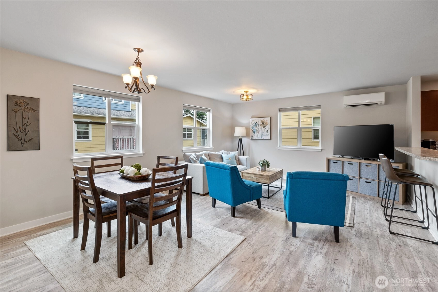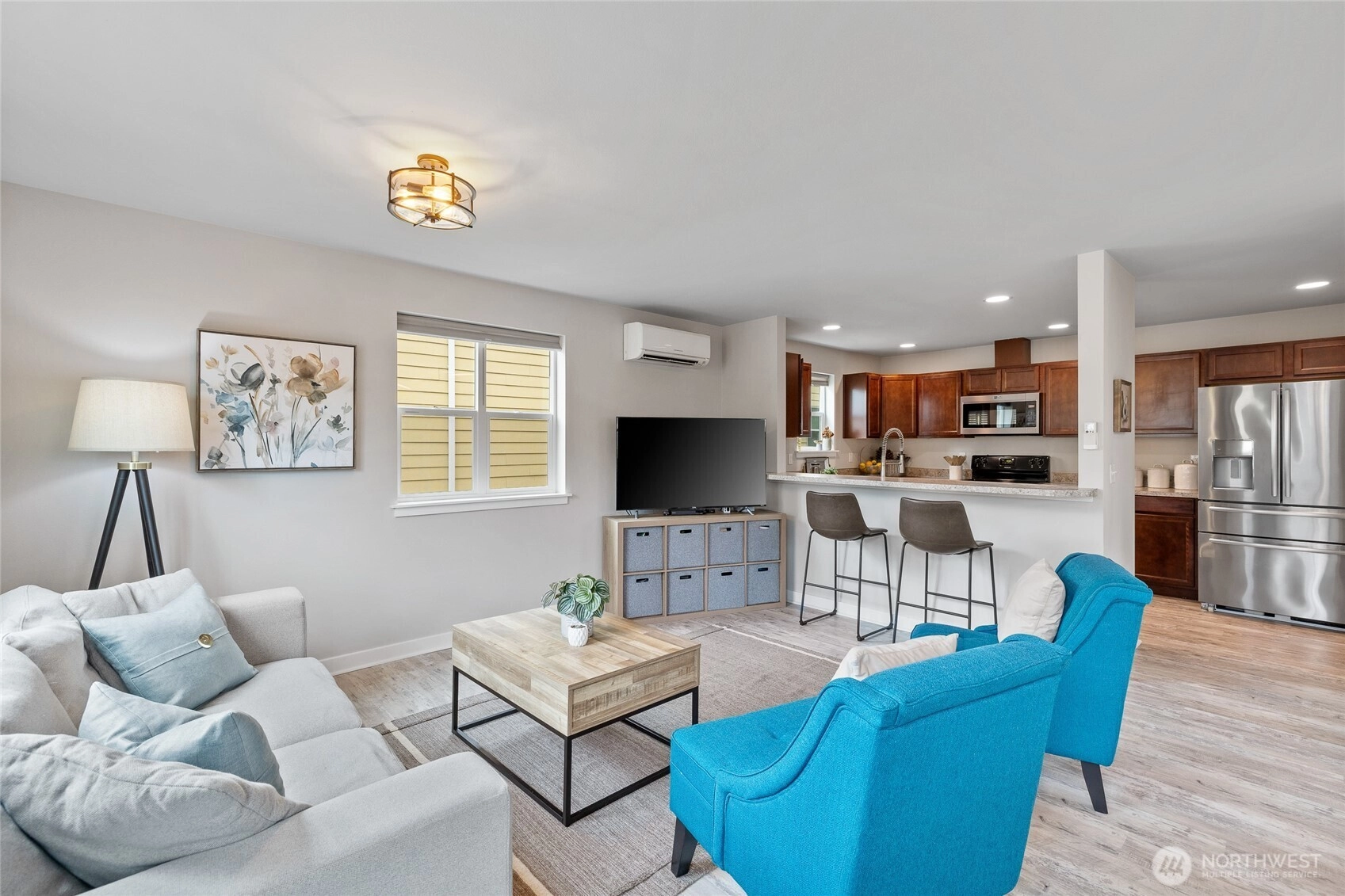 A Delightful Downtown Townhouse that Lives Large ~ Thoughtfully Designed, Stylish & Filled with Natural Light, the seemlessly Integrated Main Floor Living space will become your welcome retreat. The Spacious Kitchen is Well Appointed with Loads of Cabinets, Counterspace, Breakfast Bar, Pantry & Lovely Stainless Appliances. Upstairs finds the Primary Bedroom w/En-suite & Two Additional Bedrooms. With Fresh Paint & Tastefully Updated Fixtures, this home represents a true Move-in-Ready Experience. In the Summer stay Cool Inside with the Heatpump; head just outside your front door for an expansive lawn & room for plenty of fun! Large 2-car garage w/storage. Conveniently close to Shopping, Library, Parks & Playfields, Plus Easy Commuting & VERY LOW DUES, $136 NO ASSESSMENTS!