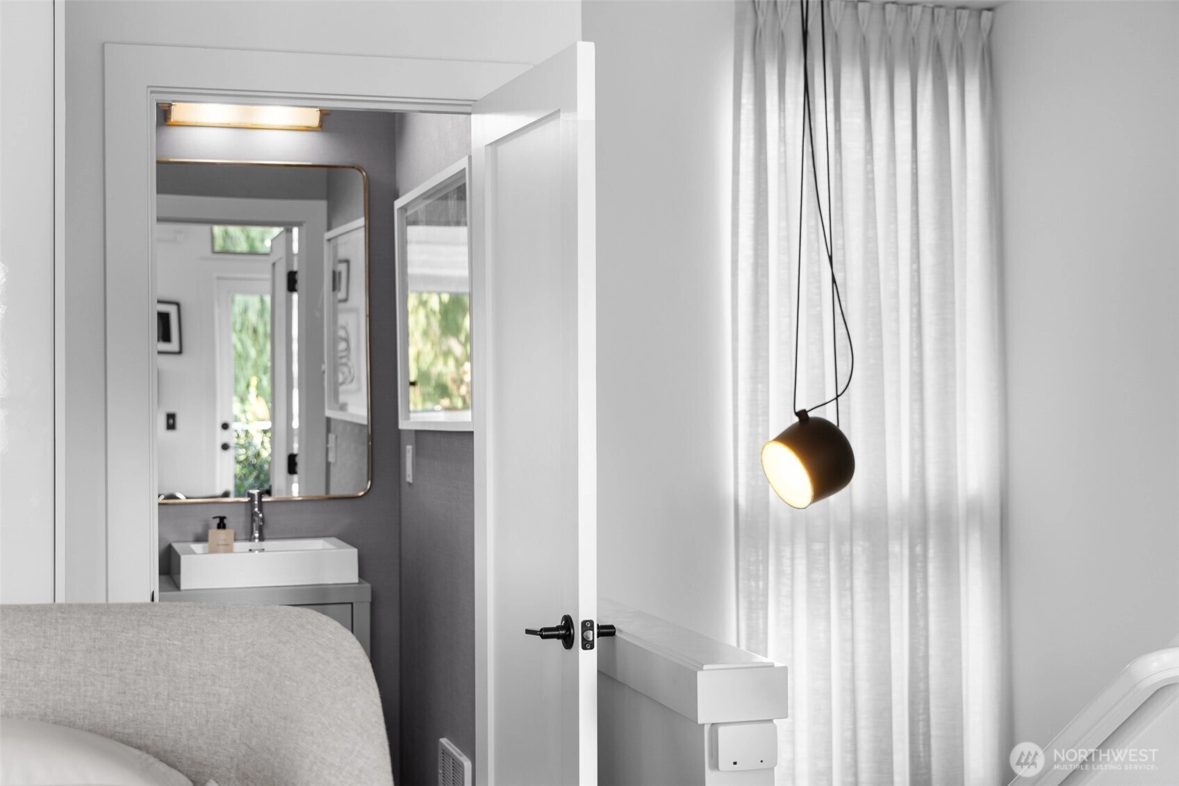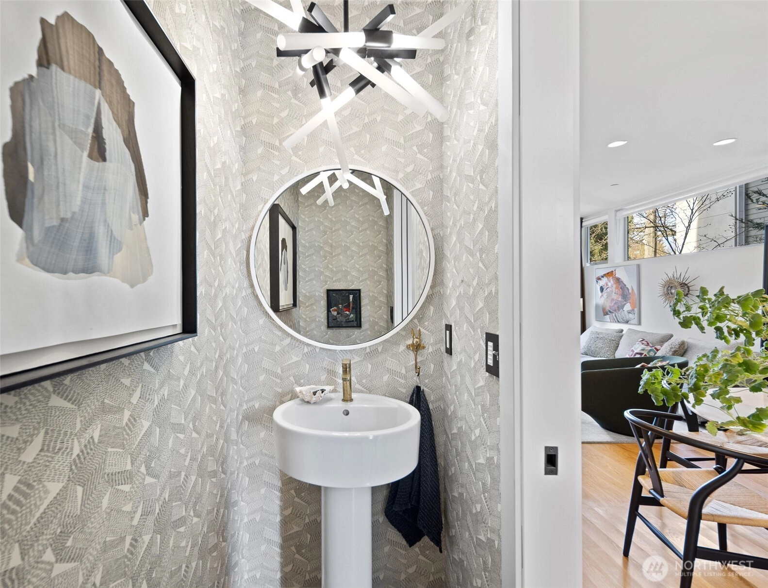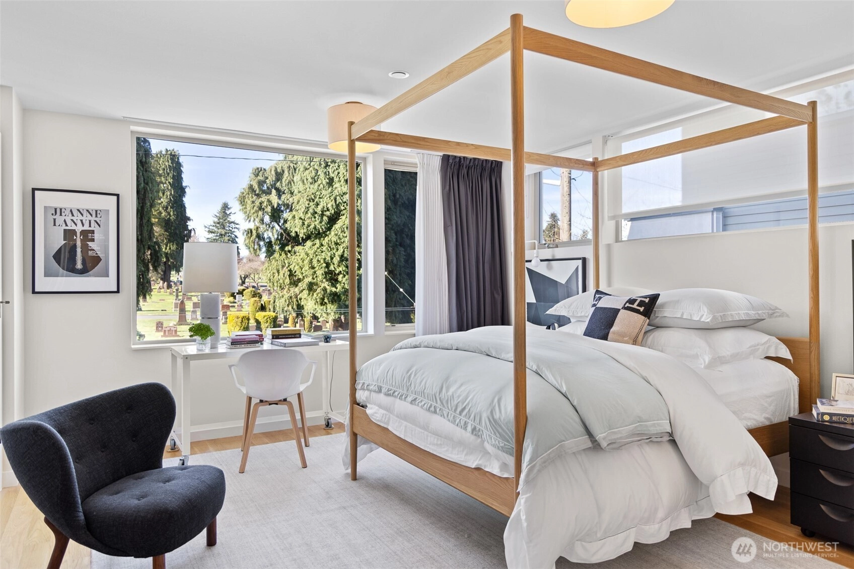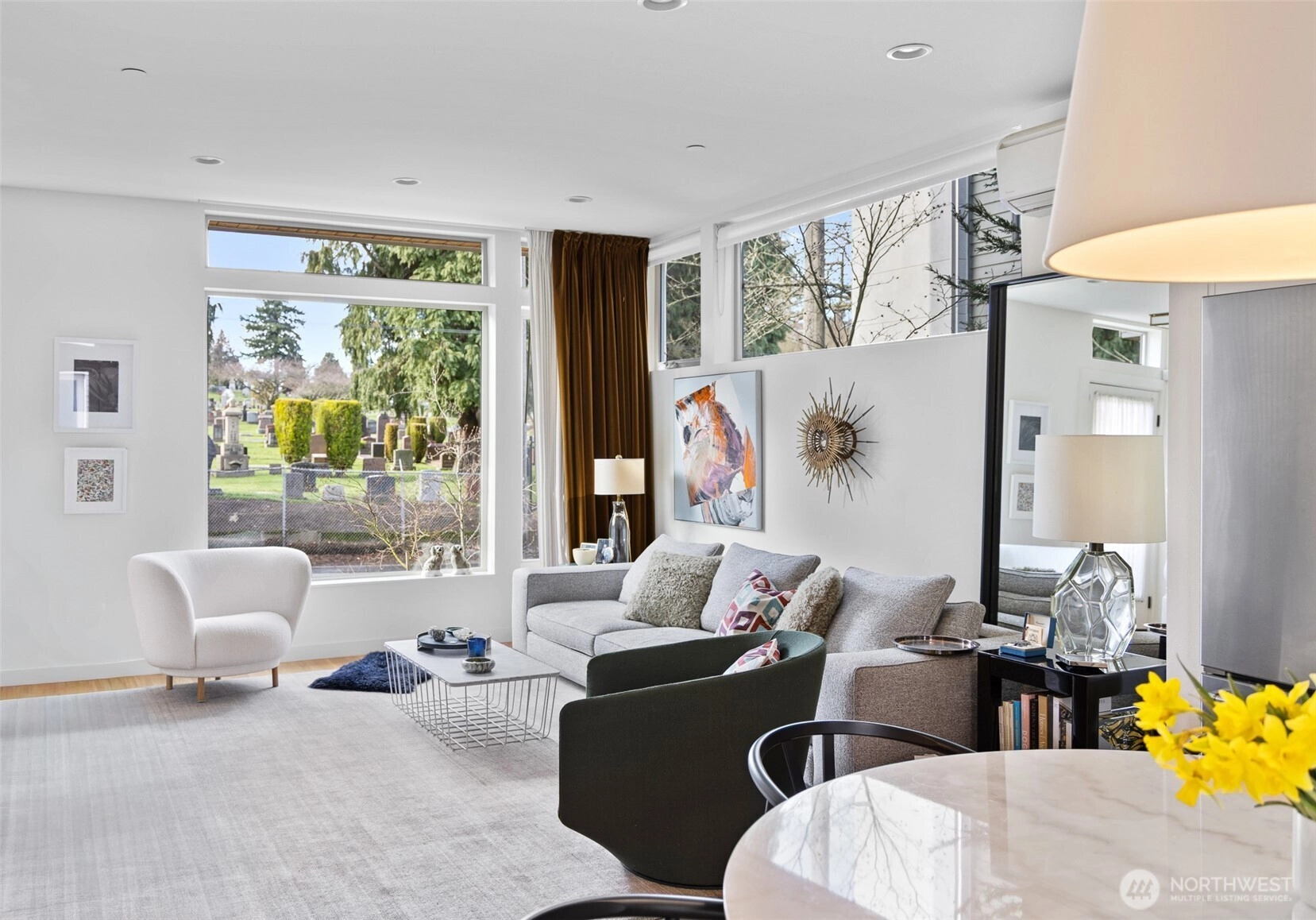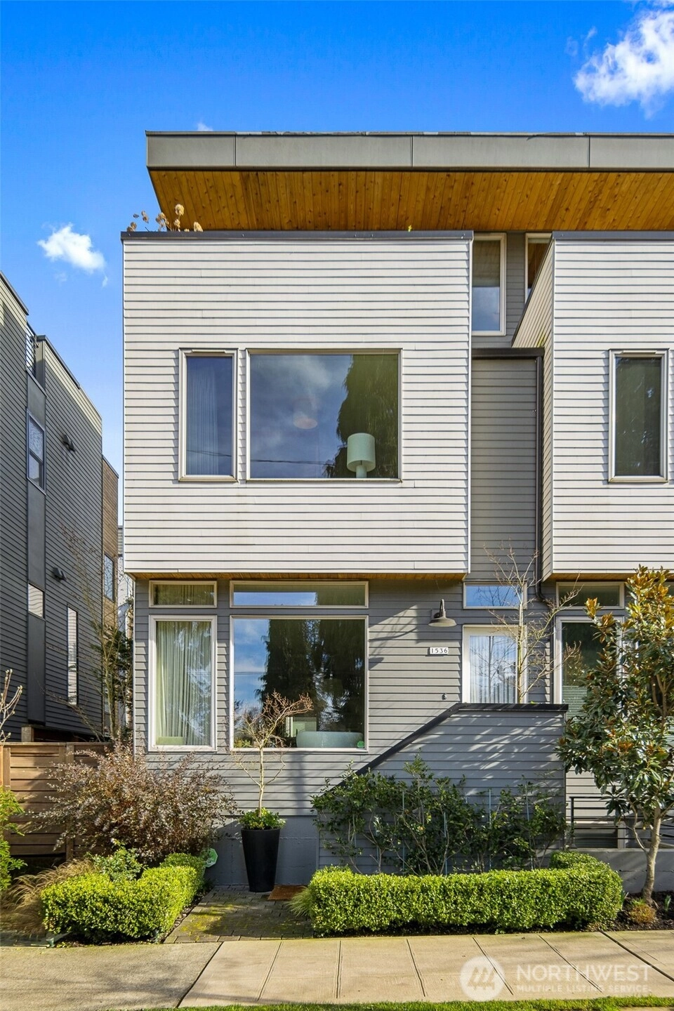 Tailored three bedroom townhouse enclave at the very crest of North Capitol Hill. This 2019 build shines above clipped boxwood hedges and specimen trees. With a western entry, this jewel box of a home with panoramic windows is framed by custom draperies, adding sophistication to the open-concept plan. True hardwoods throughout and bespoke art lighting set the tone for a residence impeccably tailored. Well-sized kitchen with commercial gas cooking to serve any chef's needs is anchored by artful pendant with circular dining table. The generous, adjacent living space, centers the home. Bathrooms on each floor, of course, accentuated by custom wallpaper and custom lighting. The HVAC keeps everyone comfortable throughout the year. A shared courtyard, with seating and potted plants, beckons for al fresco meals. Lower level is served by radiant heating, which makes for a sweet guest suite, currently used as a home office. Another bathroom and access to secured garage completes this level. Second floor awaits, with the 1st guest room ensuite. Tasteful hardwood staircase and dramatic drapery & pendant draw your eye toward the upper landing and 3rd floor primary suite. This top floor with full width balcony offers scenic views to the west over the expanse neighborhood. Generous ensuite and linen draperies adds an indulgent touch. Impeccably styled, in the heart of an established residential neighborhood & stone's throw away from Volunteer Park, vibrant Cap hill.