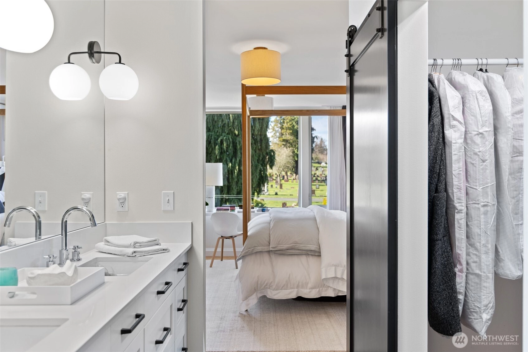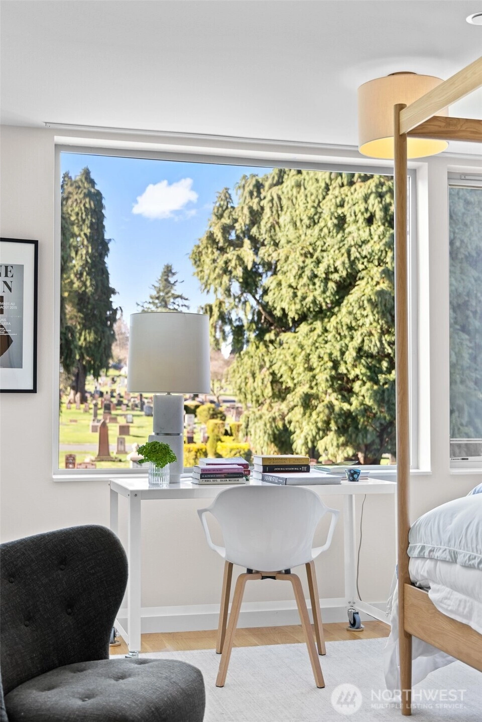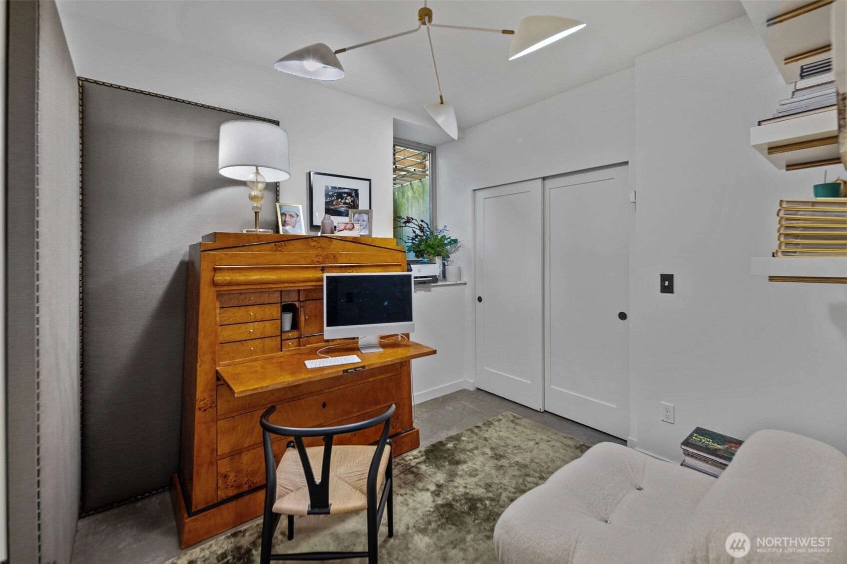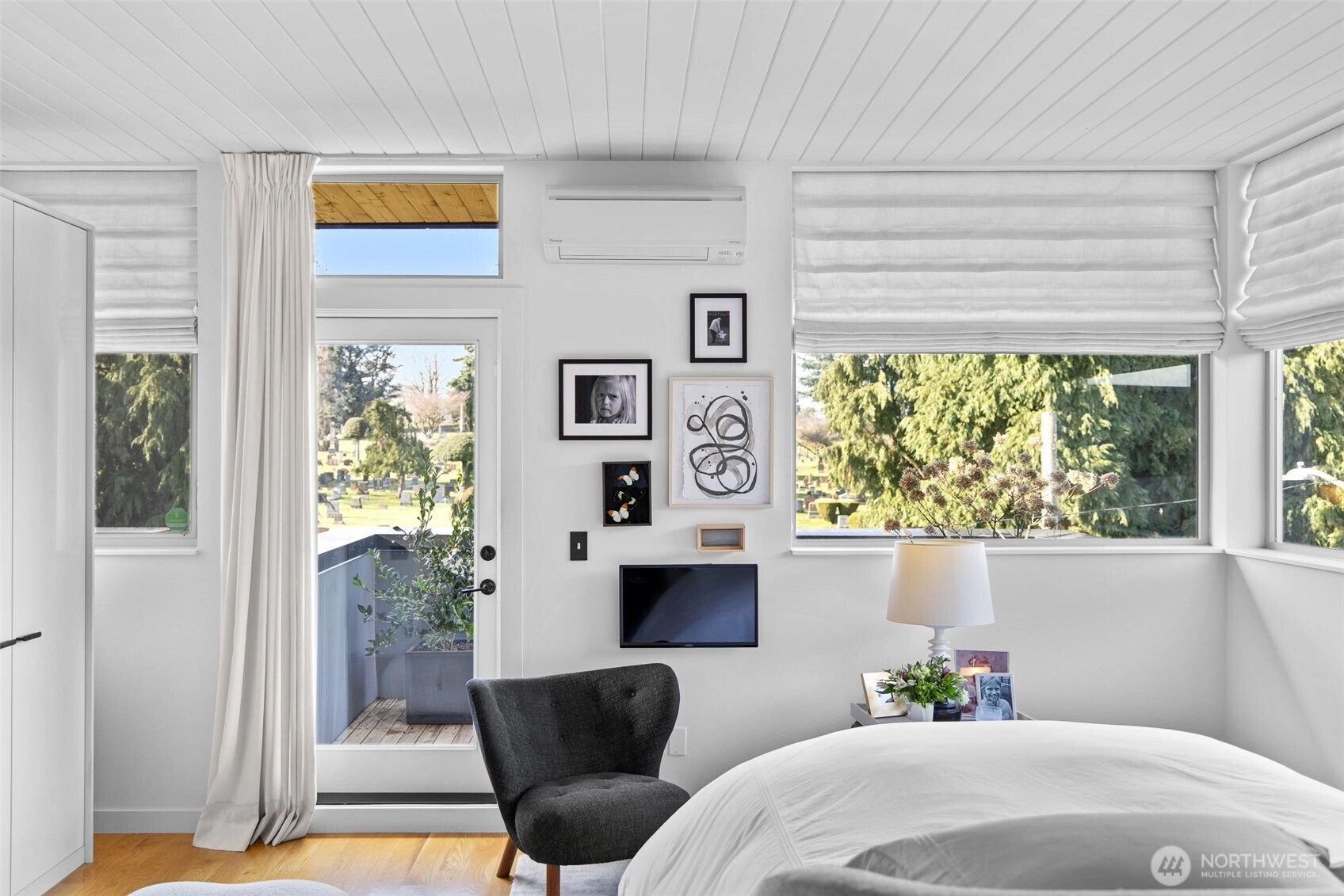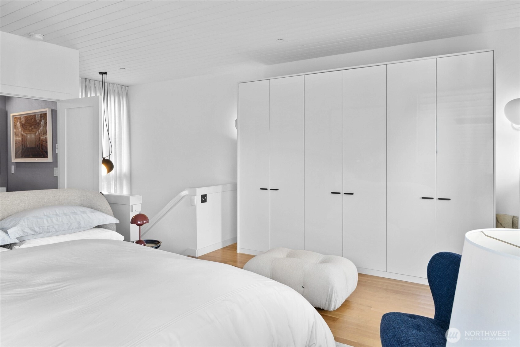 Tailored three bedroom townhouse enclave at the very crest of North Capitol Hill. This 2019 build shines above clipped boxwood hedges and specimen trees. With a western entry, this jewel box of a home with panoramic windows is framed by custom draperies, adding sophistication to the open-concept plan. True hardwoods throughout and bespoke art lighting set the tone for a residence impeccably tailored. Well-sized kitchen with commercial gas cooking to serve any chef's needs is anchored by artful pendant with circular dining table. The generous, adjacent living space, centers the home. Bathrooms on each floor, of course, accentuated by custom wallpaper and custom lighting. The HVAC keeps everyone comfortable throughout the year. A shared courtyard, with seating and potted plants, beckons for al fresco meals. Lower level is served by radiant heating, which makes for a sweet guest suite, currently used as a home office. Another bathroom and access to secured garage completes this level. Second floor awaits, with the 1st guest room ensuite. Tasteful hardwood staircase and dramatic drapery & pendant draw your eye toward the upper landing and 3rd floor primary suite. This top floor with full width balcony offers scenic views to the west over the expanse neighborhood. Generous ensuite and linen draperies adds an indulgent touch. Impeccably styled, in the heart of an established residential neighborhood & stone's throw away from Volunteer Park, vibrant Cap hill.