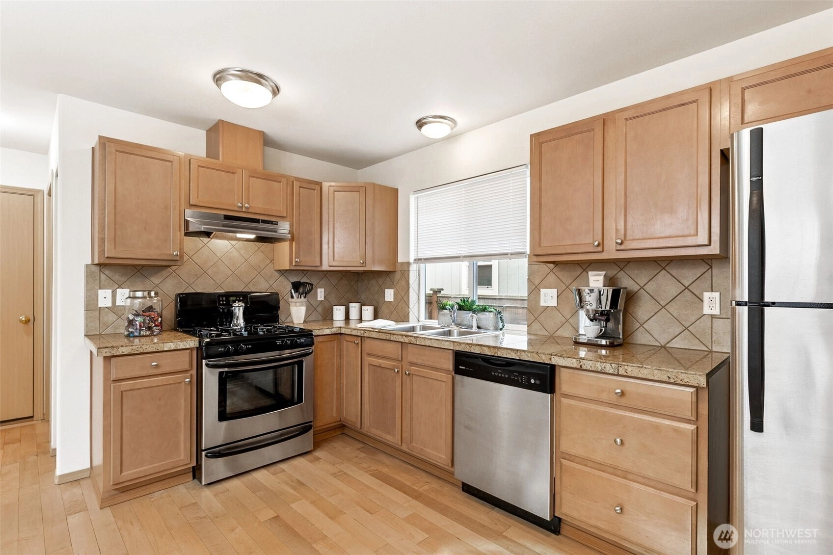 Move-in ready two-story home just blocks from restaurants and amenities. Enjoy a cozy living room with gas fireplace, spacious kitchen with eating area, and an upstairs primary suite featuring a full bath and walk-in closet. There are two additional bedrooms and a full bath upstairs. Main floor laundry room with washer and dryer included, plus a one-car garage. New carpet, fresh paint - inside and out - plus a brand new roof! Conveniently located near freeways, shopping, and the airport. This one's all ready for it's new owner. Come take a look!