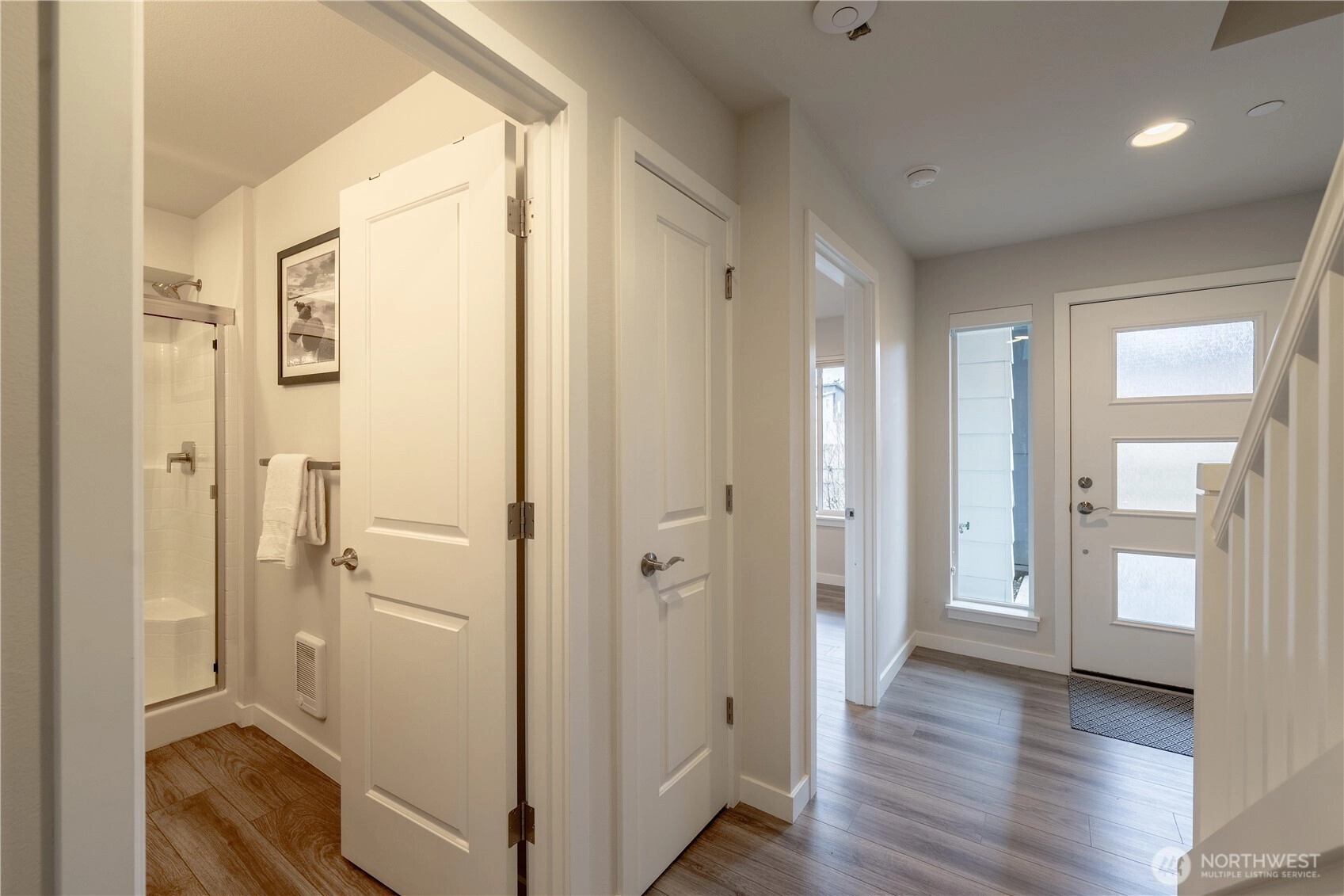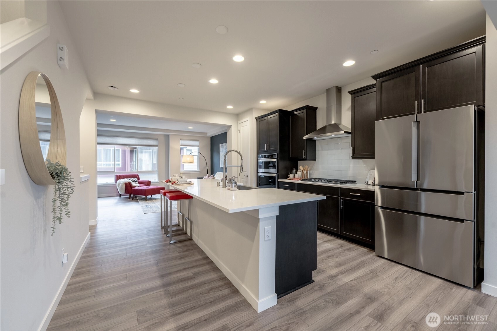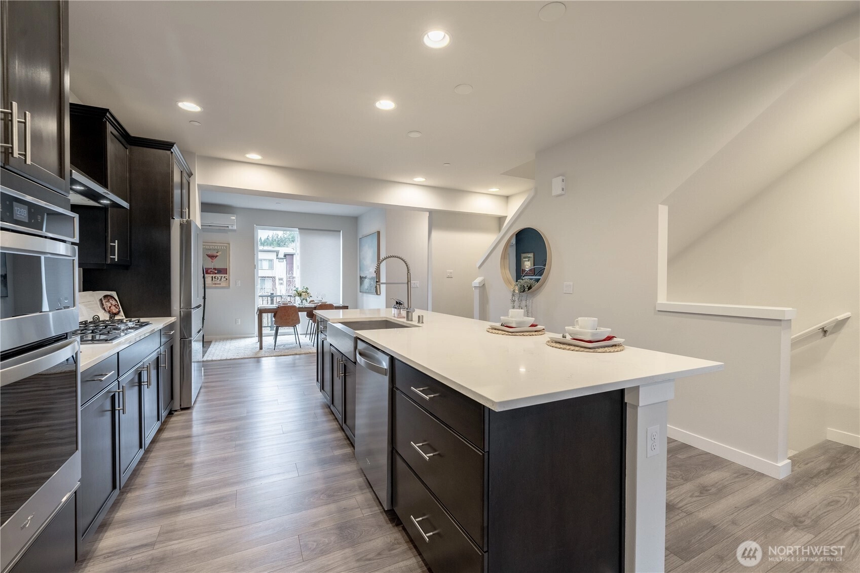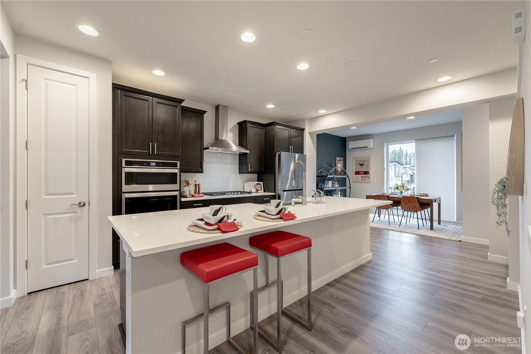 REFINED MODERN LIVING WITH TERRITORIAL VIEWS This stunning west-facing townhome, in pristine condition, borders a serene greenbelt—offering privacy, abundant natural light and a peaceful setting in a prime Bothell location. Built in 2021, it stands apart with more than $60,000 in thoughtful upgrades, high ceilings and spacious proportions rarely found in newer construction. Expansive windows illuminate the open-concept main level, highlighting hardwood/LVP floors and a beautifully appointed chef’s kitchen designed for everyday living and effortless entertaining. Generous living and dining spaces flow seamlessly, framed by tranquil greenbelt views and a private balcony extending the space outdoors. The lower level offers flexibility as a guest suite or home office with hardwood flooring and a full bath. Upstairs, the primary suite features a walk-in closet, ensuite bathroom and an extra mini-split for enhanced comfort. Additional highlights include upgraded designer finishes throughout the home, a two-car garage plus driveway parking and convenient guest parking nearby. Enjoy low-maintenance living minutes from shopping, parks and commuter routes within the quiet, well-managed Urbane Village community and the highly regarded Northshore School District. Impeccably maintained, thoughtfully designed and move-in ready—welcome home!