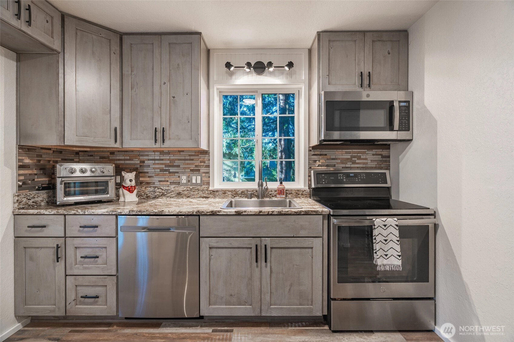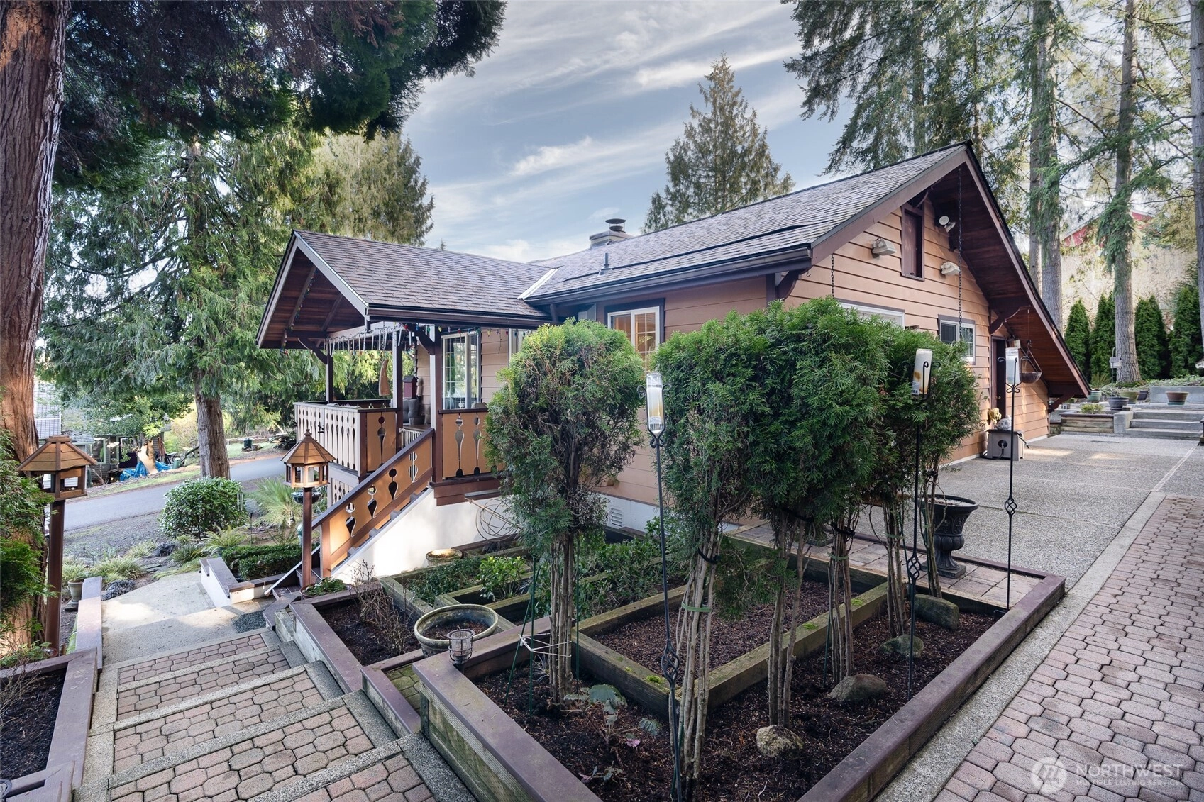 Tastefully updated move-in ready, 3-bedroom, 1.75-bath one-story home with basement on a 7,441 sq ft lot. Gorgeous covered deck leads to the main entrance - great for entertaining! Main level offers 620 sq ft with 2 bedrooms and a full bath featuring a skylight. Updated eat-in kitchen remodeled in 2020 with granite countertops, alder cabinets, stainless steel appliances, and LVP flooring. Living room includes a wood-burning fireplace, and French doors open to the backyard. Basement provides 290 sq ft of flexible space suitable as a bedroom or living area, includes a ¾ bath, and features a completely separate exterior entrance—ideal for guests or additional living options. 310 sq ft garage with ample storage. Vinyl double paned windows and refurbished wall heaters keep the energy bills low. Roof replaced in 2023 and electrical system updated. Private backyard with raised flower beds, zen garden, and stamped concrete patio. Generous lot offers potential for a second home or additional dwelling (buyer to verify). Convenient Seattle location with versatile living and future opportunity.