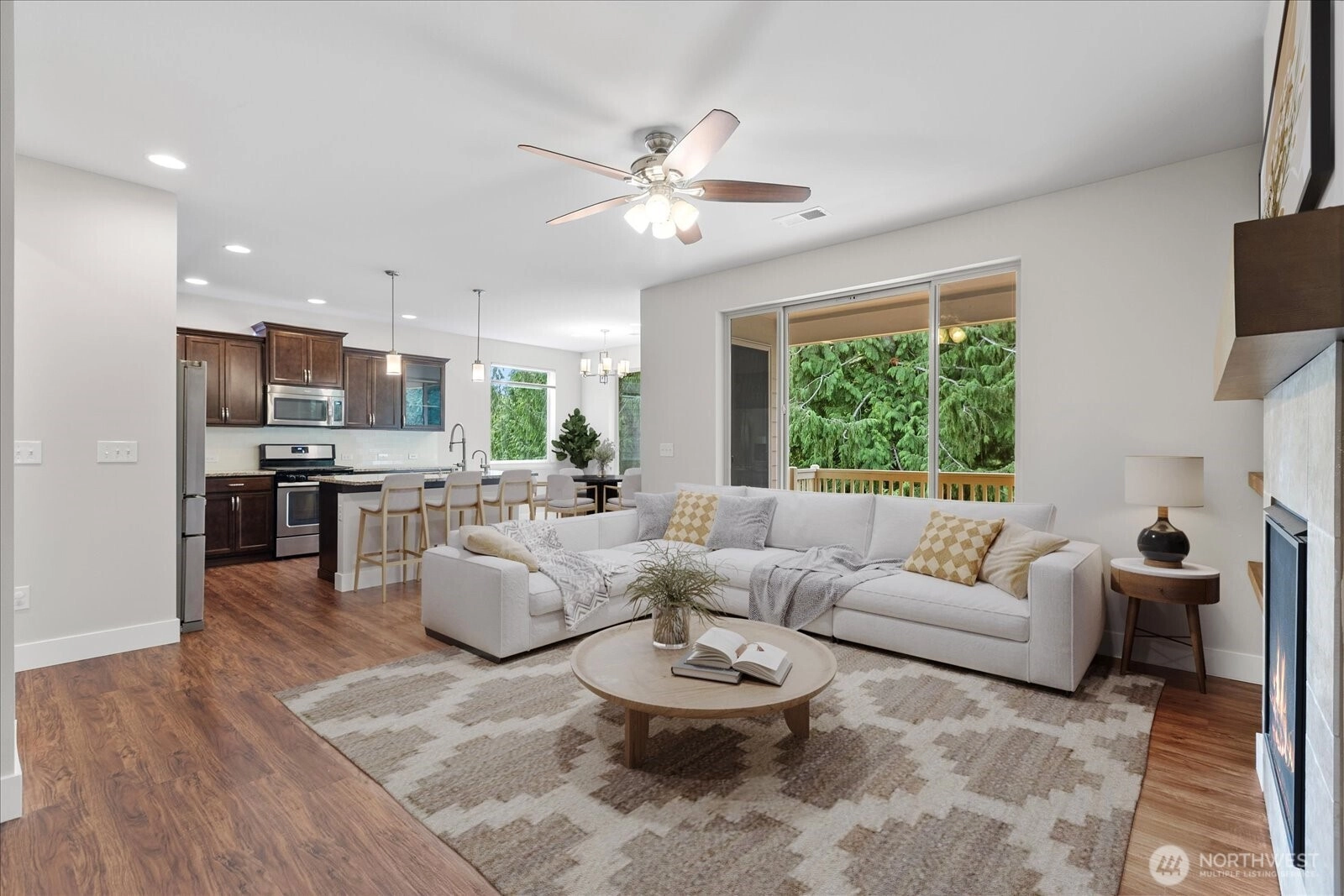 Comfort and convenience meet at this move in ready Snohomish home! Multi-generational potential in daylight basement [1 bed & 3/4 bath] + large rec room. 5 bed/3.5 bath + generous flex space/loft. Receive your guests from the covered front porch into the welcoming parlor. Open, airy kitchen with stainless steel appliances, slab granite countertops, touch faucet, insta hot and large island with bar seating. Adjacent dining area leads out to covered deck, perfect for all Northwest seasons! Cozy up to the gas fireplace in the inviting great room. New LVP flooring on main, fresh interior paint throughout. 5 piece ensuite bath in the spacious primary suite. Three additional bedrooms, full bath and laundry room upstairs. Fully fenced backyard, patio and privacy screen. Gate opens out to additional property backing to protected area for privacy. Garage includes custom cabinets and workbench. Convenient hall tree/bench from the garage entryway. Generous storage, up/down shades, ceiling fans throughout. H/C hose bibs, leaf guard gutters and storage shed. Community playground, close to shopping, dining and amenities. Snohomish School District. Easy access to HWY 2 and HWY 9 commuter routes! The Shadowood community is ready to welcome new owners!