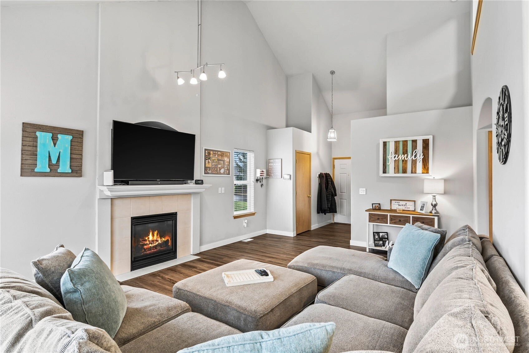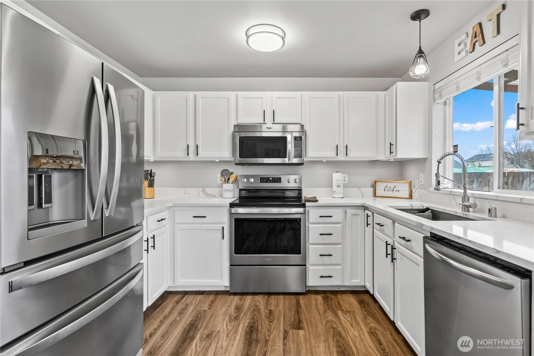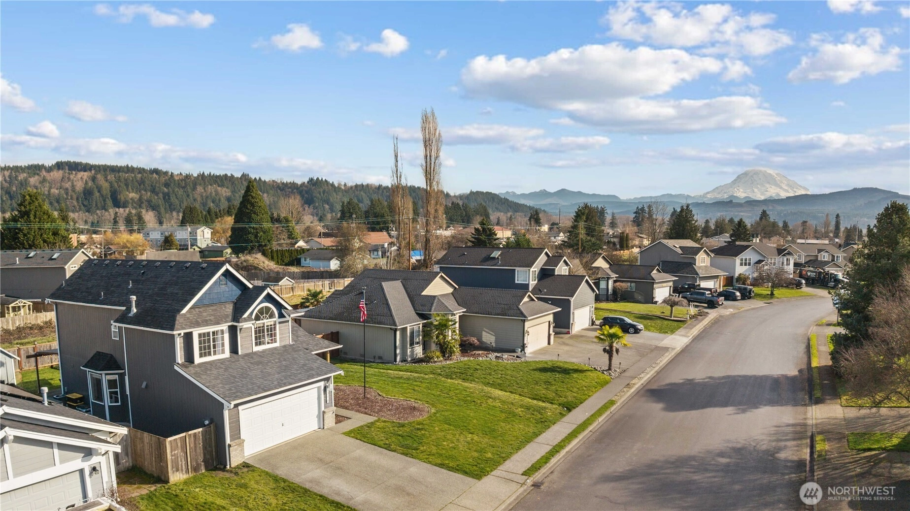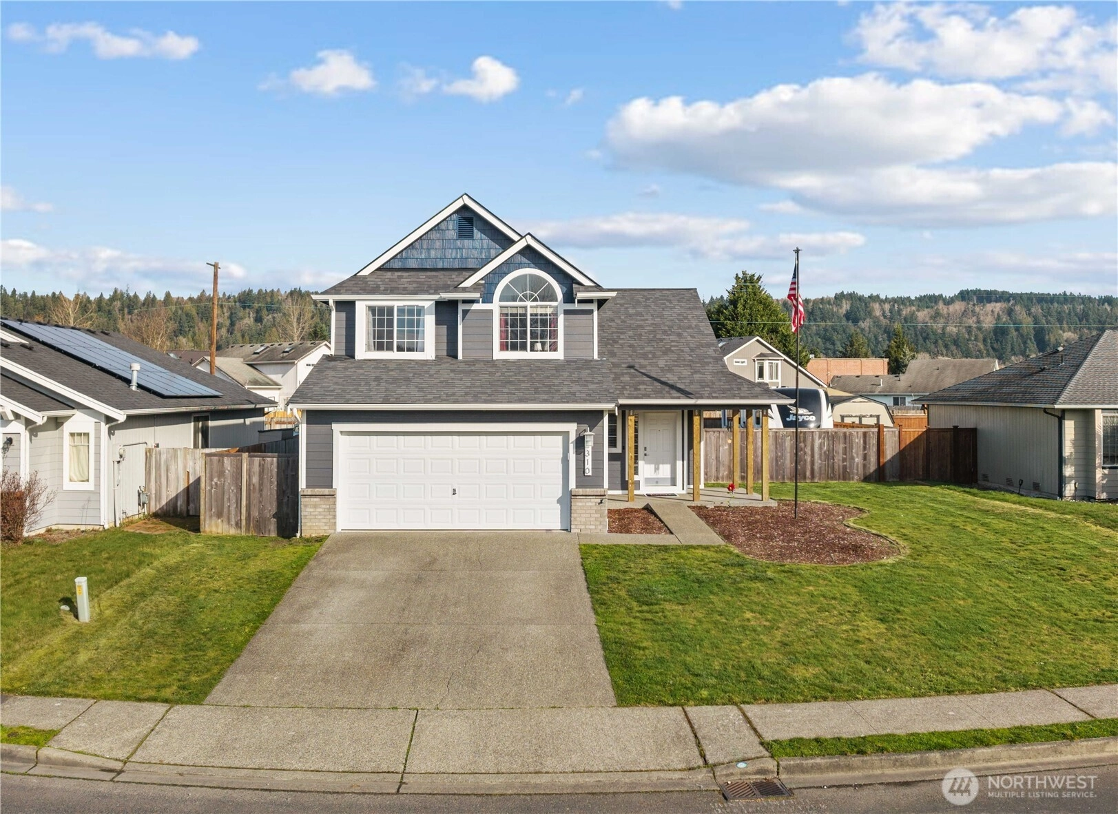 Welcome to this well cared for two story home in the White Hawk neighborhood of Orting. Offering 3 beds, 2.5 baths, and 1,553 sqft, this residence features updated modern flooring and a bright, open great room with vaulted ceilings that fill the space with tons of natural light & a cozy gas fireplace. The refreshed kitchen showcases clean finishes, stainless steel appliances, white cabinetry, and quartz countertops, flowing seamlessly into the main living area, perfect for everyday living and entertaining alike. Situated on a fully fenced lot, the property provides privacy and flexibility for pets, play, or outdoor gatherings. The backyard also includes trailer parking with a 30 amp hookup, storage shed, and the home is wired for a generator with a natural gas hookup, adding convenience, and peace of mind. ***Major upgrades have already been completed, including a new 40 year roof installed in April 2025, fresh exterior paint in September 2025, a new water heater added in summer 2025, and a newer air conditioning unit. Located near parks, restaurants, and neighborhood amenities, this move in ready home combines thoughtful updates with functional living space in one of Orting’s most desirable communities.