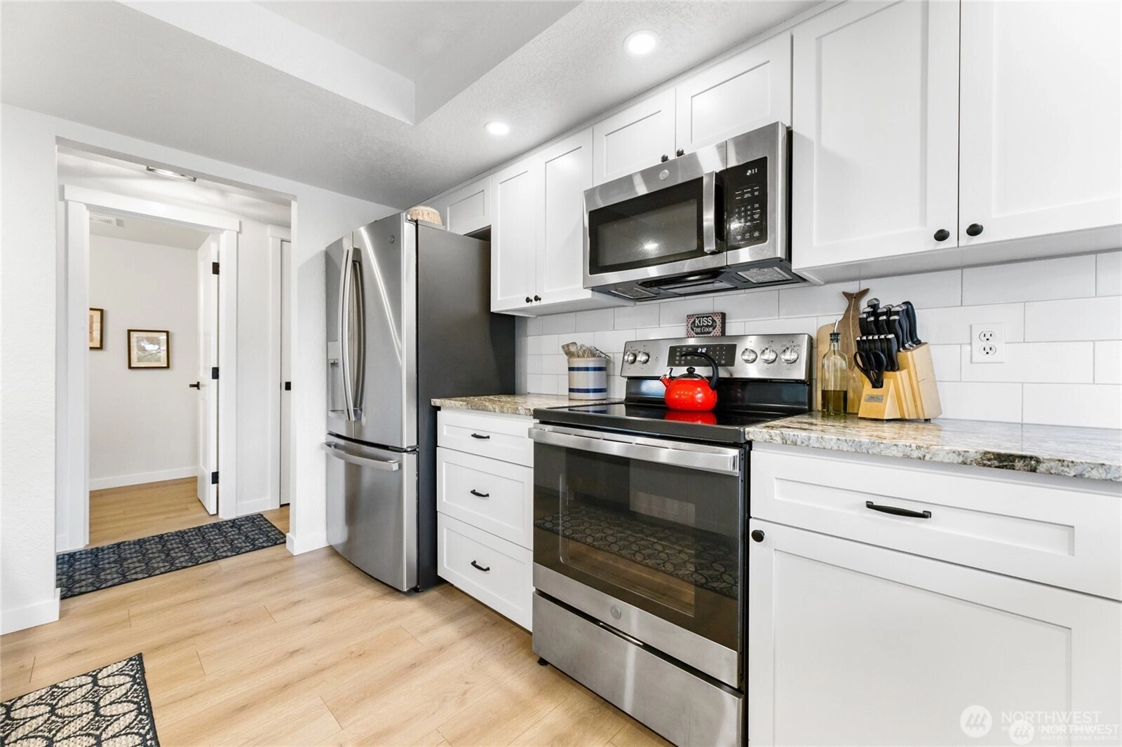 Very nicely updated condo in SW Puyallup, 3 bed, 2.5 bath with a 2 car attached garage in highly sought after Park Place complex. All new cabinets, floors, granite countertops, GE appliances, all new bathrooms w/tile showers, full floor to ceiling stone fireplace and all fresh paint and a cedar deck. Walking distance to Clarks creek park with ball fields, hiking trails, picnic areas and play structures, also tennis and pickleball. Dues cover Water, Sewer, Garbage, and outside maintenance.