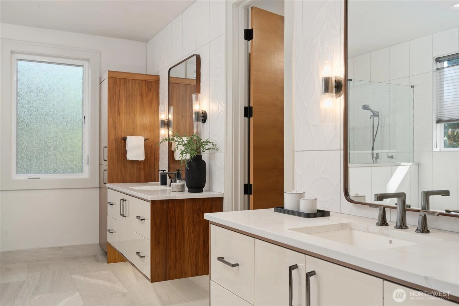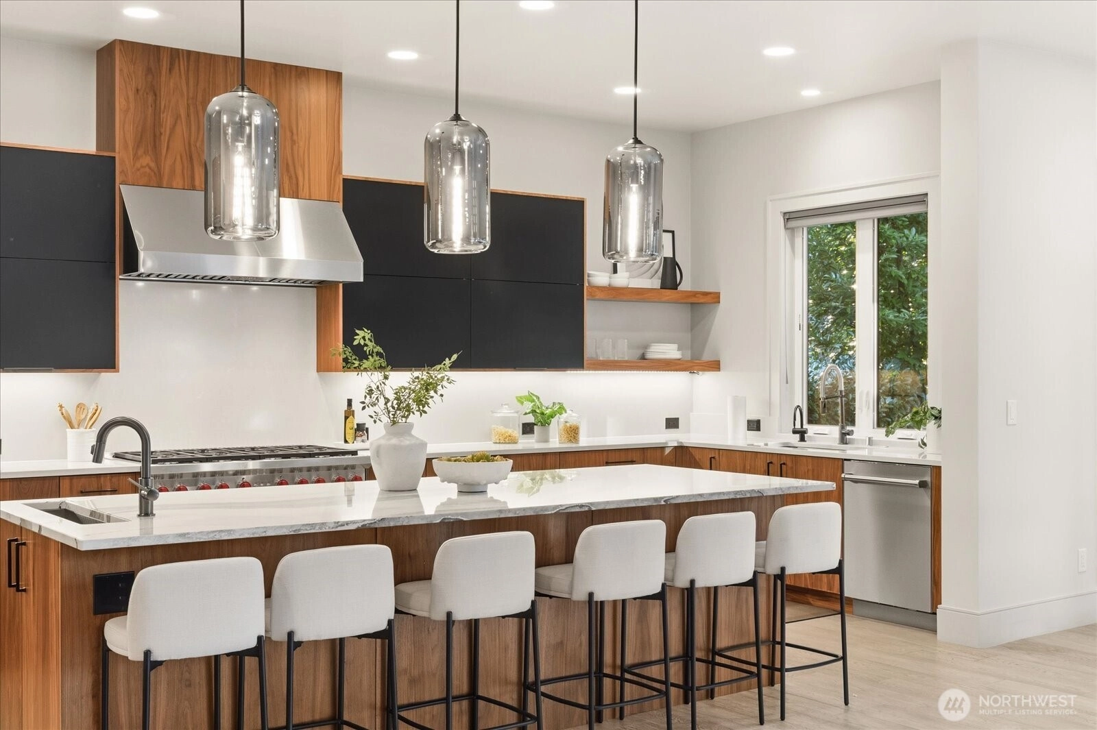 Luxury Lang Homes West Bellevue resale on quiet cul-de-sac, with impressive rock fountains & garden-like entrance.6 bedrooms/4 are ensuites. 4-car tandem garage! Stunning 2-story entry. High level finishes. Brizo lighting. Onsite custom metal & tempered glass stair rail system. 8’ solid oak doors.Plateau engineered oak floors, Pental quartz slabs, bathroom tile floors & full backsplashes.Bellmont Natural Walnut cabinets including drawers, soft close, upper floating swing up cabinets, recycle center. Mirabelle dual mount sink & kitchen island vegetable sink.Huge Cambria Quartz Island, Wolf 48” gas range, Subzero glass front refrigerator, beverage center. Butler’s panty with wine rack,built-in buffet & beverage center for easy access to formal Dining. Living room boasts a 72” Crave fireplace with custom metal mantle & tile surround.Wall details on main floor den & well appointed main level ensuite. Lower level features Wellness room with Red Light Therapy Booth, a Theatre room with built-in beverage center & addtl bed & bath.Top level Primary has vaulted ceilings, fireplace, 5-pc bath with in floor heating, organized closet systems including an LG Steamer! Upstairs Bonus with built-ins, 3 addtl bed/bath.Bidets in every bath but one.Covered vaulted patio with fireplace & Infratech overhead heaters.Fully fenced turf backyard, Greenhouse & Jacuzzi stay. Close to public & private schools, walk to downtown! HVAC Trane wireless control/ air conditioner with 4 zones. It’s a beauty!