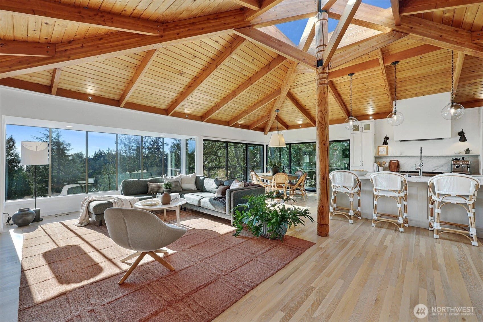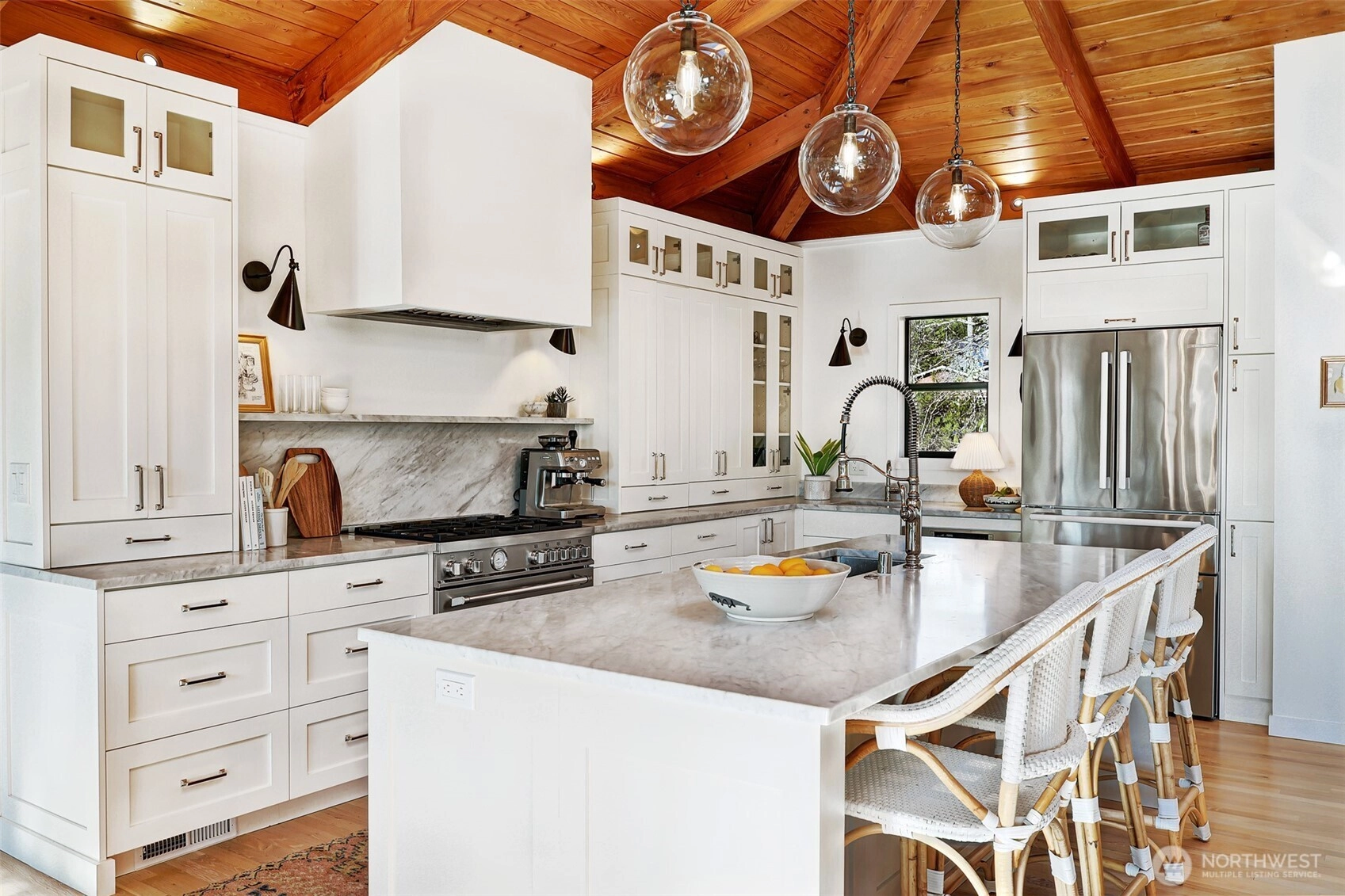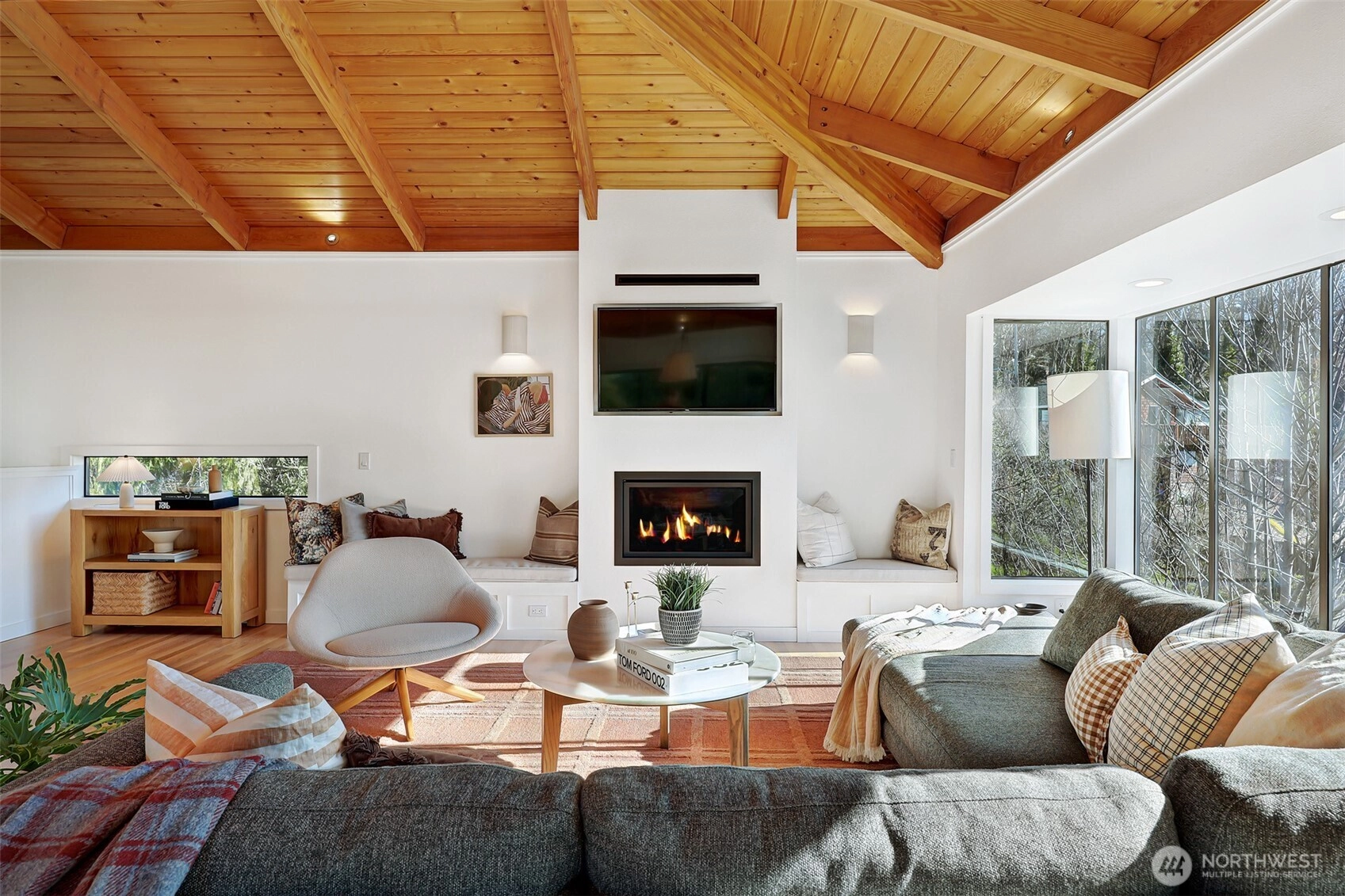 Welcome to the Parasol House. This sophisticated Northwest contemporary residence across from Lincoln Park is a bespoke home full of architectural interest. It is fully remodeled with refined finishes throughout. This exceptional home features a reverse open floor plan that elevates everyday living, placing the primary entertaining spaces on the upper level with views of sunsets and Lincoln Park. The top floor is a true showpiece, offering a dramatic great room with vaulted, wood-beamed ceilings, new fireplace and expansive areas centered around a stunning new kitchen with marble countertops and top-of-the-line appliances - designed for both effortless entertaining and creativity. The entry level welcomes you with a large and inviting media room featuring a theatre, a wet bar and access to a generous outdoor entertainment space, tucked in the trees. This level also allows for a well-appointed bedroom and three-quarter bath, perfect for guests or working from home. The second level hosts a tranquil primary suite with walk-in closet, full bath, and private deck, plus an additional bedroom, utility area, and three-quarter bath. Additional highlights include elevator access to all levels, a two-car garage with plenty of storage and secluded hot tub - all with luxury and convenience in mind. Located close to friendly neighbors, parks and walking trails, ferries, shopping, transit and schools.
