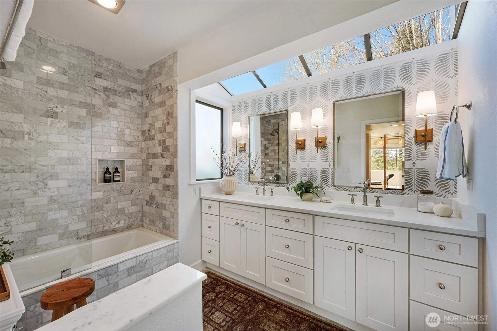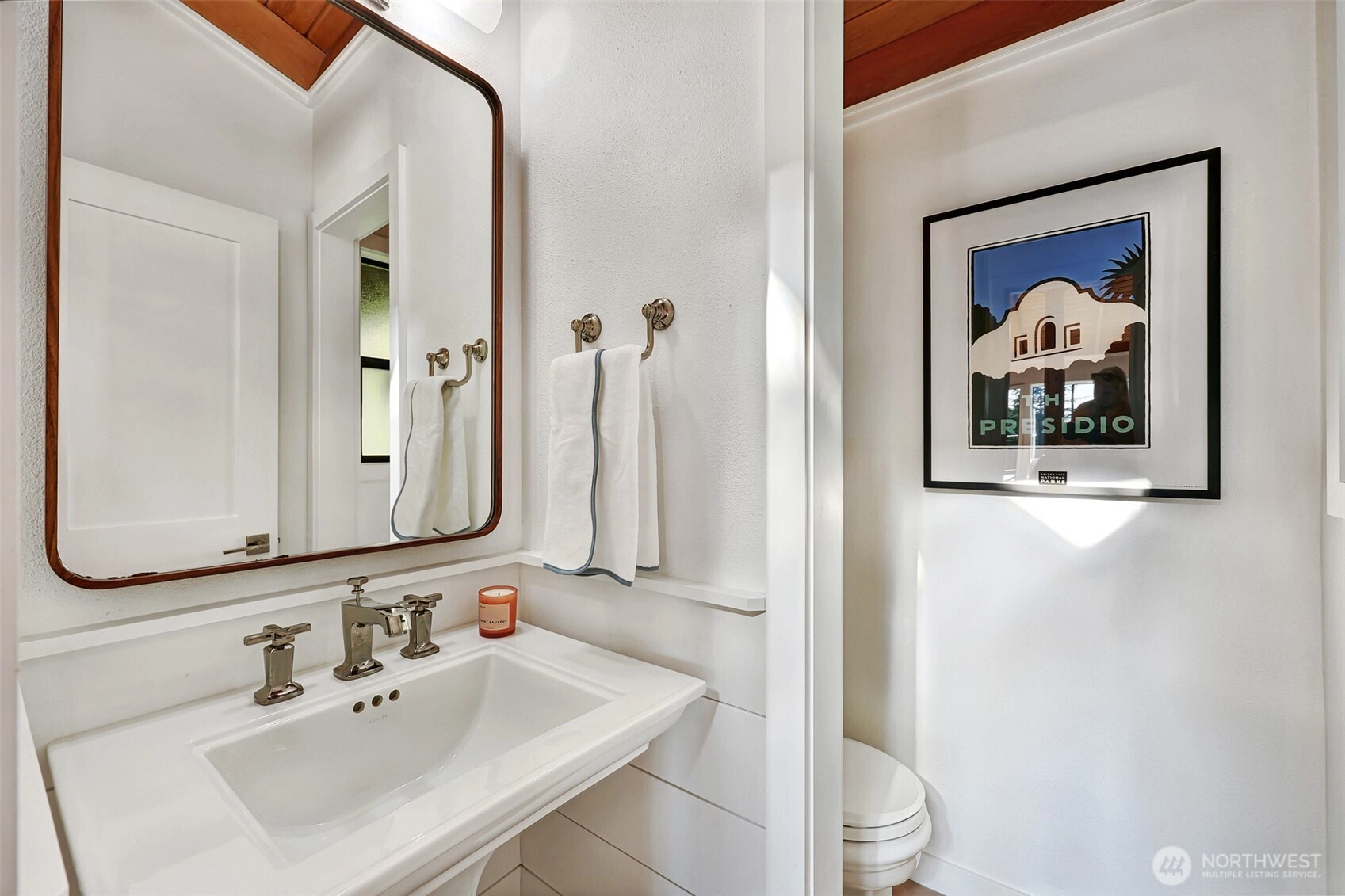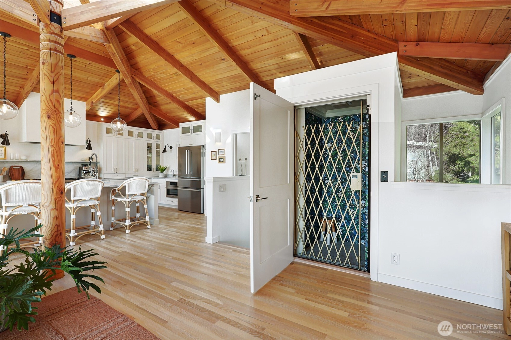 Welcome to the Parasol House. This sophisticated Northwest contemporary residence across from Lincoln Park is a bespoke home full of architectural interest. It is fully remodeled with refined finishes throughout. This exceptional home features a reverse open floor plan that elevates everyday living, placing the primary entertaining spaces on the upper level with views of sunsets and Lincoln Park. The top floor is a true showpiece, offering a dramatic great room with vaulted, wood-beamed ceilings, new fireplace and expansive areas centered around a stunning new kitchen with marble countertops and top-of-the-line appliances - designed for both effortless entertaining and creativity. The entry level welcomes you with a large and inviting media room featuring a theatre, a wet bar and access to a generous outdoor entertainment space, tucked in the trees. This level also allows for a well-appointed bedroom and three-quarter bath, perfect for guests or working from home. The second level hosts a tranquil primary suite with walk-in closet, full bath, and private deck, plus an additional bedroom, utility area, and three-quarter bath. Additional highlights include elevator access to all levels, a two-car garage with plenty of storage and secluded hot tub - all with luxury and convenience in mind. Located close to friendly neighbors, parks and walking trails, ferries, shopping, transit and schools.