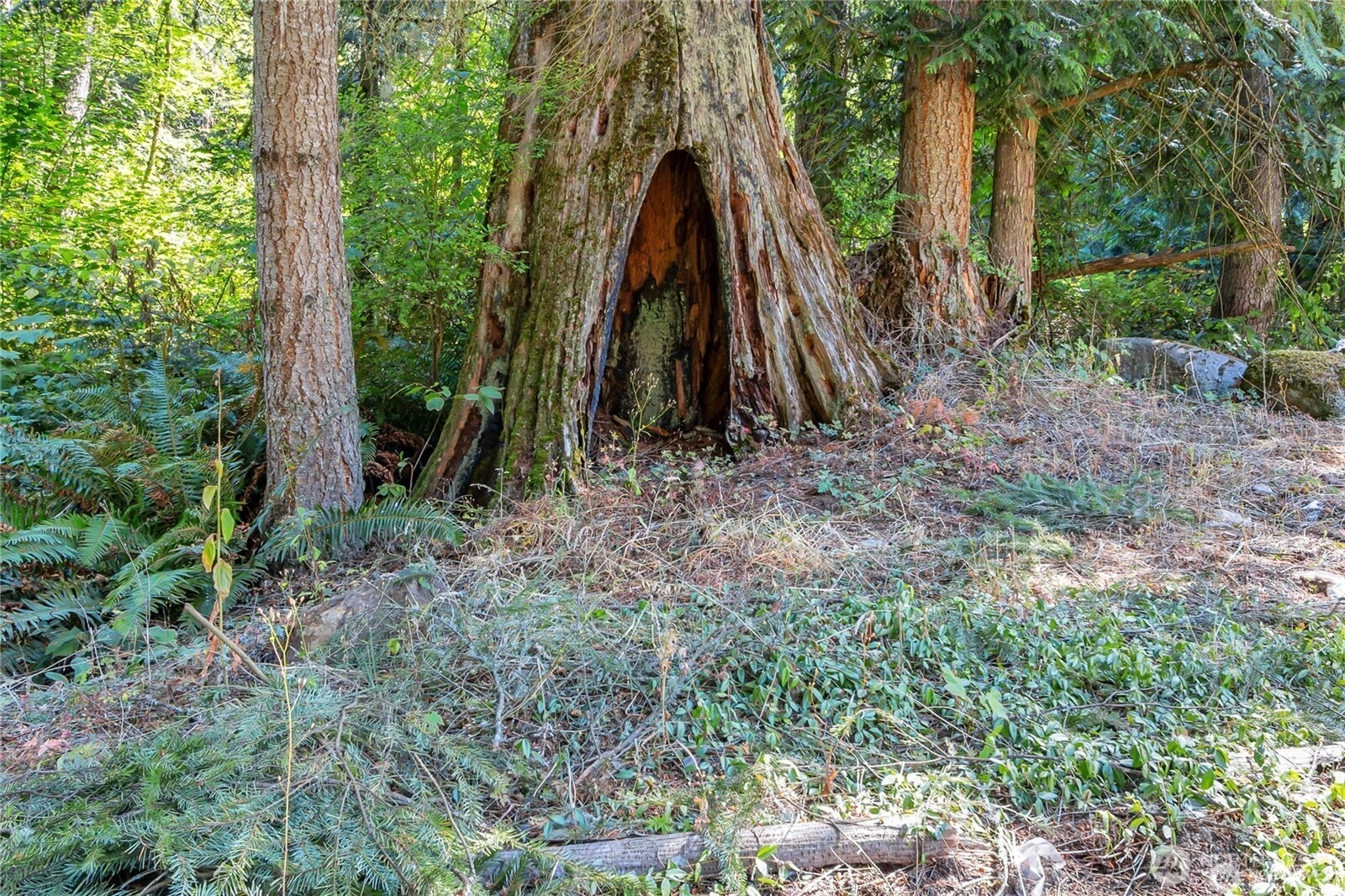 Nestled on nearly 20 acres of breathtaking wooded land, this private, custom-built home offers unmatched tranquility. The meticulously maintained 2,100-square-foot residence features a distinctive floor plan highlighted by an open staircase and gleaming hardwood floors, creating a welcoming atmosphere throughout. At the heart of the home is a spacious eat-in kitchen, complete with a gas range and a stylish glass mosaic backsplash, while the inviting family room centers around a cozy gas fireplace and provides picturesque views of the lush green landscape that envelops the property. Formal dining room opens up to the lower deck to take in the views. The main floor includes a large bedroom with a full bathroom for convenience and privacy. Upstairs, you'll find the primary suite with full bath and large closet with dressing area, an additional bedroom and a bonus family room that opens to upper outdoor deck, ensuring ample space for guests. Outdoor living is elevated by the dual-level decks that showcase stunning territorial views and a captivating view of the Seattle skyline, which offers a perfect setting for relaxation and entertaining. This property also delivers practical benefits such as no HOA fees, significant tax savings through its forestry designation, and marketable timber. Combining natural beauty, privacy, and the financial advantages, this exceptional home is both a wise investment and a peaceful retreat.