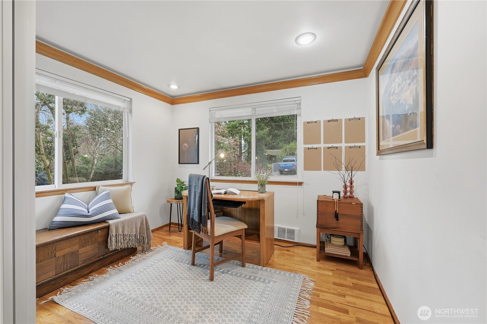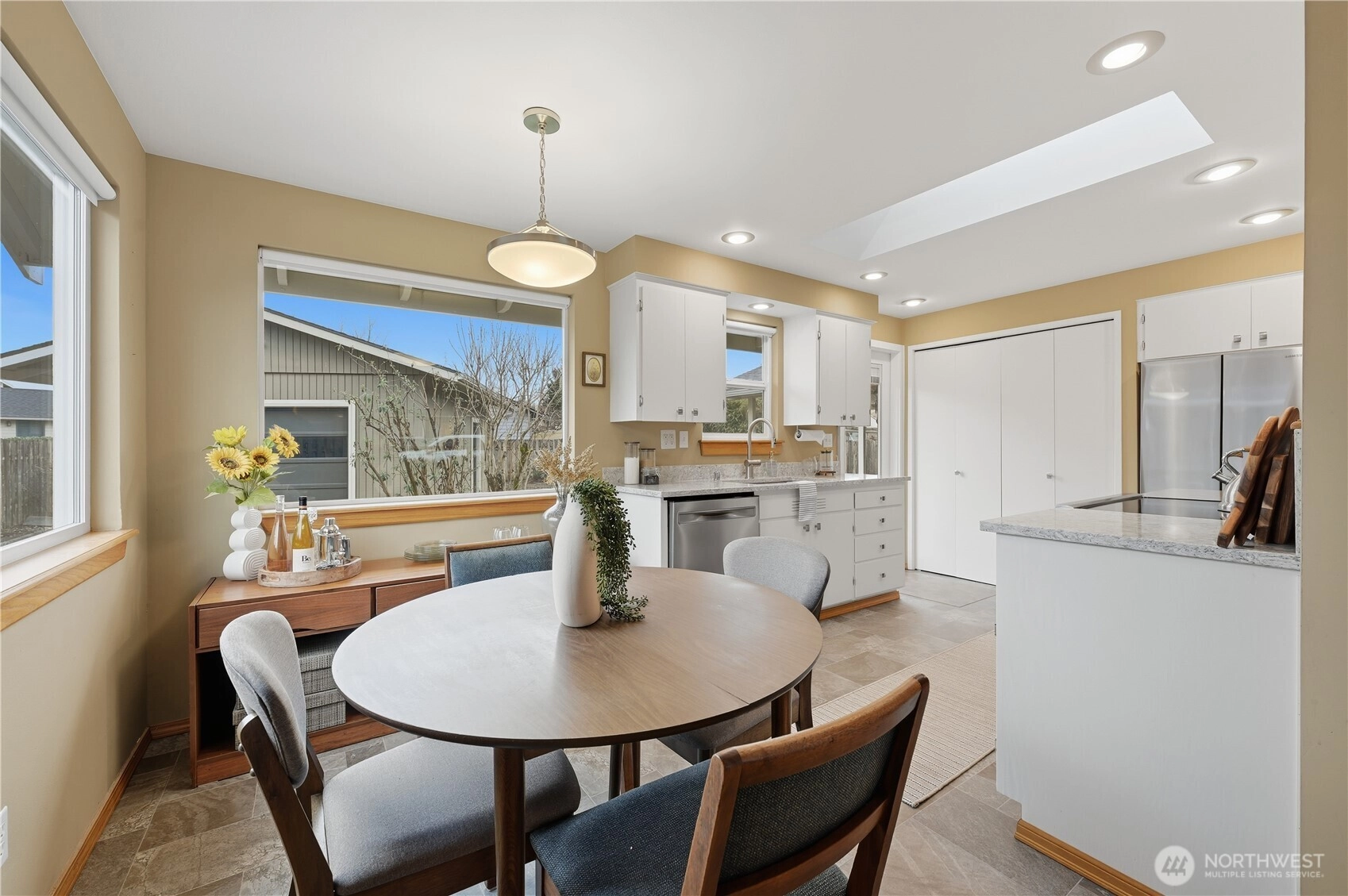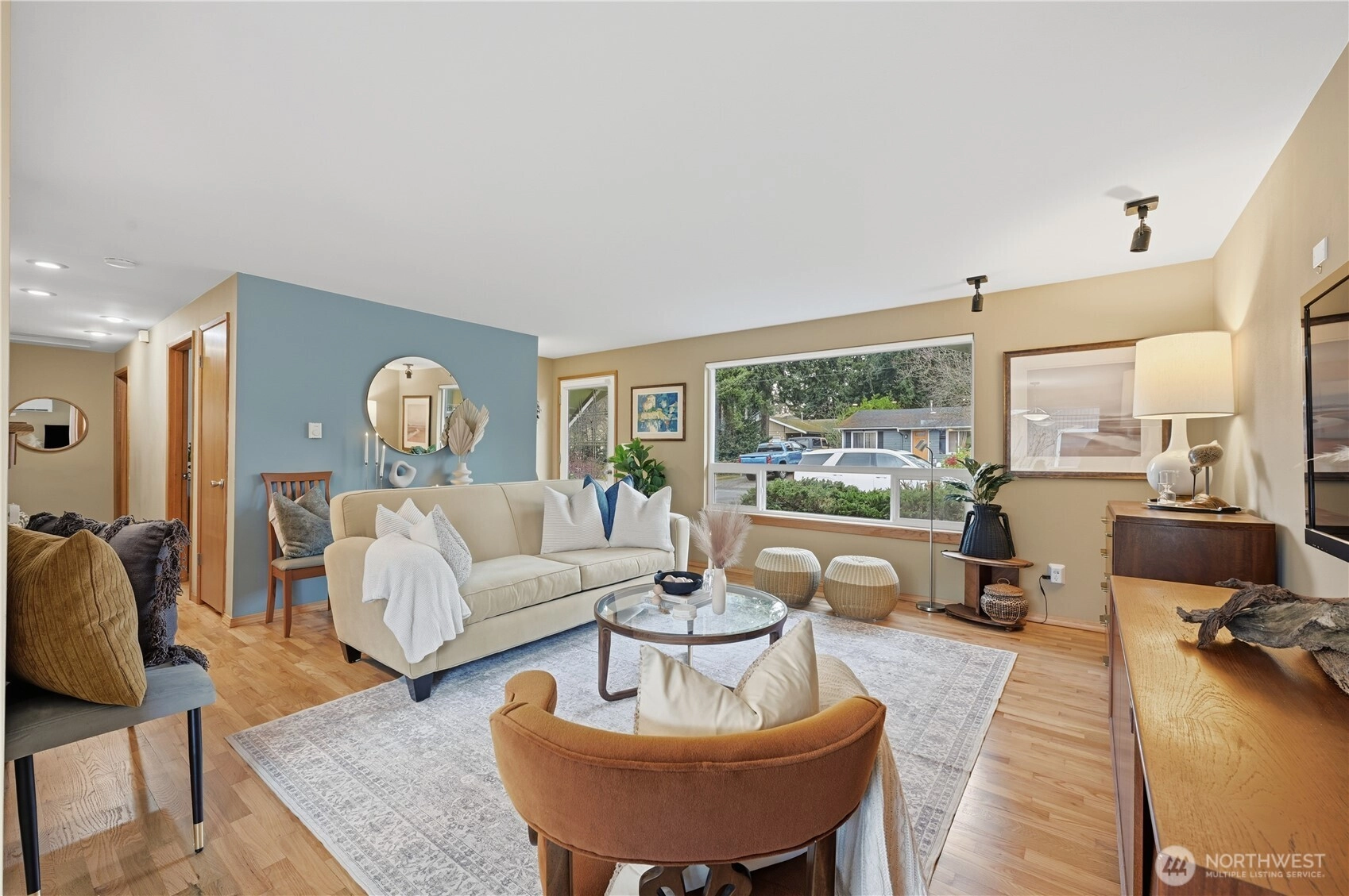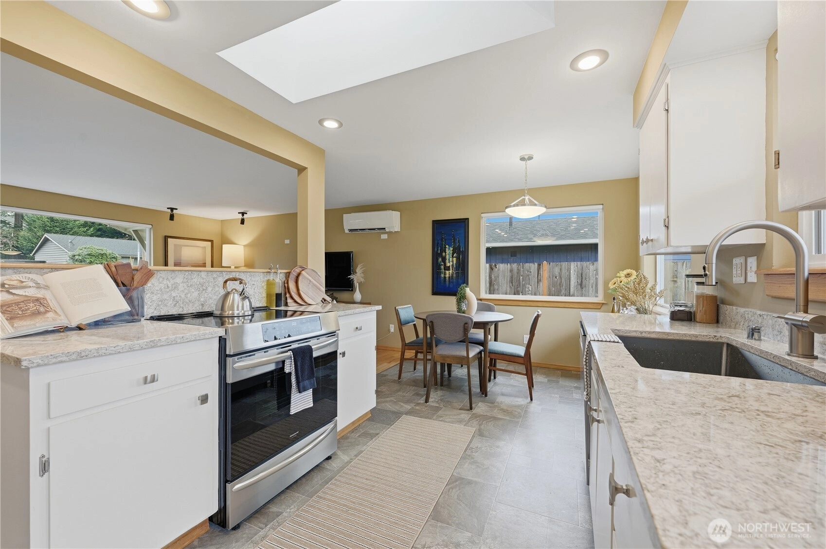 Pride of ownership shines throughout this beautifully updated single-level home in great location. The open and airy floor plan showcases an updated kitchen that flows seamlessly into the living room, featuring newer ss appliances, quartz countertops, and a powered skylight that fills the space with natural light. Exposed hardwood floors run throughout, complemented by abundant windows, remote-controlled powered blinds in the main living area, and an inviting, light-filled atmosphere. The primary suite offers a small walk-in closet and French doors that open to a private covered deck perfect for relaxing or entertaining. The spa-inspired bathroom has been tastefully updated with heated tile floors and modern fixtures. Additional highlights include an oversized one-car garage with ample storage and partially fenced, park-like grounds with mature landscaping. Recent updates include a newer roof and gutters, mini-split heating and air conditioning, an updated electrical panel, and refreshed lighting throughout. Ideally located with convenient access to I-5, Boeing, shopping, and future light-rail, this move-in-ready home combines comfort, style, and exceptional convenience.