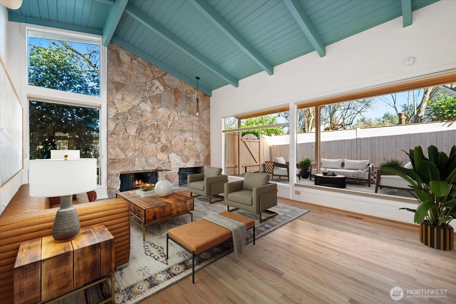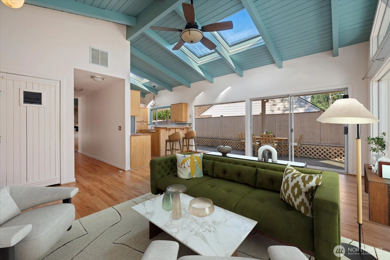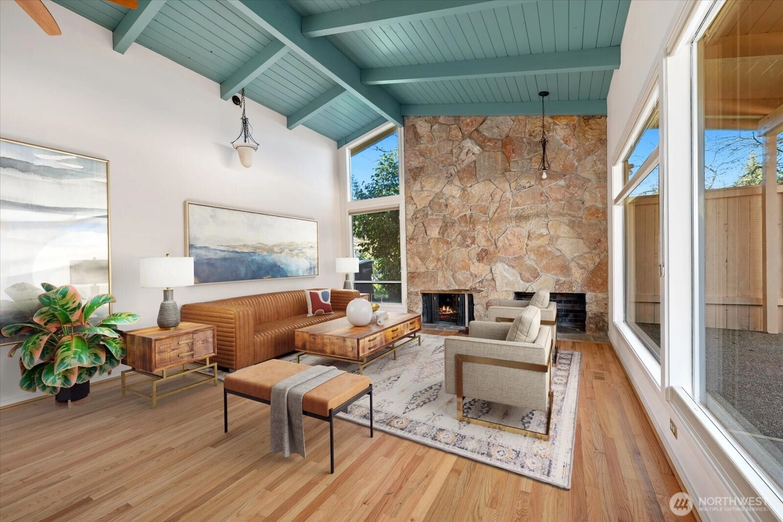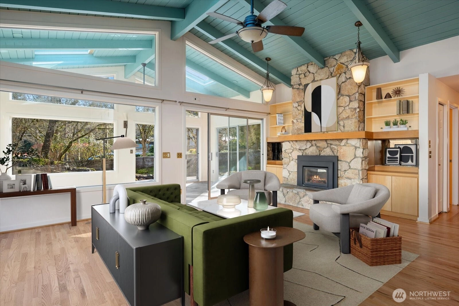 Mid-century modern rambler in the highly sought-after Valhalla community of Bothell. This beautifully maintained 3-bedroom, 2-bath home showcases open-concept living spaces filled with natural light, soaring ceilings, and skylights that create an airy, inviting atmosphere. Newer hardwood floors add warmth and elegance throughout. Enjoy the comfort of two fireplaces—one gas and one wood-burning—perfect for cozy evenings. The kitchen offers distinctive character and seamless access to the backyard through sliding glass doors, making indoor-outdoor living effortless. An expansive sunroom opens to a private, sun-drenched patio featuring a tranquil water feature and pond surrounded by seasonal ground cover and flowers. Situated proudly on a well manicured corner lot, this home also includes access to the community pool, located right around the corner. A rare opportunity in a prime location—this home is truly a must-see.