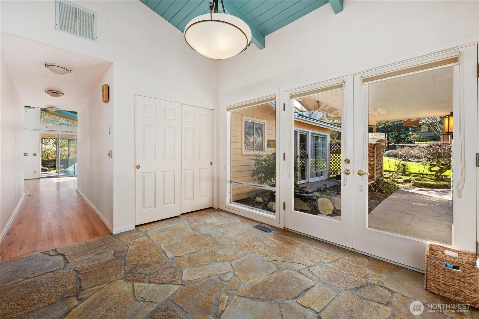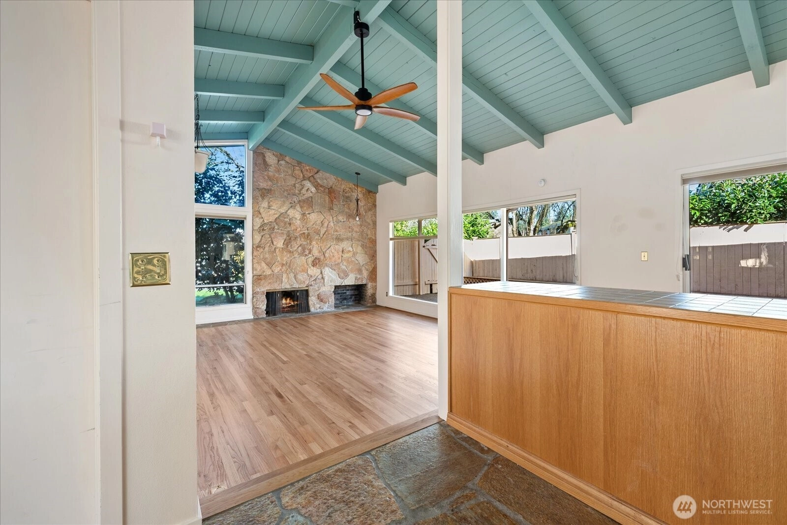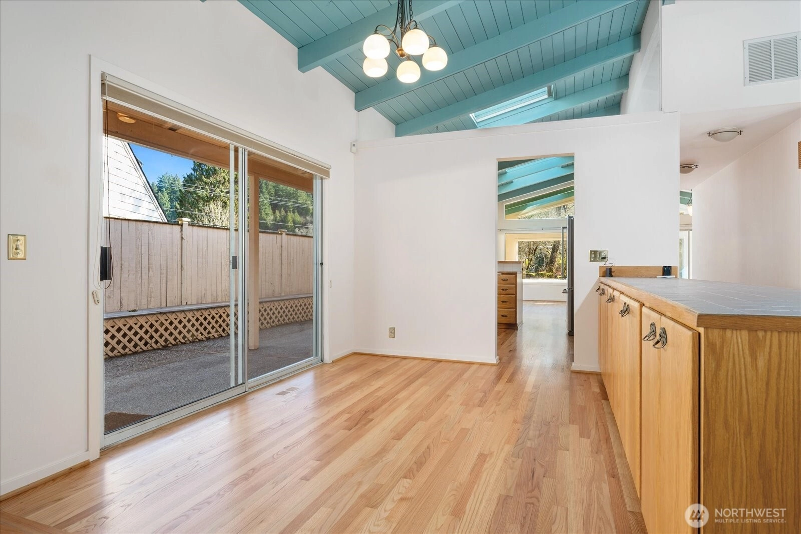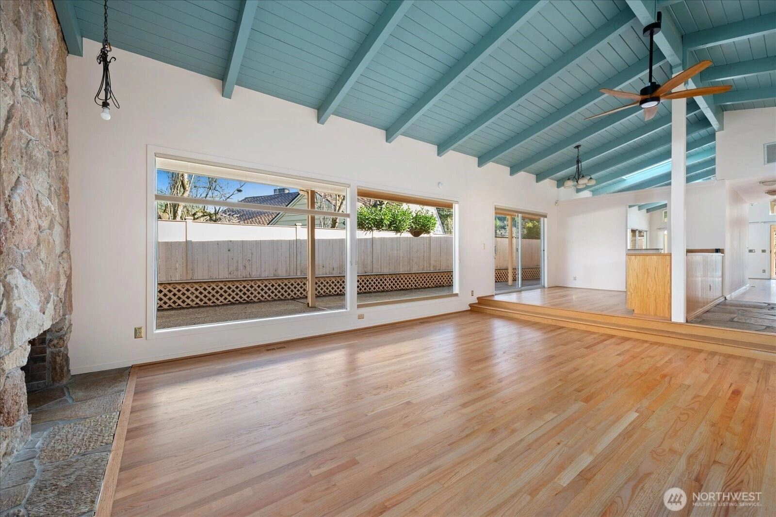 Mid-century modern rambler in the highly sought-after Valhalla community of Bothell. This beautifully maintained 3-bedroom, 2-bath home showcases open-concept living spaces filled with natural light, soaring ceilings, and skylights that create an airy, inviting atmosphere. Newer hardwood floors add warmth and elegance throughout. Enjoy the comfort of two fireplaces—one gas and one wood-burning—perfect for cozy evenings. The kitchen offers distinctive character and seamless access to the backyard through sliding glass doors, making indoor-outdoor living effortless. An expansive sunroom opens to a private, sun-drenched patio featuring a tranquil water feature and pond surrounded by seasonal ground cover and flowers. Situated proudly on a well manicured corner lot, this home also includes access to the community pool, located right around the corner. A rare opportunity in a prime location—this home is truly a must-see.