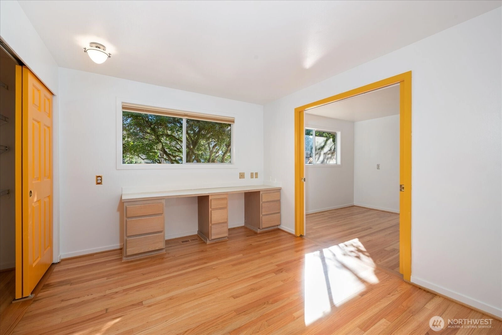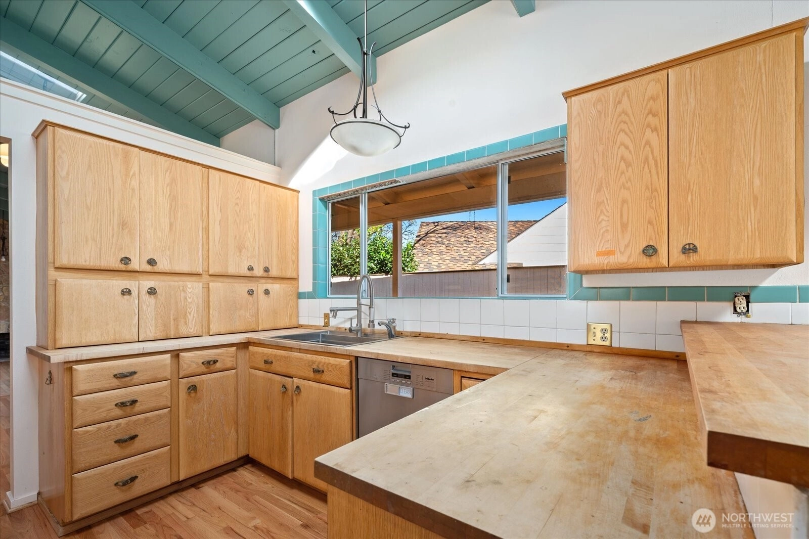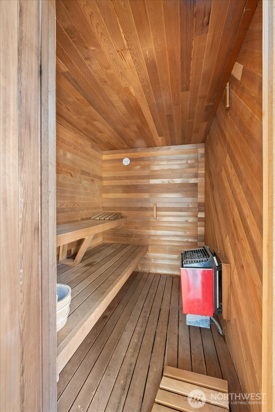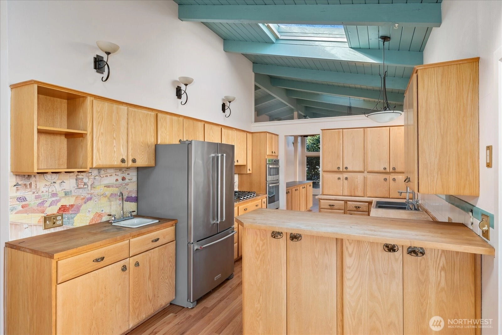 Mid-century modern rambler in the highly sought-after Valhalla community of Bothell. This beautifully maintained 3-bedroom, 2-bath home showcases open-concept living spaces filled with natural light, soaring ceilings, and skylights that create an airy, inviting atmosphere. Newer hardwood floors add warmth and elegance throughout. Enjoy the comfort of two fireplaces—one gas and one wood-burning—perfect for cozy evenings. The kitchen offers distinctive character and seamless access to the backyard through sliding glass doors, making indoor-outdoor living effortless. An expansive sunroom opens to a private, sun-drenched patio featuring a tranquil water feature and pond surrounded by seasonal ground cover and flowers. Situated proudly on a well manicured corner lot, this home also includes access to the community pool, located right around the corner. A rare opportunity in a prime location—this home is truly a must-see.