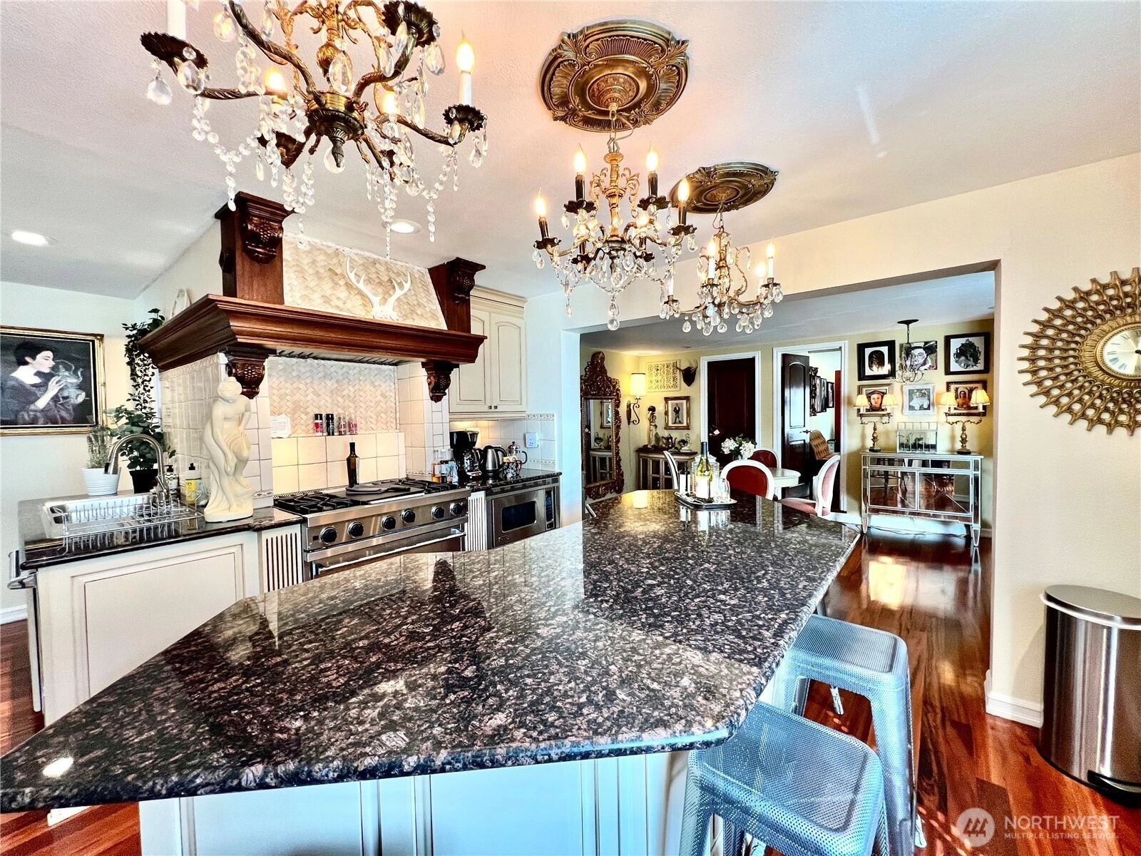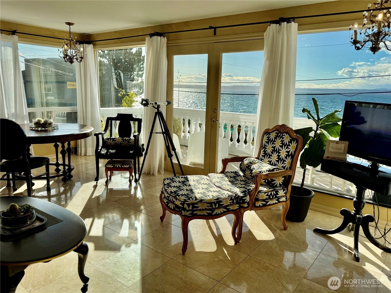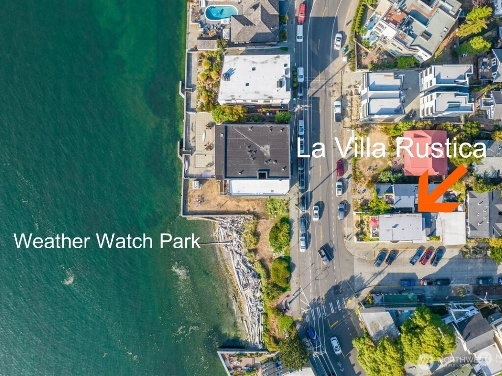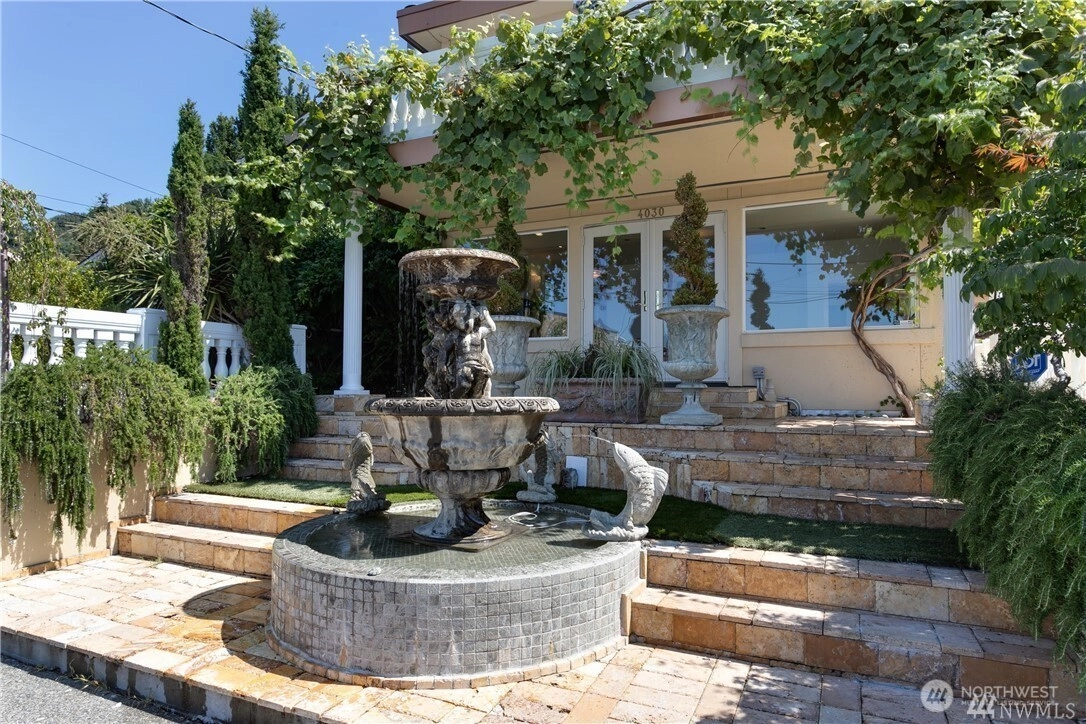 Amazing waterfront property on Beach Drive, with protected views across the street from Weather Watch Park. View orca, sea lions, otters, seals and eagles from your front yard! Reminiscent of an Italian Villa, this opulent stone manse presents a once-in-a-lifetime opportunity for lavish living. Take advantage of multi-zoning, L3, Residential and Commercial. Set up to use as both an elegant single-family home or close interior doors and have two fully-contained units. Live on one floor and rent out the rest of the house for extra income. La Villa Rustica is a palatial residence w/marble floors & fireplace, overflowing with crystal chandeliers and golden flourishes. True chef’s kitchen w/ Viking gas range, refrigerator, microwave & dishwasher, classic cabinetry & granite counters, plus a built-in professional pizza oven. Main floor has office (or 3rd bedroom) w/bedroom suite with sandstone shower worthy of a Roman emperor. Upstairs can be a separate suite or an amazing primary suite with balcony and Puget Sound views. You'll love the elegant Roman fountain in front and the small patio with bar and room for a barbeque and entertaining in back. Original house built in 1918, with major updates by previous owner in 2000. Huge two-car garage+workshop, plus laundry and storage. Live in this grand home or use as a long or short-term rental or take advantage of the corner lot for future use. Protected views as across the street is beach access and a city park, Weather Watch Park.