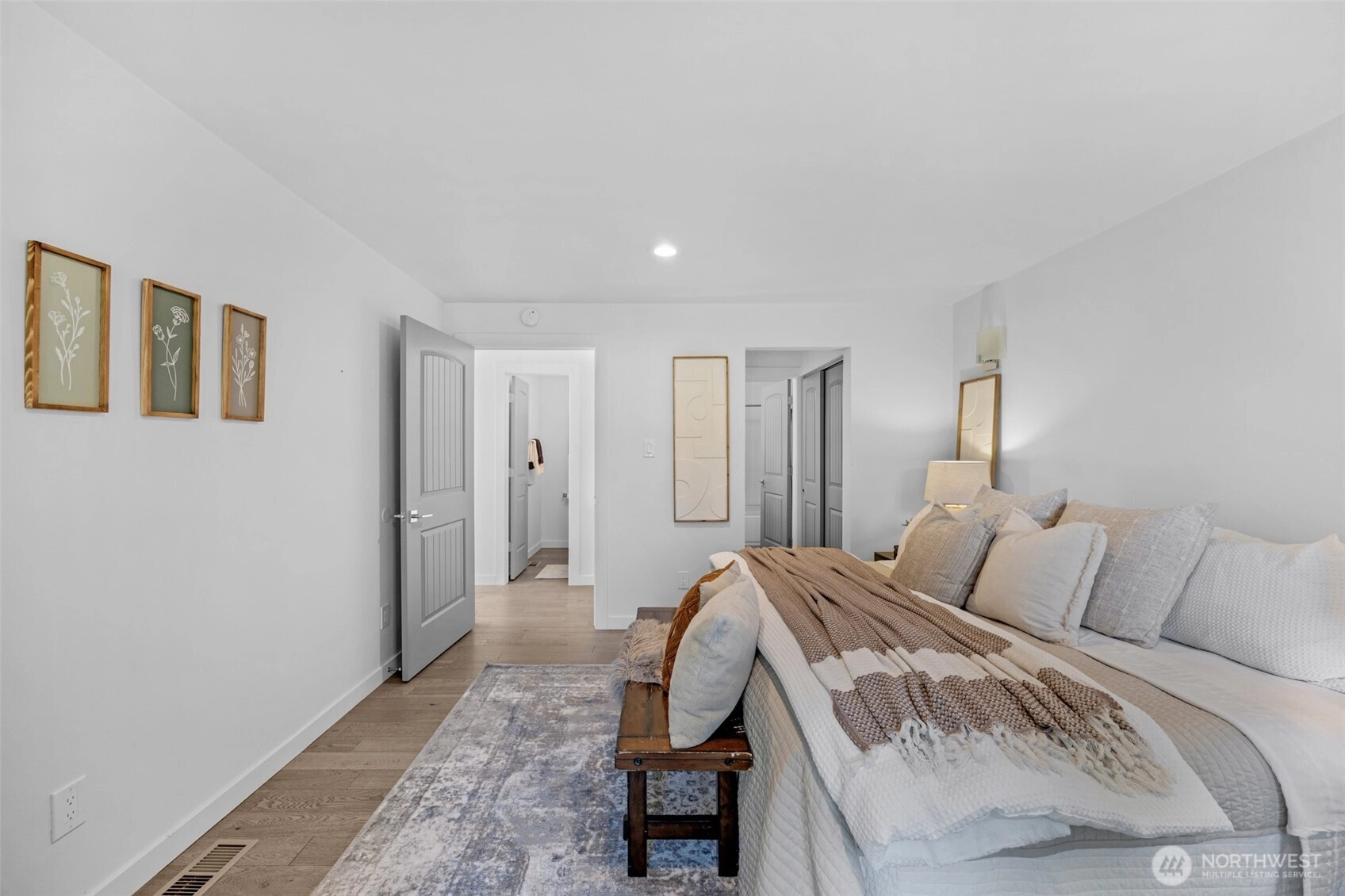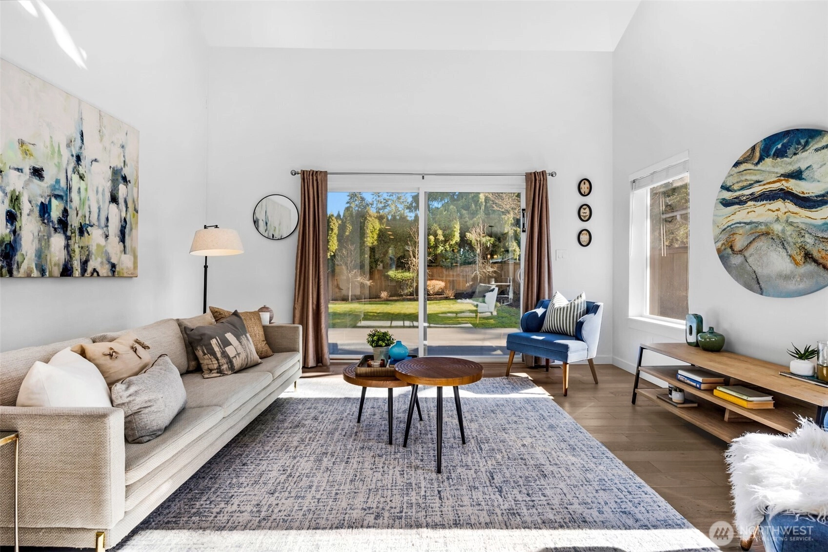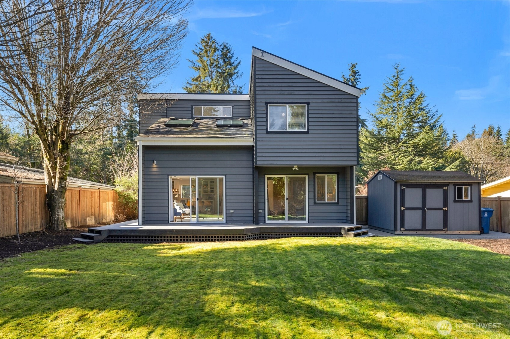 Tucked away on a peaceful cul-de-sac near Ballinger Lake, this refined Edmonds two-story home delivers abundant natural light, modern updates, and effortless indoor-outdoor living. The main-floor primary suite offers a private retreat with a remodeled bath and direct access to the deck and expansive backyard, perfect for morning coffee or relaxed evenings outdoors. The bright open floor plan is enhanced by skylights that flood the home with natural light throughout the day. At the heart of the home, the beautifully remodeled kitchen features crisp white cabinetry, quartz countertops, a sleek glass backsplash, new appliances, and designer lighting, creating a space that is both functional and elevated. Upstairs, two generously sized bedrooms, a full bath, and a spacious family room with vaulted ceilings provides flexible living space ideal for entertaining, work-from-home, or relaxing. Every bathroom has been thoughtfully remodeled, and the home is truly turnkey with air conditioning for year-round comfort. Outside, the oversized, level yard is beautifully manicured and offers exceptional space for entertaining, play, or quiet enjoyment. With room for RV parking or a large garage and close proximity to Ballinger Lake, parks, shopping, and dining, this Edmonds home offers privacy, comfort, and lifestyle in one beautifully finished package.