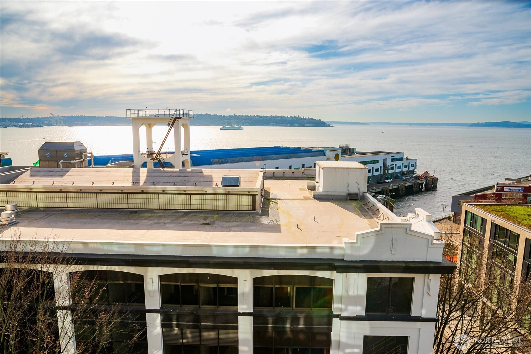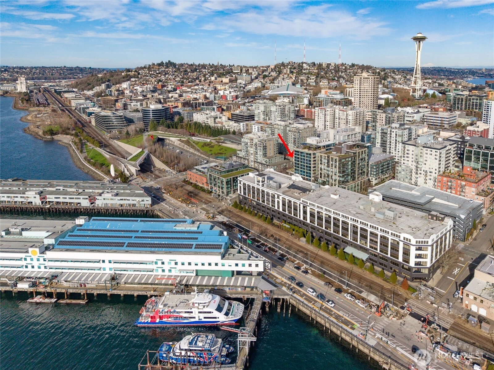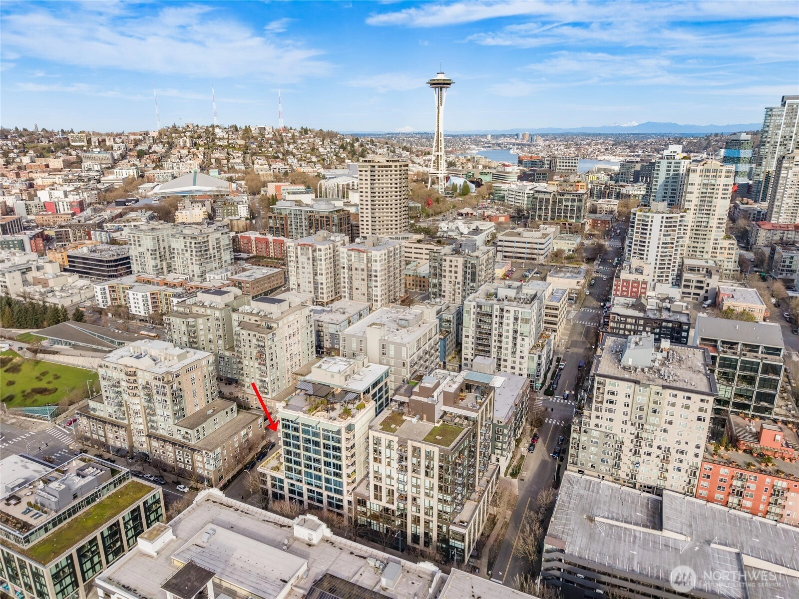 Stunning 180 degree views of Puget Sound, Mt. Rainer & the Olympics. Tons of natual light from floor to ceiling windows. Spacious layout with gas fireplace. Primary suite with en suite 5 piece bath and walk in closet. Updated appliances. Corner unit with deck. 2 parking spaces in common garage and a storage unit. Convenient location, just a block to the Olympic sculpture paek and the waterfront. Just minutes from the Space Needle and Pike Place Market. Amenities include concierge, gym, common roof deck. No rental cap.