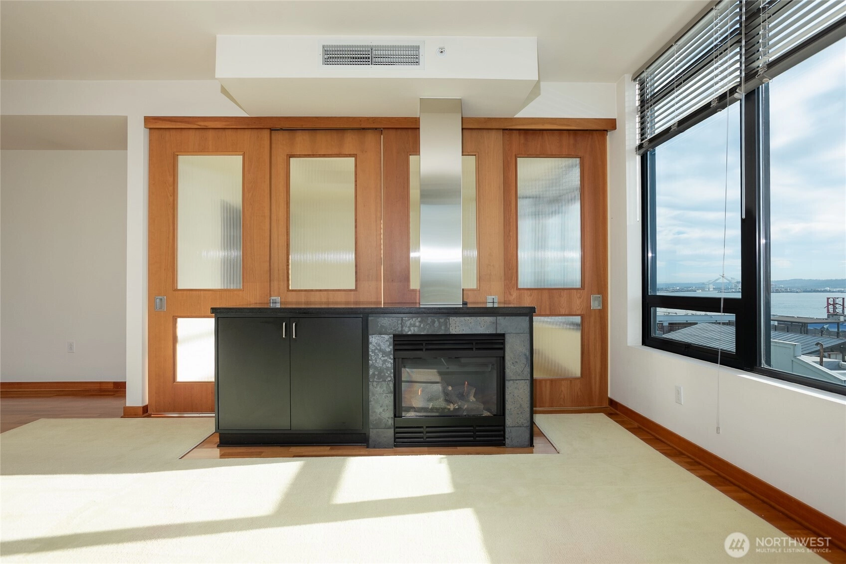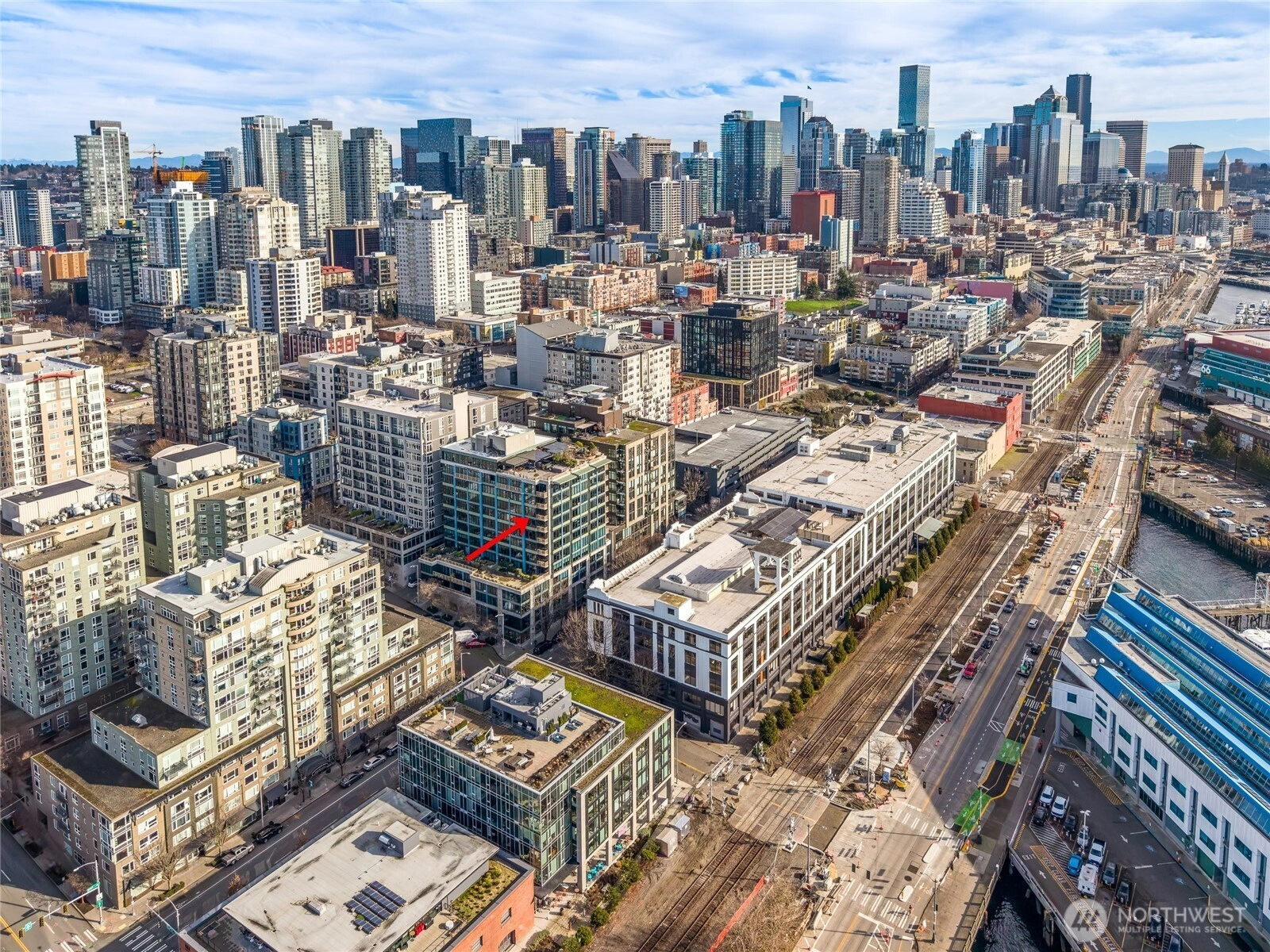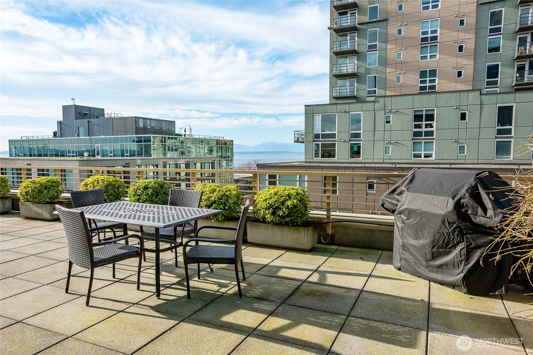 Stunning 180 degree views of Puget Sound, Mt. Rainer & the Olympics. Tons of natual light from floor to ceiling windows. Spacious layout with gas fireplace. Primary suite with en suite 5 piece bath and walk in closet. Updated appliances. Corner unit with deck. 2 parking spaces in common garage and a storage unit. Convenient location, just a block to the Olympic sculpture paek and the waterfront. Just minutes from the Space Needle and Pike Place Market. Amenities include concierge, gym, common roof deck. No rental cap.