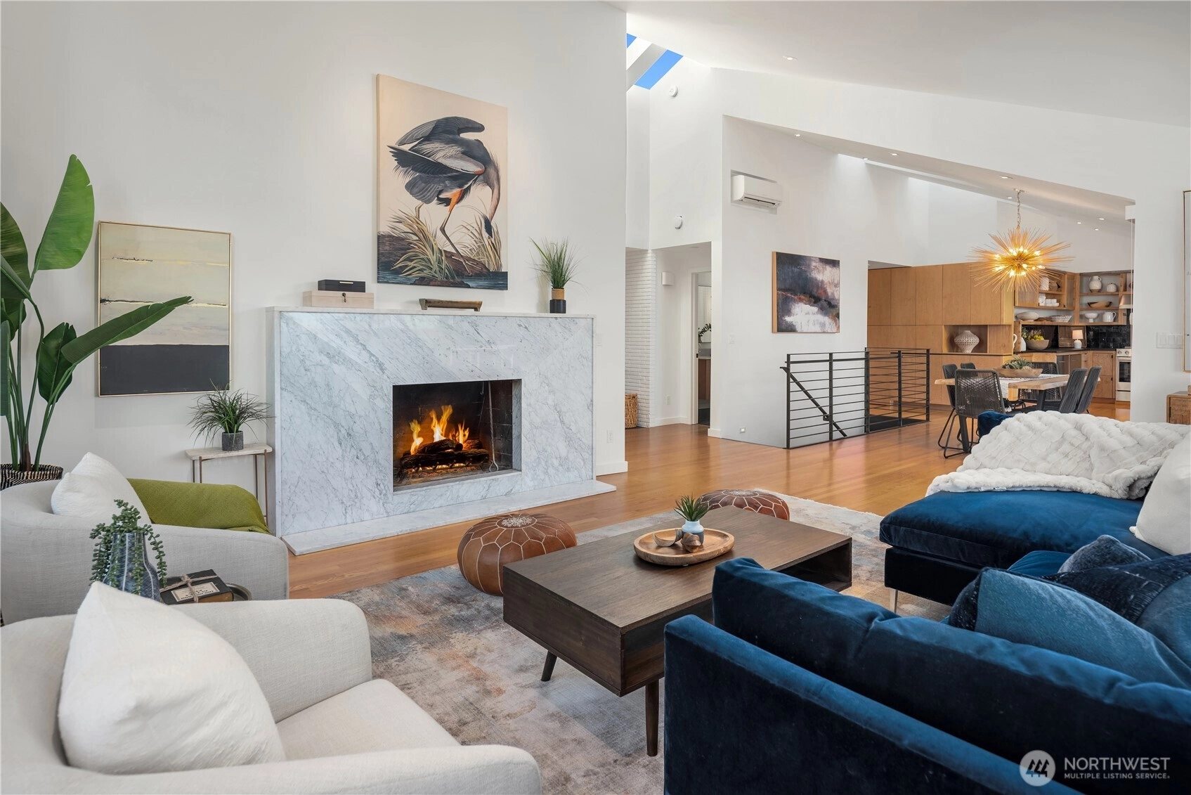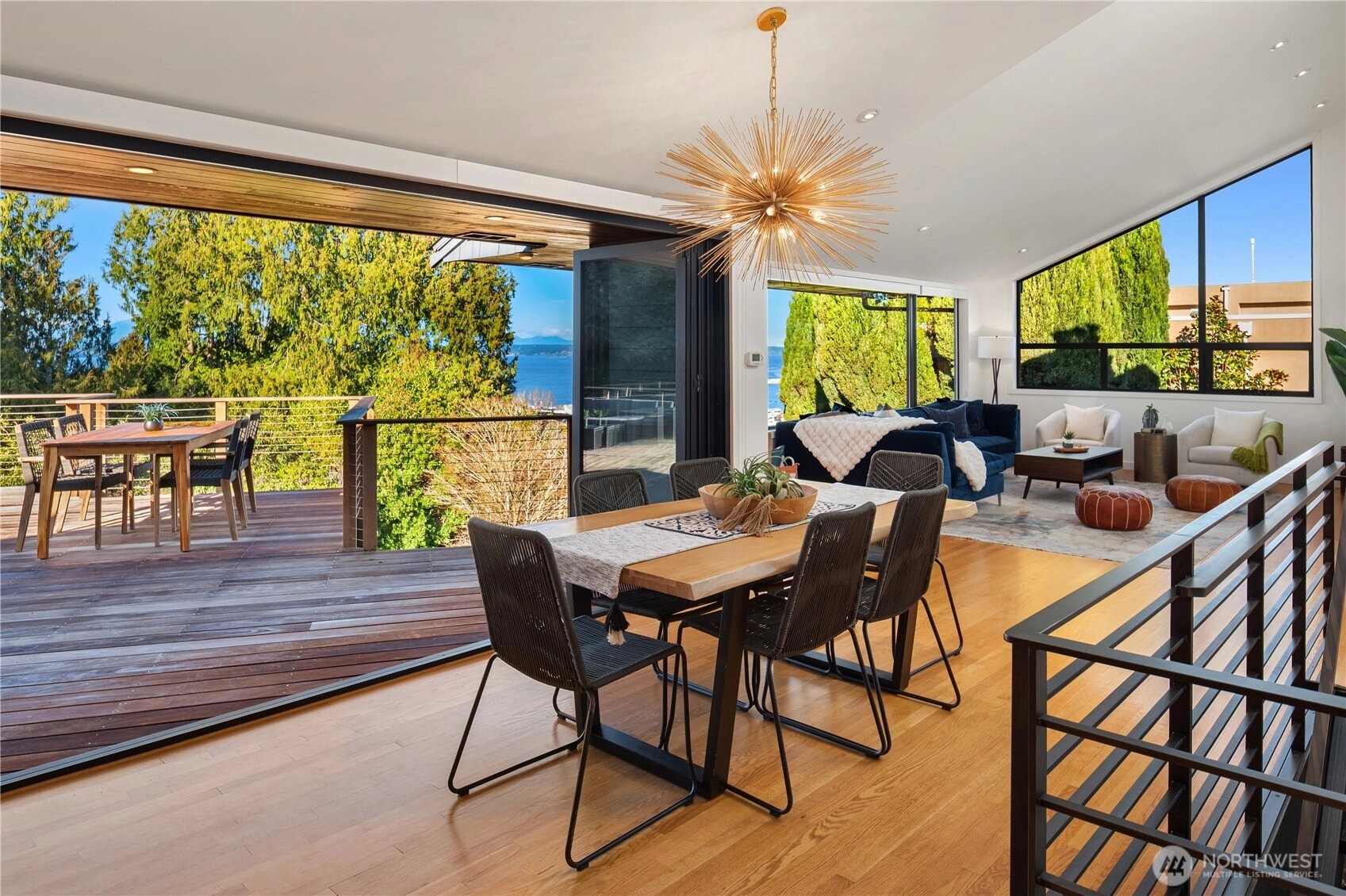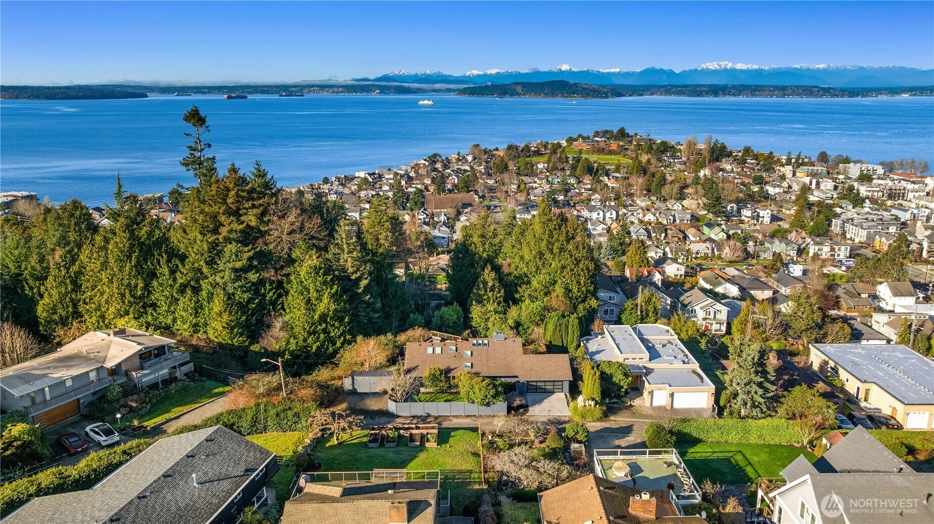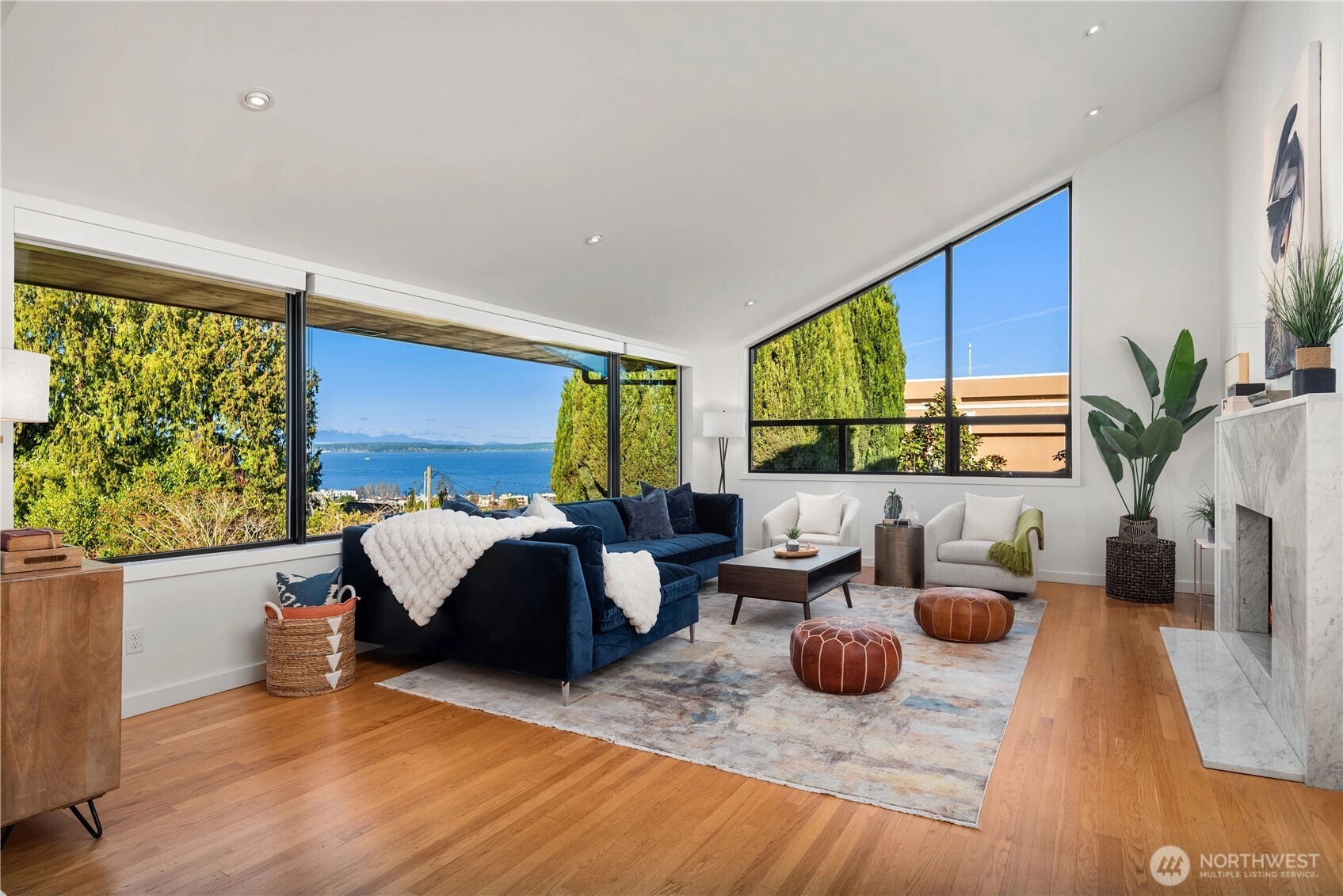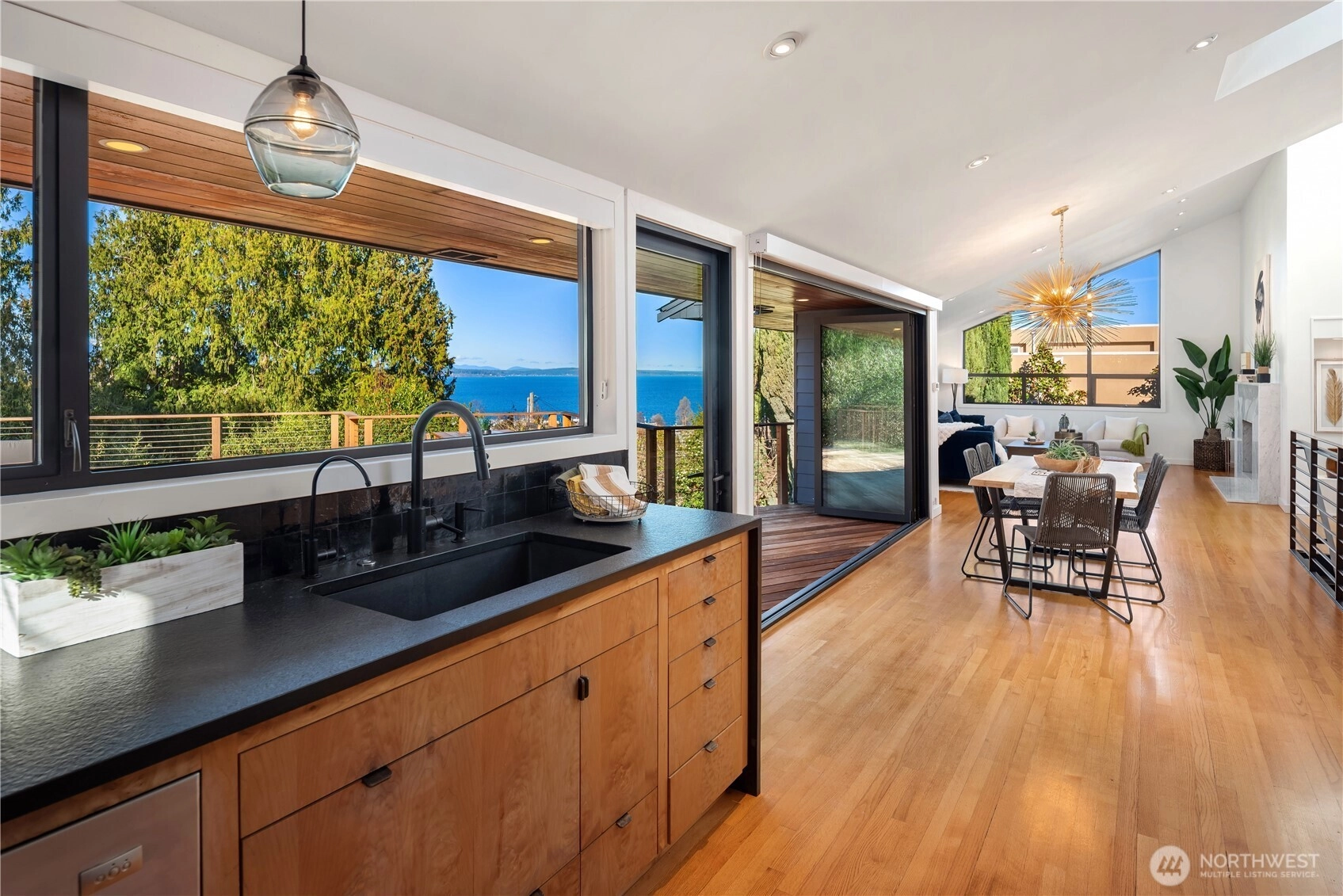 Architecturally significant and quietly breathtaking, this elevated mid-century modern showcases Puget Sound and Olympic Mountain views from one of West Seattle's most desirable settings. Vaulted ceilings and expansive glass invite luminous natural light, while signature NanaWall doors open to a grand ipe deck - a stunning extension of the home designed for sophisticated entertaining and sunset gatherings. Elegant yet approachable, the interiors balance iconic design with thoughtful updates including remodeled baths, skylights throughout, rich hardwood flooring, air conditioning and two statement fireplaces. A secluded courtyard offers an additional layer of serenity, while the primary suite provides a peaceful retreat removed from the rhythms of daily life. Rarely does a home deliver this level of privacy, architectural integrity, and proximity to Alki Beach - creating a lifestyle defined by beauty, ease, and connection to the water...you will love it here!