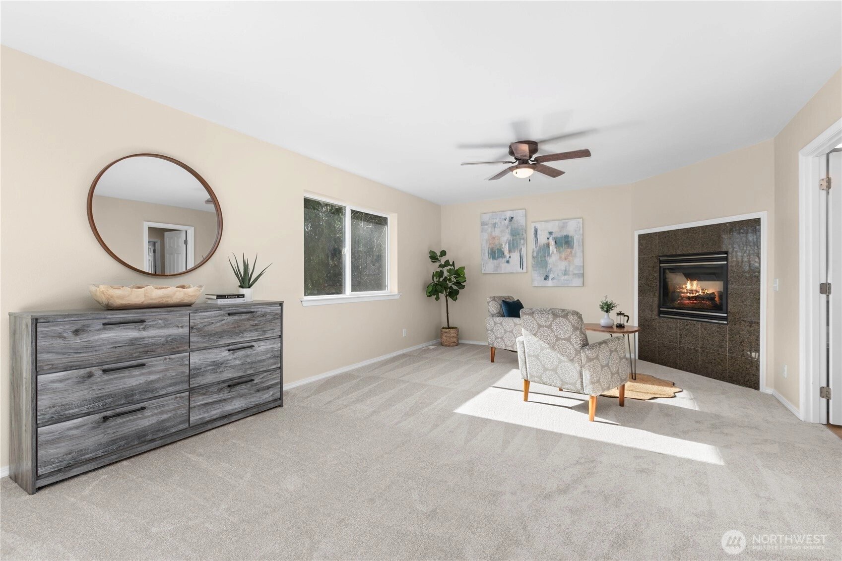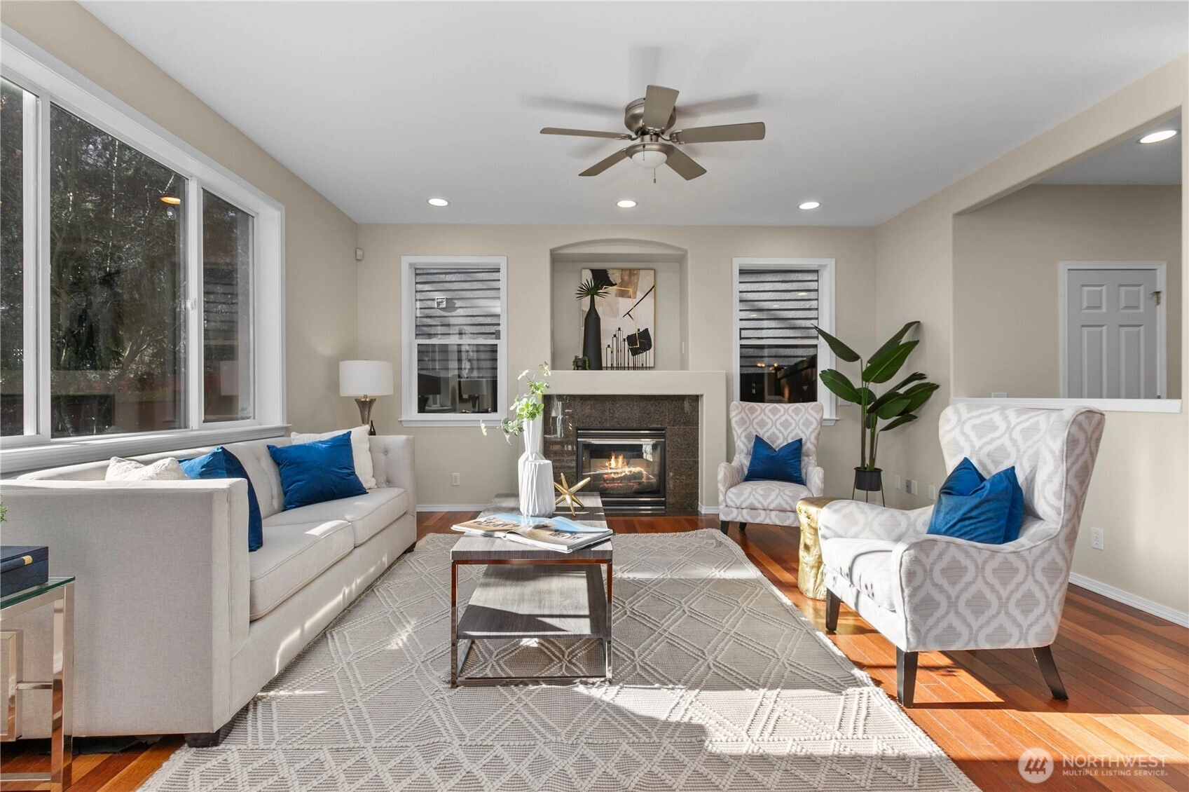 Tucked into the desirable Summerlin Ridge community, this detached, stand-alone home, offers comfort, privacy, and everyday convenience. The thoughtfully designed floor plan has three bedrooms and 2.5 baths, ideal for modern living. The main level welcomes you with a bright living room centered around a welcoming gas fireplace, flowing seamlessly into the kitchen—perfect for both daily living and entertaining. The kitchen is well appointed with ample cabinetry, quality appliances, and efficient workspace, while hardwood flooring adds warmth and durability throughout. A spacious, separate dining room creates an ideal setting for gatherings both intimate and celebratory. Upstairs, the expansive primary suite features a private bath, walk-in closet, cozy gas fireplace and peaceful territorial outlook. Two additional bedrooms offer versatility for guests, work-from-home needs, or recreation. Enjoy outdoor living with a private patio and yard space. An attached two-car garage with EV charging adds convenience and modern functionality. Conveniently located near transit, sidewalks, and everyday amenities, this home offers an easy, comfortable lifestyle in a well-maintained community.