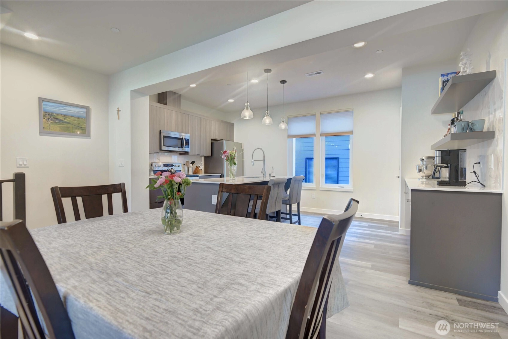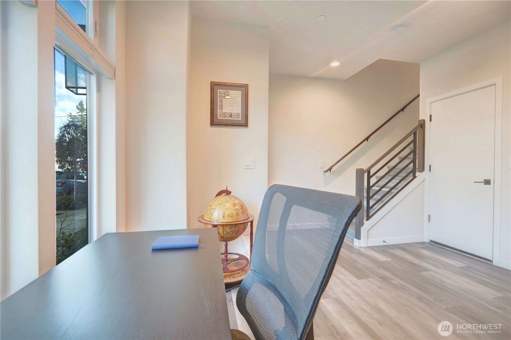 Better-Than-New, this home is set apart with impeccable quality and choices that promote comfort, longevity, and premier enjoyment. High ceilings and abundant natural light provide a backdrop for all that’s to come. A ground level Den is a perfect place to work from home or to carve out a special retreat. On the main, the Kitchen, Dining, and Living room come together to create a place of gathering and connection. Kitchen features a large island, slab counters, stainless appliances, large Pantry, and a Coffee Bar to greet the mornings or a Serving Bar when you host. The Dining will accommodate you and your guests and is flexible enough to arrange in whatever way suits. Relax in the Living Room with electric fireplace for ambiance and warmth and open the sliders to the Balcony for easy grilling or sit and watch the world go by. Upstairs, find three Bedrooms, highlighted by the Primary Suite with vaulted ceilings, walk-in-closet, and private Bath. The two extra Bedrooms are a nice size and share a full Bath off the hall, where you’ll also find the Laundry that lives where the clothes are! Venture to the Roof-Top-Deck with Newtech roof tiles and enjoy privacy while you experience outdoors. Two car Garage with high ceilings for envy-worthy storage. Air conditioning throughout. Included are custom blinds. Blocks to Mountlake Terrace Light Rail, Library, & 9-acre Veterans Memorial Park. Within the urban Town Center boundaries. Close to Edmonds Waterfront, shopping, restaurants.