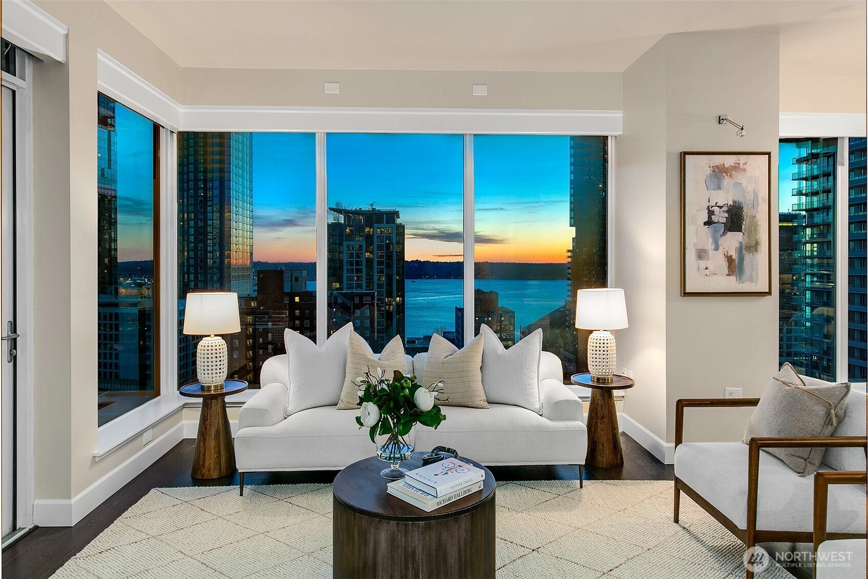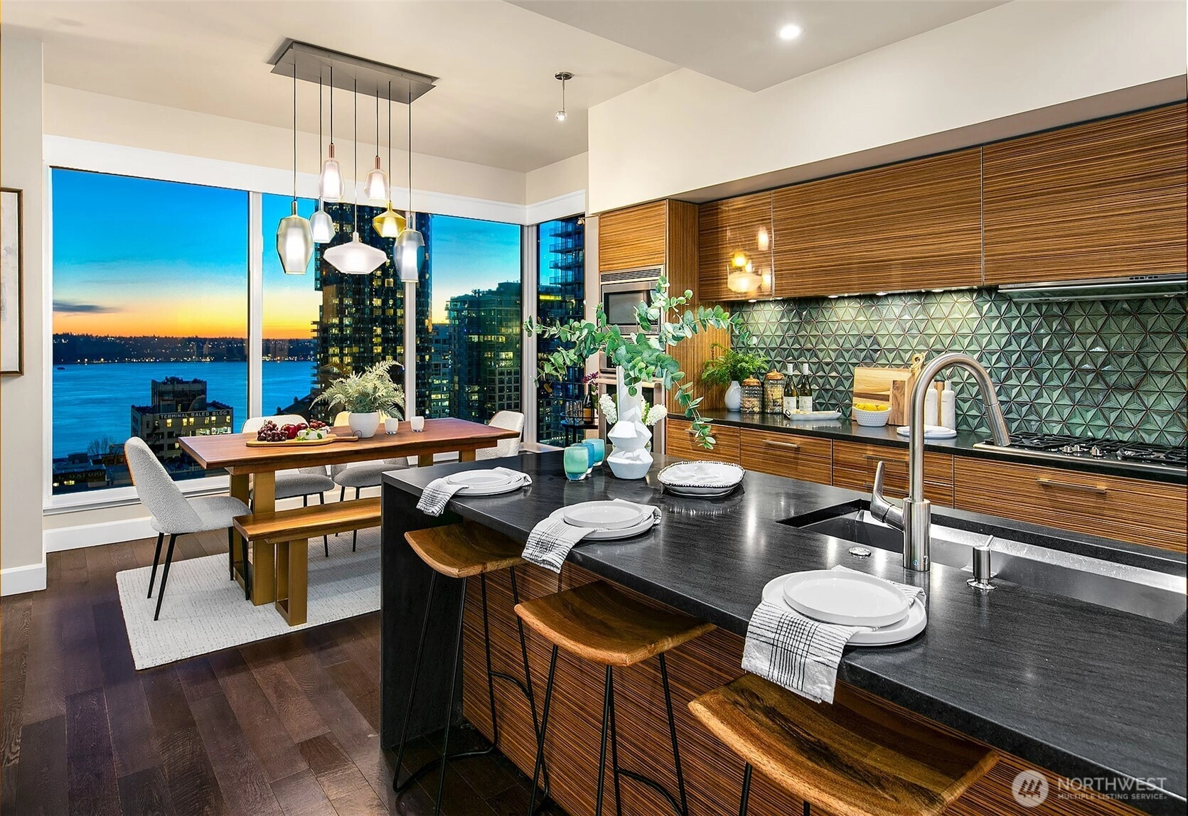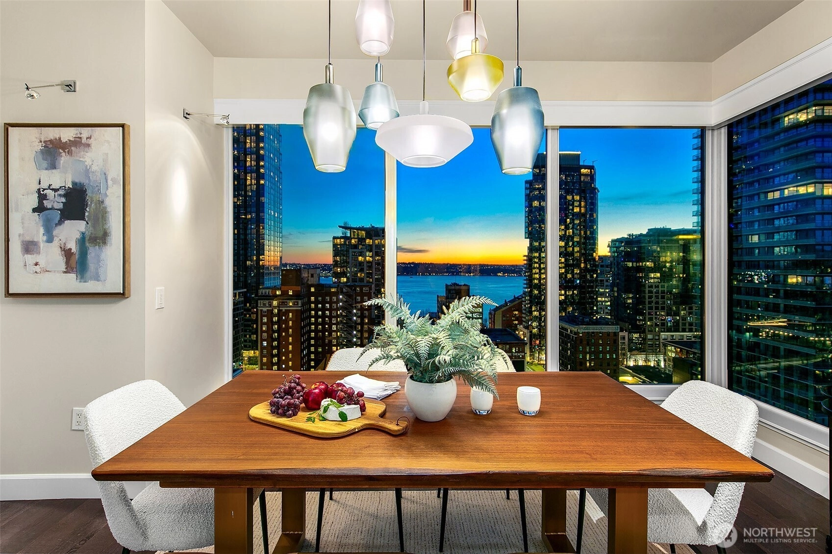 South Western water, city and Olympic mountain views. Experience Escala luxury living in this expansive oversized 2bedroom show stopper condo! This prestigious residence features amazing 220sqft outdoor space, garden & grill. Incredible value for the luxury buyer, featuring stunning designer upgrades- entry offers built in beverage cooler with custom counter and cabinets, milestone finished column, designer vestibule, modern light fixtures. Abundant light floods your home from soaring 10-foot floor-to-ceiling windows. Breathtaking night views- home embodies modern elegance. Step into a spacious, open-concept layout designed for both comfort & sophistication-perfect for entertaining or relaxing in style. Premium finishes, top-tier appliances &exclusive building amenities set a new standard for urbanliving. 2 premier parking + 1storage. World Class amenities, 2 pools, fitness center, spa, theater room, wine cave, 2 zoom meeting rooms, full caterer kitchen, owners event space hosts 120 guests! 24/7 concierge.