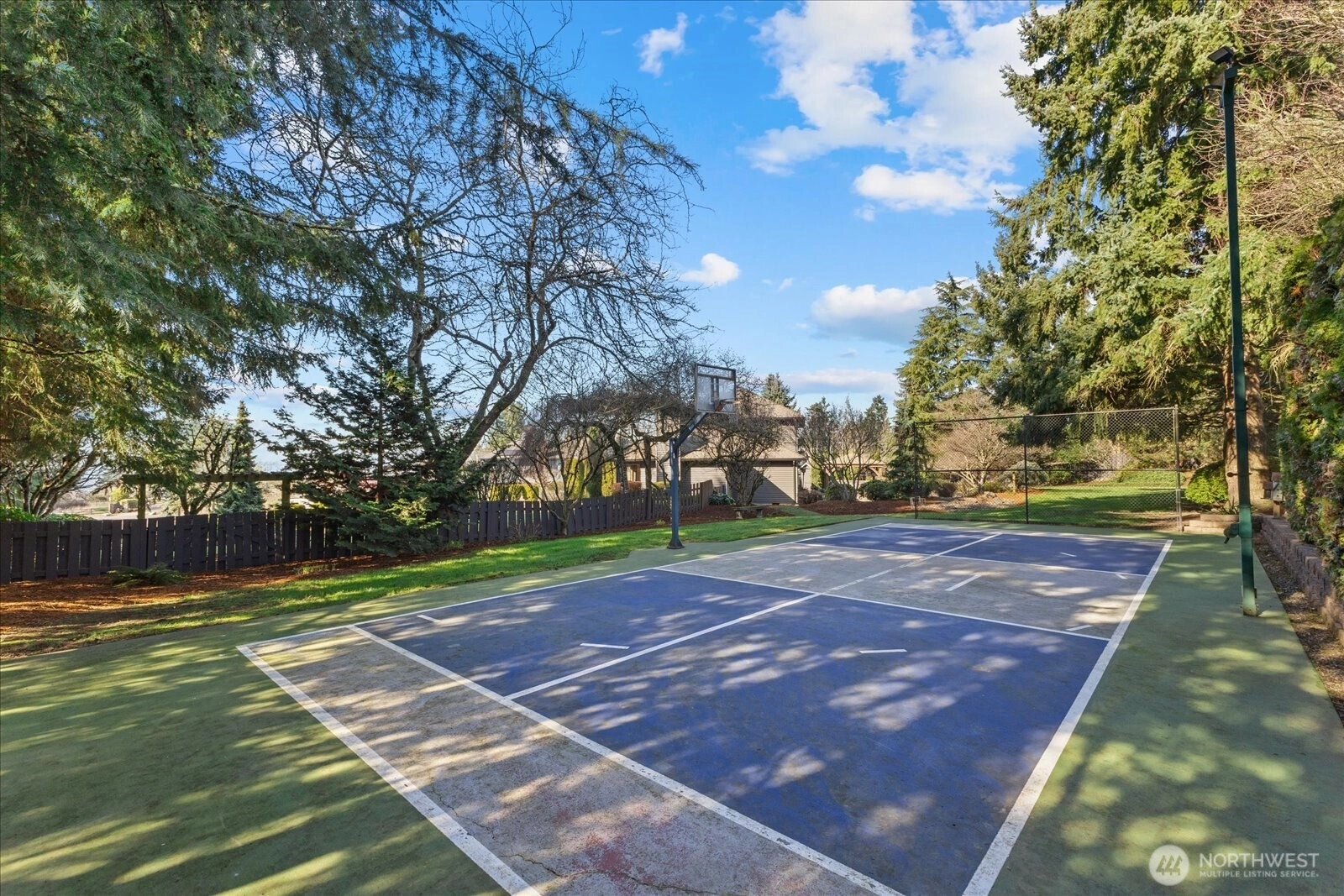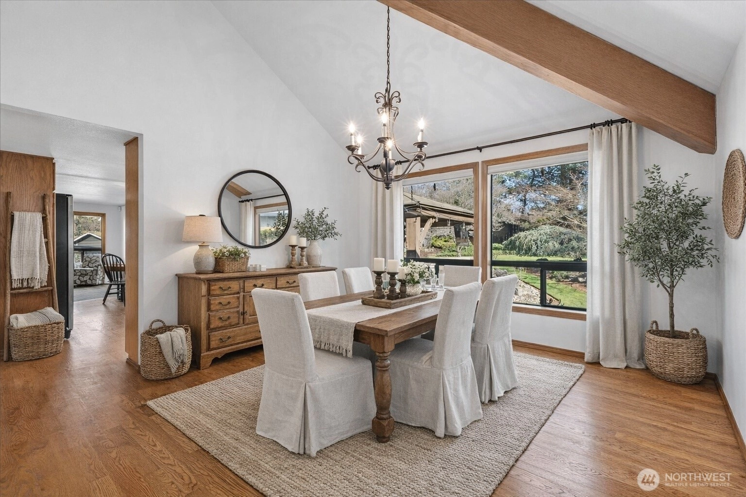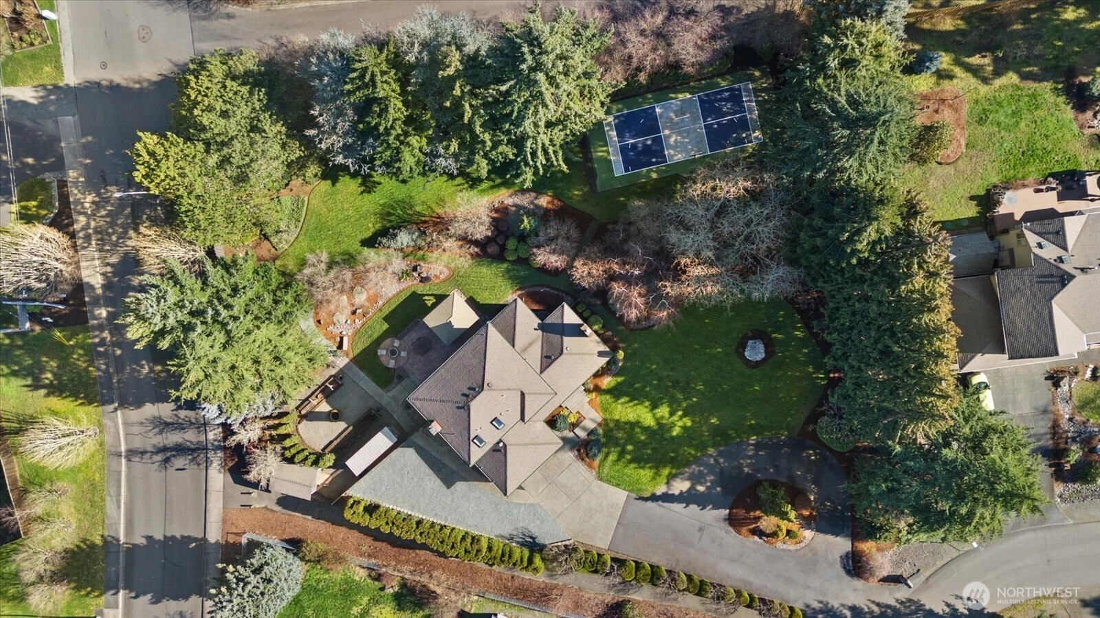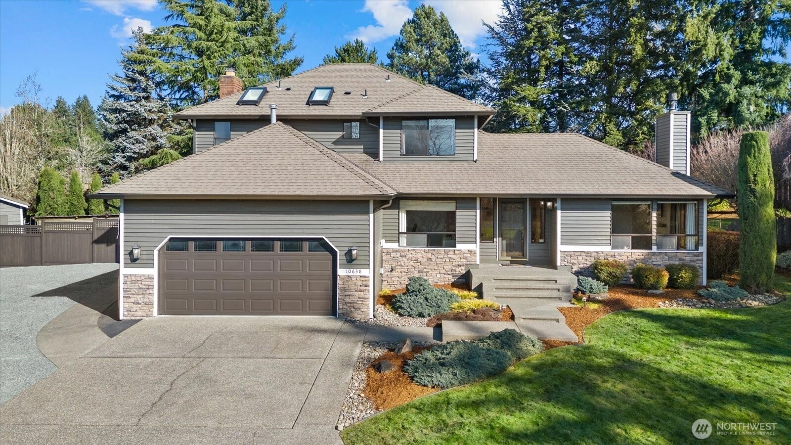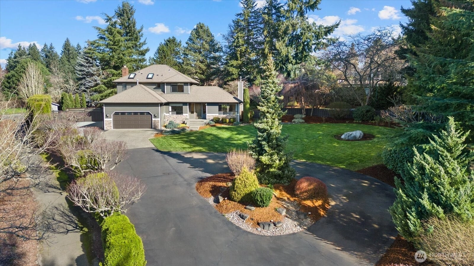 Located in an upscale Lea Hill neighborhood known for private, large lots and territorial views, this beautifully maintained home sits on a rare .81-acre park-like lot with mature landscaping and exceptional privacy. A circular driveway with RV parking creates an impressive arrival, while cedar trees and generous outdoor living spaces enhance the serene setting. Inside, vaulted ceilings with exposed wood beams elevate the main living areas. Hardwood floors flow from the entry to the kitchen and nook. The living room features a gas fireplace, and the main-floor den offers built-ins and a custom desk. The formal dining room showcases wood beams and an iron chandelier. The kitchen includes granite tile countertops, glass lighting, pantry storage, and opens to the family room with a striking rock wood-burning fireplace and illuminated built-ins. The laundry room offers vintage-style flooring, wood counters, and a utility sink, plus a charming half bath with wainscoting. Upstairs are three bedrooms and an updated guest bath with beehive tile flooring and marble counters. The light-filled primary ensuite features diagonal tile floors, marble counters, a tiled shower with bench, and a custom closet. French doors open to a stamped concrete patio with built-in seating and gas fire pit. A pergola-covered outdoor kitchen, a lighted pickleball/basketball court, additional fire pit, and lush landscaping complete this exceptional property near Hwy 18, 167, Boeing, shopping.