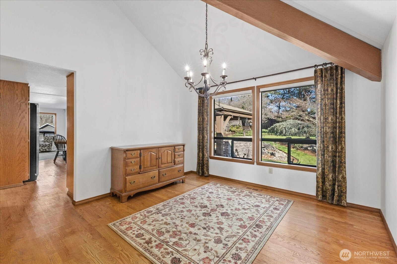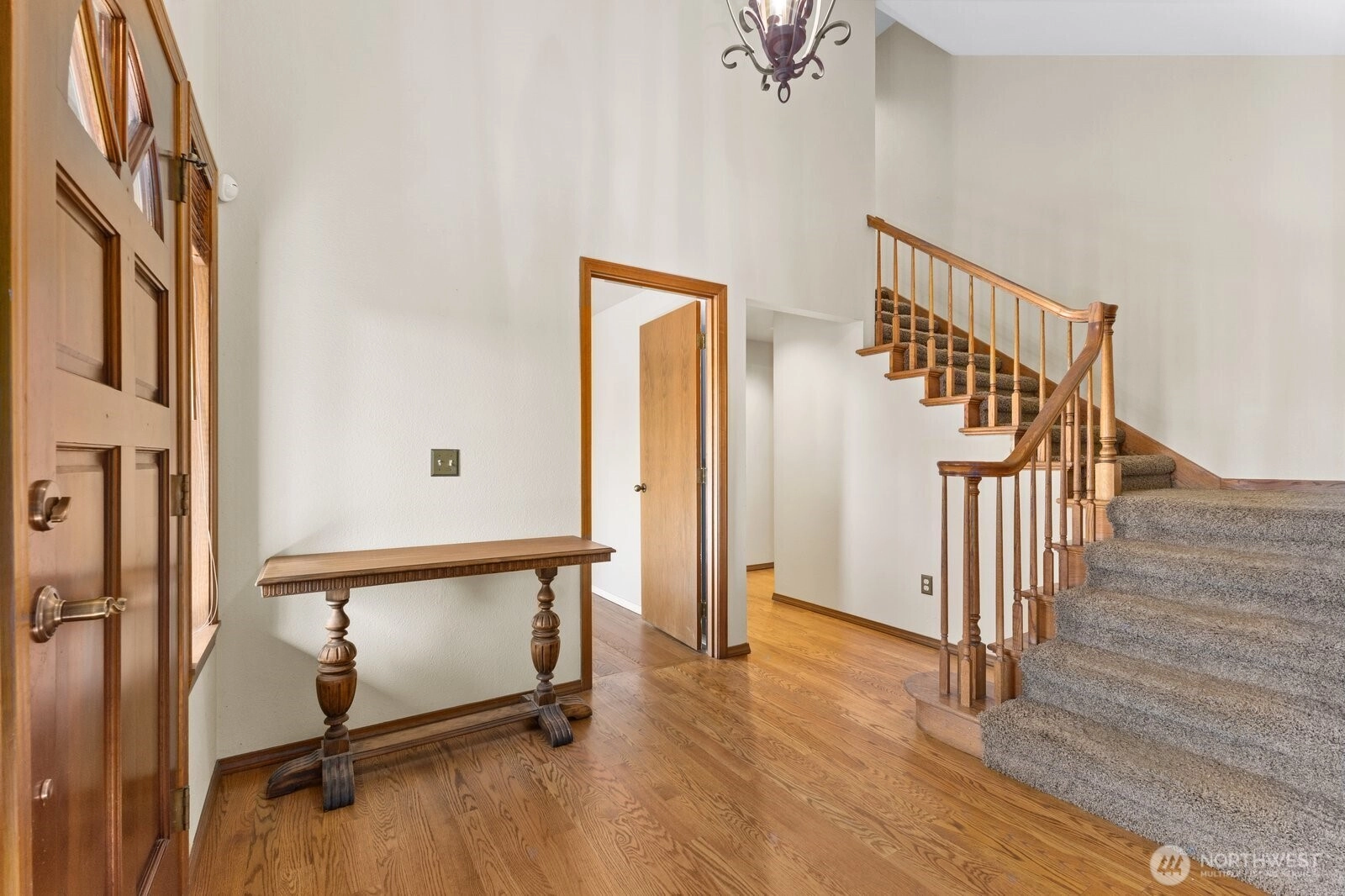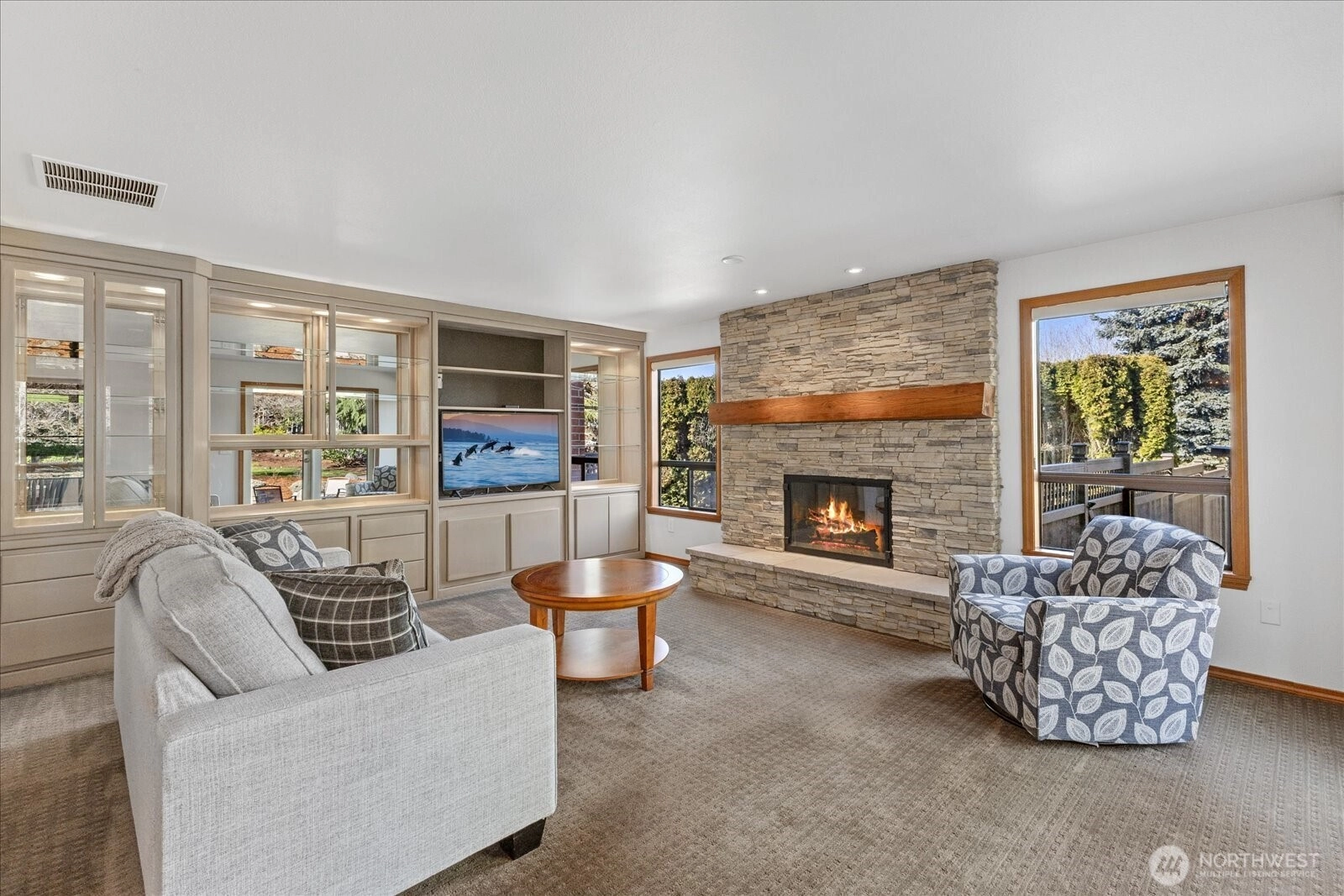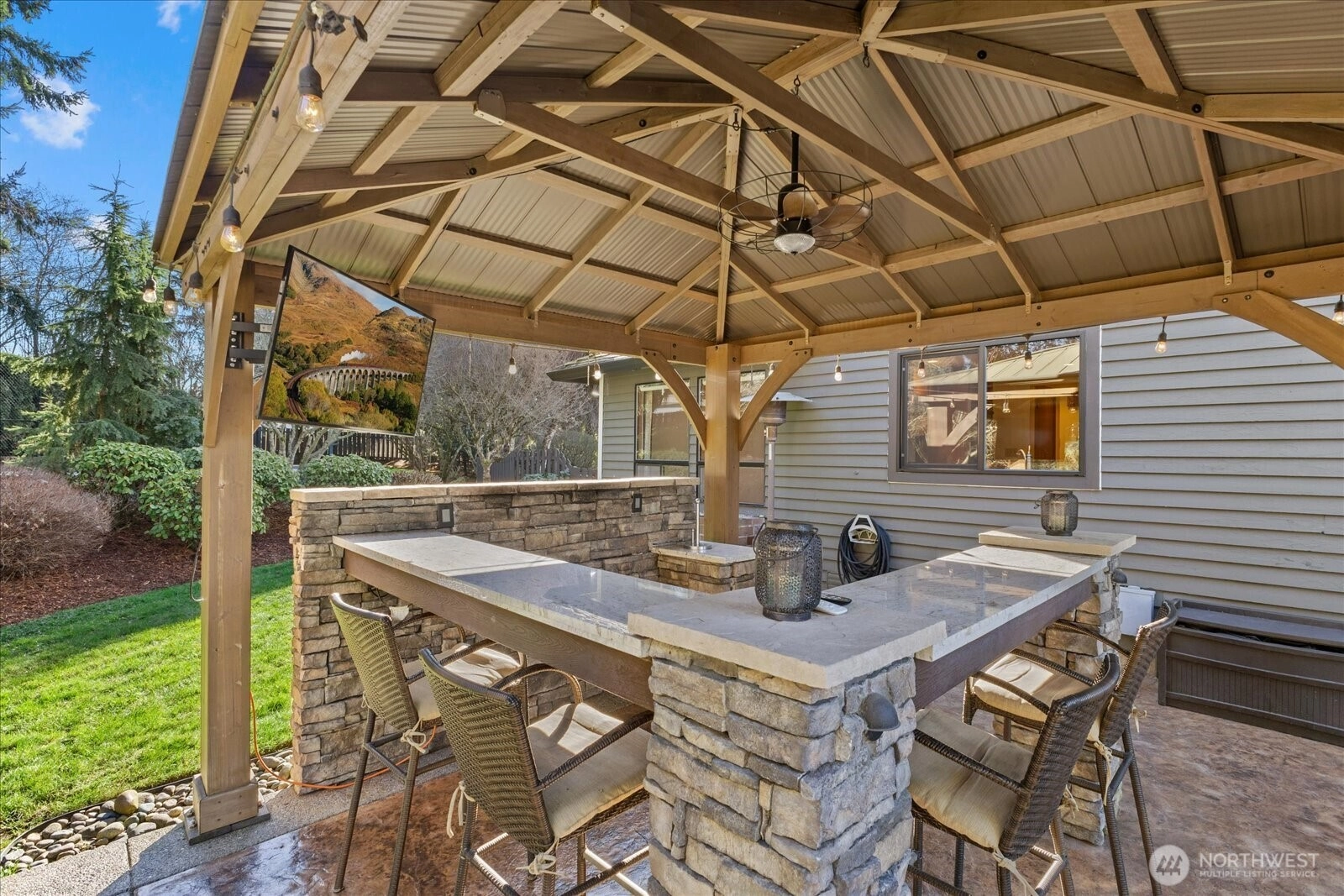 Located in an upscale Lea Hill neighborhood known for private, large lots and territorial views, this beautifully maintained home sits on a rare .81-acre park-like lot with mature landscaping and exceptional privacy. A circular driveway with RV parking creates an impressive arrival, while cedar trees and generous outdoor living spaces enhance the serene setting. Inside, vaulted ceilings with exposed wood beams elevate the main living areas. Hardwood floors flow from the entry to the kitchen and nook. The living room features a gas fireplace, and the main-floor den offers built-ins and a custom desk. The formal dining room showcases wood beams and an iron chandelier. The kitchen includes granite tile countertops, glass lighting, pantry storage, and opens to the family room with a striking rock wood-burning fireplace and illuminated built-ins. The laundry room offers vintage-style flooring, wood counters, and a utility sink, plus a charming half bath with wainscoting. Upstairs are three bedrooms and an updated guest bath with beehive tile flooring and marble counters. The light-filled primary ensuite features diagonal tile floors, marble counters, a tiled shower with bench, and a custom closet. French doors open to a stamped concrete patio with built-in seating and gas fire pit. A pergola-covered outdoor kitchen, a lighted pickleball/basketball court, additional fire pit, and lush landscaping complete this exceptional property near Hwy 18, 167, Boeing, shopping.