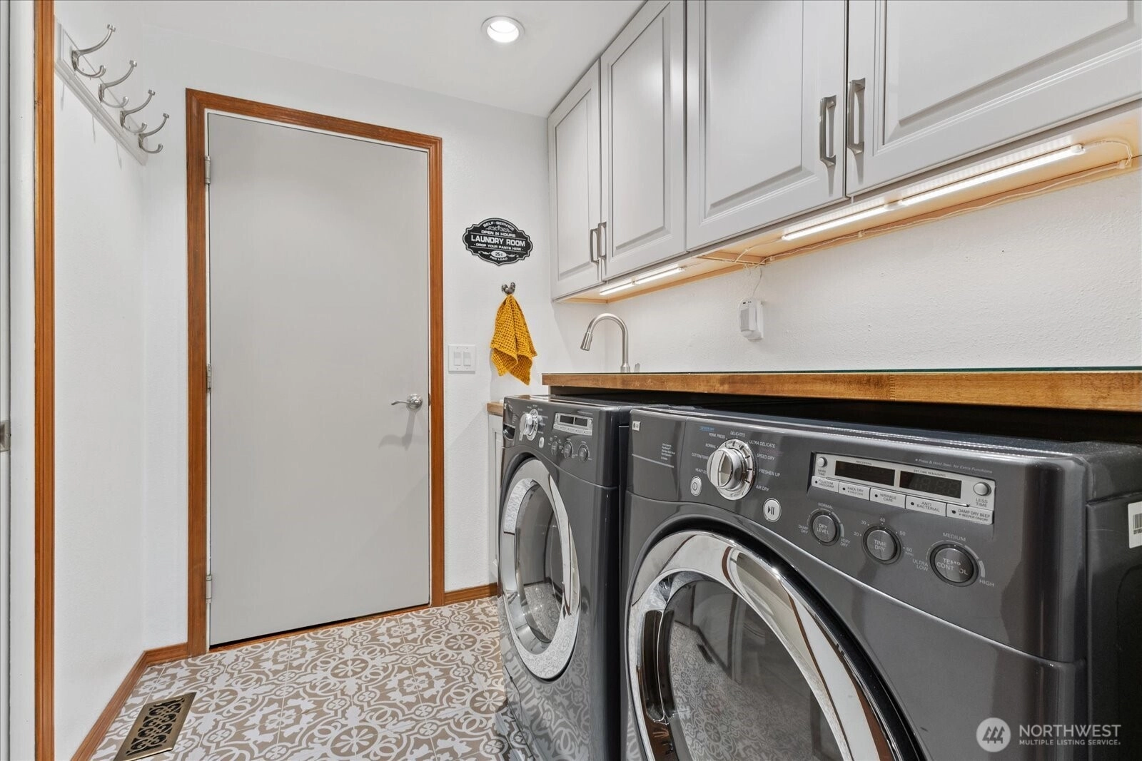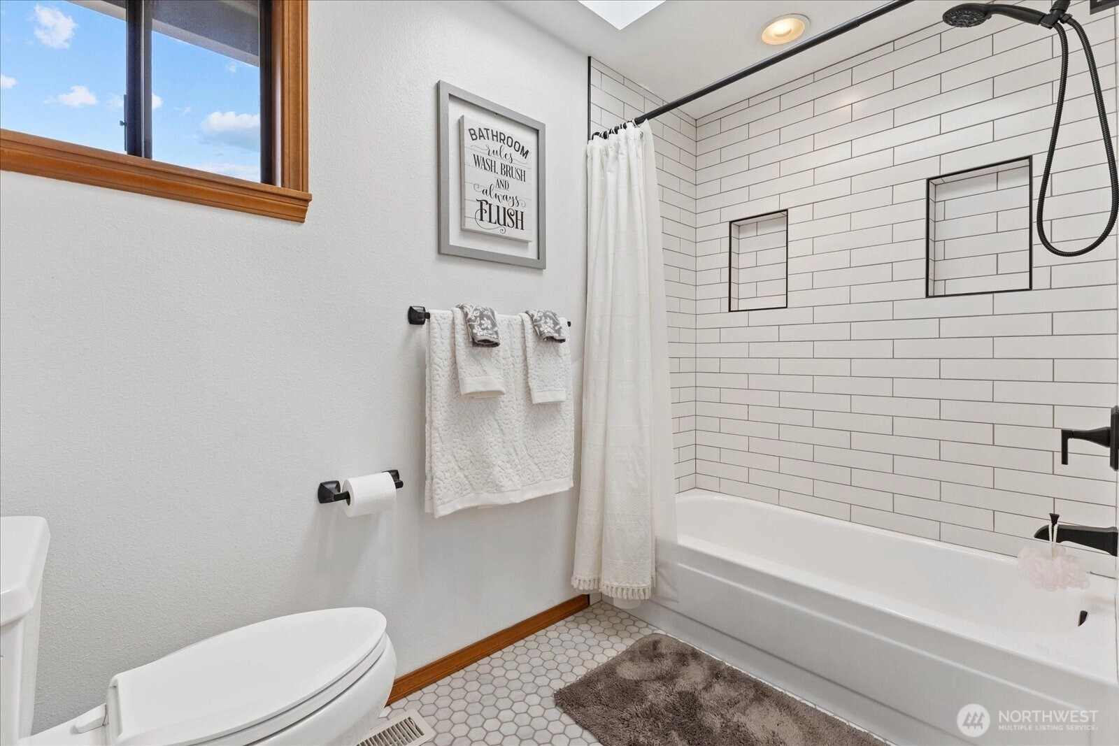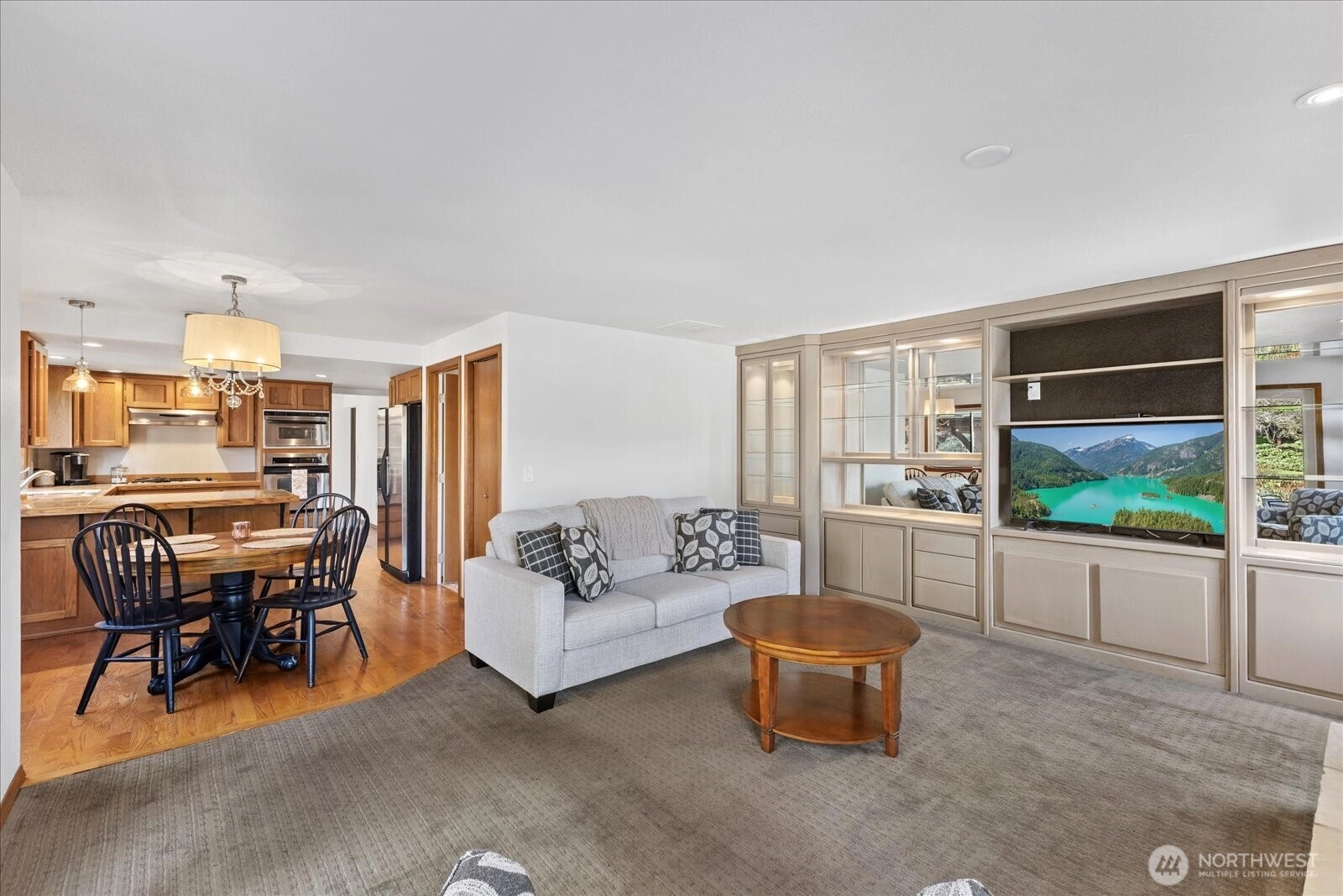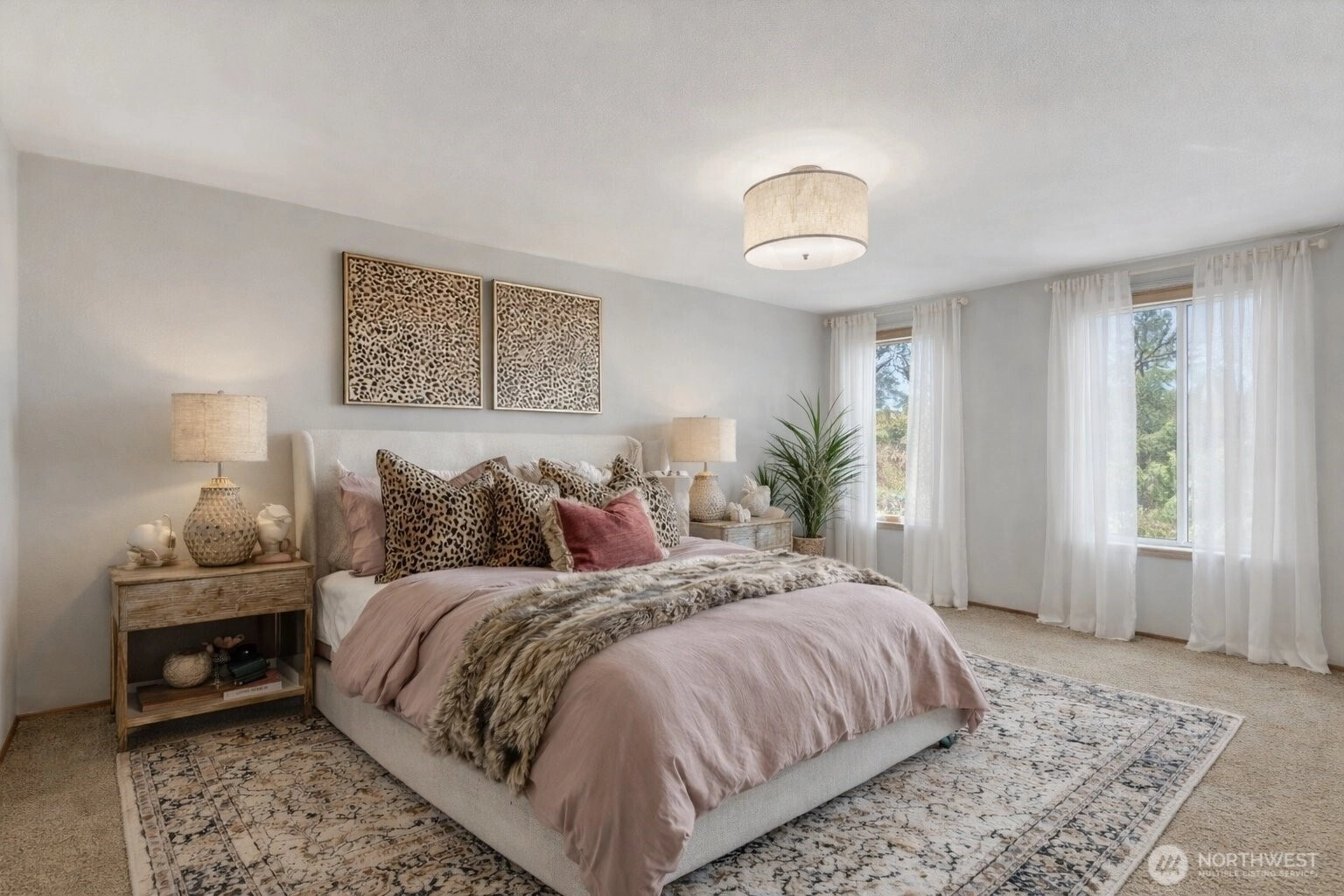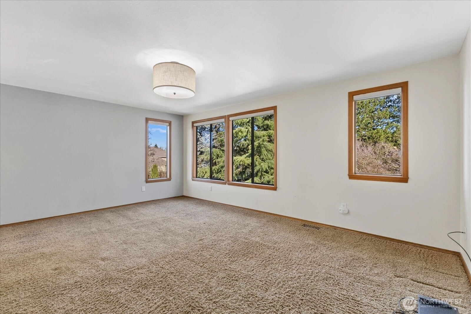 Located in an upscale Lea Hill neighborhood known for private, large lots and territorial views, this beautifully maintained home sits on a rare .81-acre park-like lot with mature landscaping and exceptional privacy. A circular driveway with RV parking creates an impressive arrival, while cedar trees and generous outdoor living spaces enhance the serene setting. Inside, vaulted ceilings with exposed wood beams elevate the main living areas. Hardwood floors flow from the entry to the kitchen and nook. The living room features a gas fireplace, and the main-floor den offers built-ins and a custom desk. The formal dining room showcases wood beams and an iron chandelier. The kitchen includes granite tile countertops, glass lighting, pantry storage, and opens to the family room with a striking rock wood-burning fireplace and illuminated built-ins. The laundry room offers vintage-style flooring, wood counters, and a utility sink, plus a charming half bath with wainscoting. Upstairs are three bedrooms and an updated guest bath with beehive tile flooring and marble counters. The light-filled primary ensuite features diagonal tile floors, marble counters, a tiled shower with bench, and a custom closet. French doors open to a stamped concrete patio with built-in seating and gas fire pit. A pergola-covered outdoor kitchen, a lighted pickleball/basketball court, additional fire pit, and lush landscaping complete this exceptional property near Hwy 18, 167, Boeing, shopping.