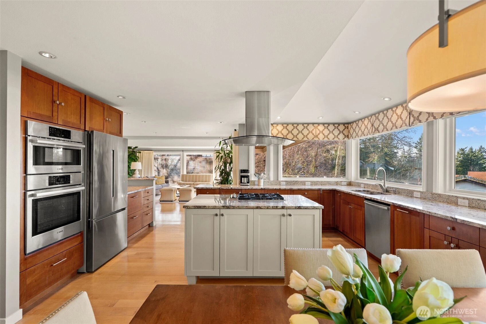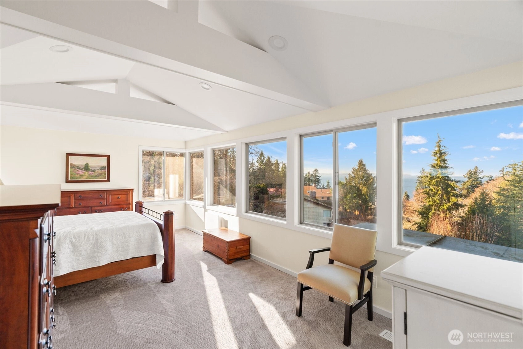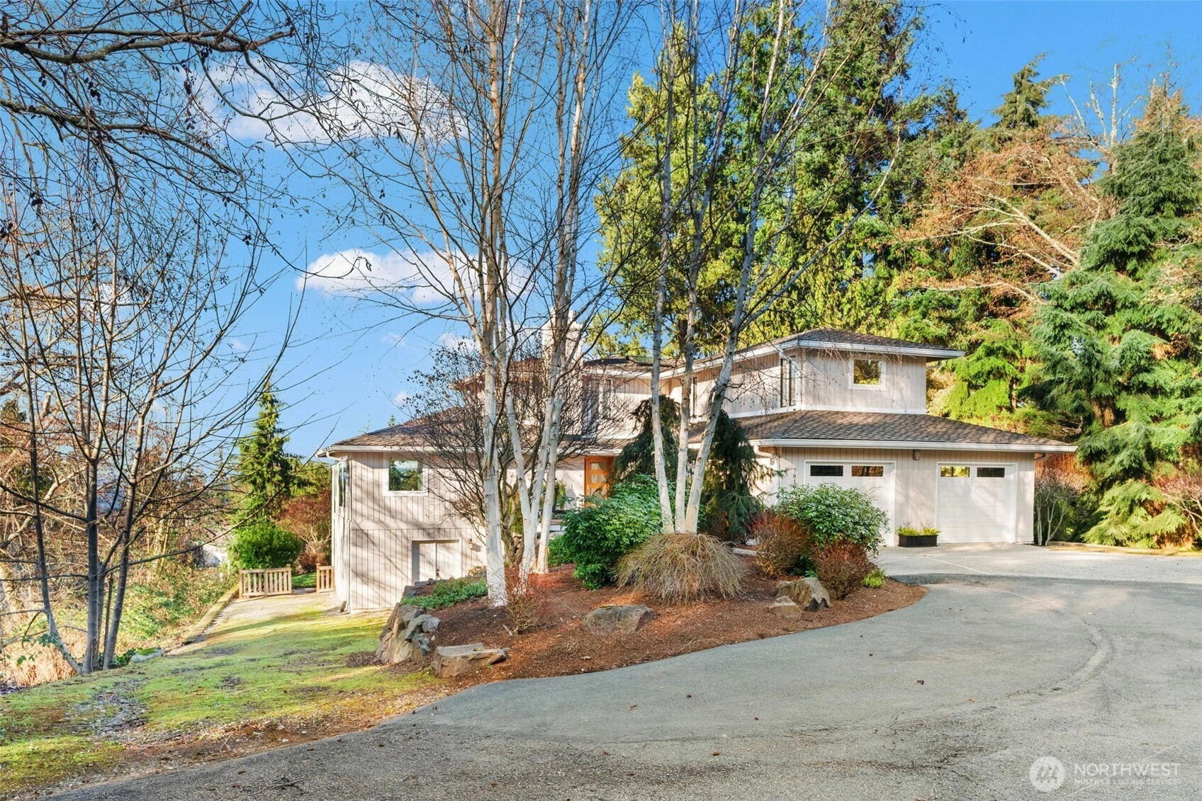 Tucked at the end of a private drive on an expansive 36,768 s ft shy-acre lot, this fully updated Edmonds retreat offers breathtaking views of Puget Sound and Whidbey Island from a setting that feels worlds away. Surrounded by trees and sky, the home lives like a luxury treehouse – private, peaceful, and elevated above it all. The main living spaces are open and light-filled, featuring hardwood floors, a statement fireplace, and seamless flow to an expansive entertainment deck complete with a hot tub – perfect for sunset watching or year-round gatherings. The kitchen is designed for both function and style, offering abundant storage, a large center island with gas cooktop, and stainless appliances, all opening to a dedicated dining area. The upper level is anchored by a stunning primary suite with spa-inspired bath, including a slipper tub, walk-in shower, and generous walk-in closet. The lower level adds flexible living with a family room featuring a second fireplace, custom built-ins, and a wet bar, along with additional private guest space. Outdoor living is just as impressive with a stamped concrete patio, expansive backyard, and a heated shop/studio is ideal for hobbies, creative space, or additional storage. Every detail has been thoughtfully updated with luxury finishes throughout, creating a home that feels both refined and effortlessly livable – private, serene, and truly one of a kind.