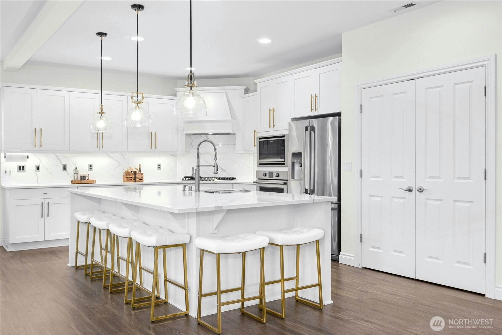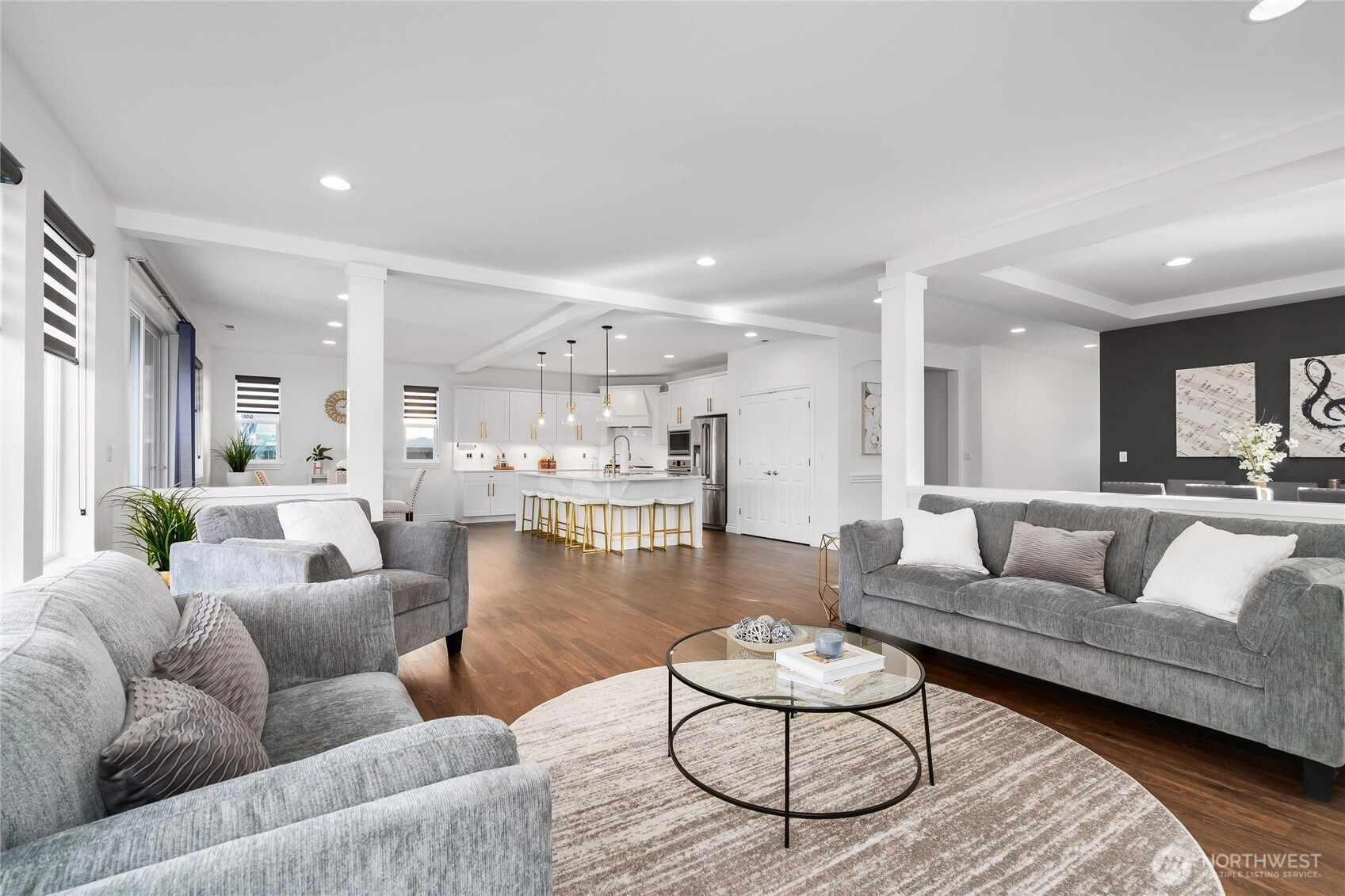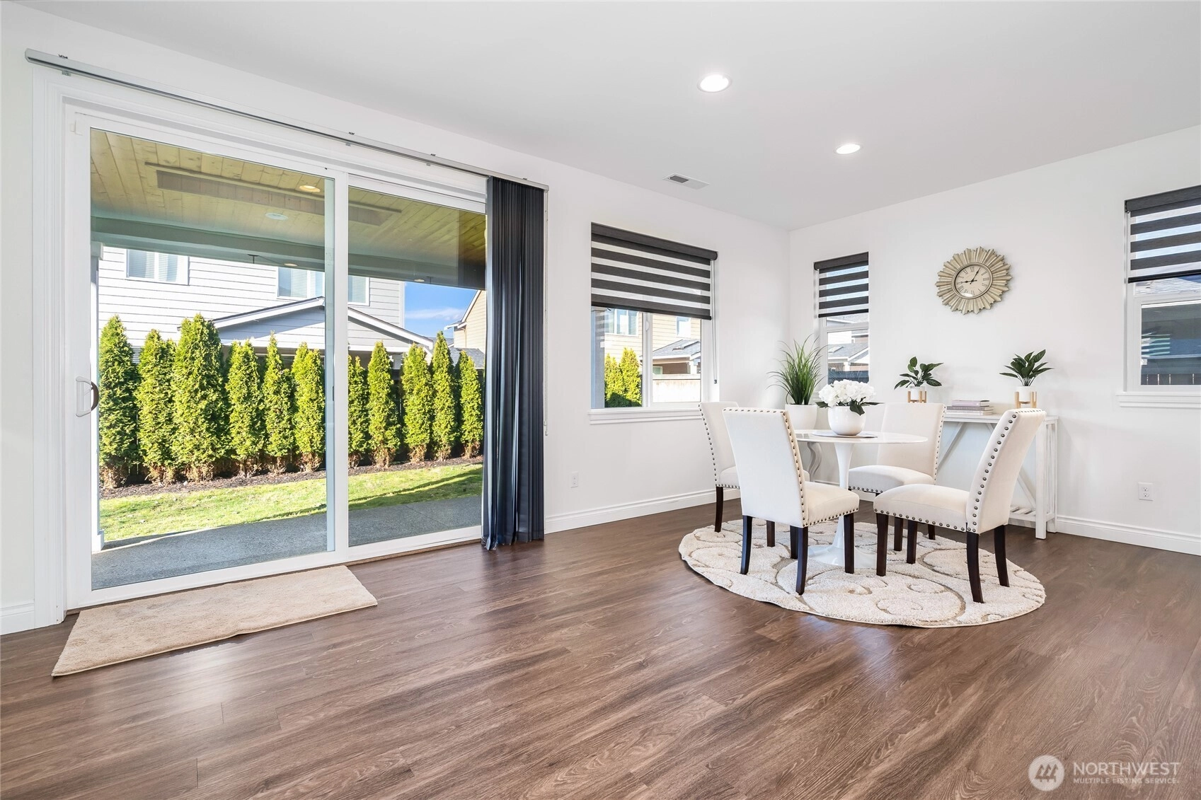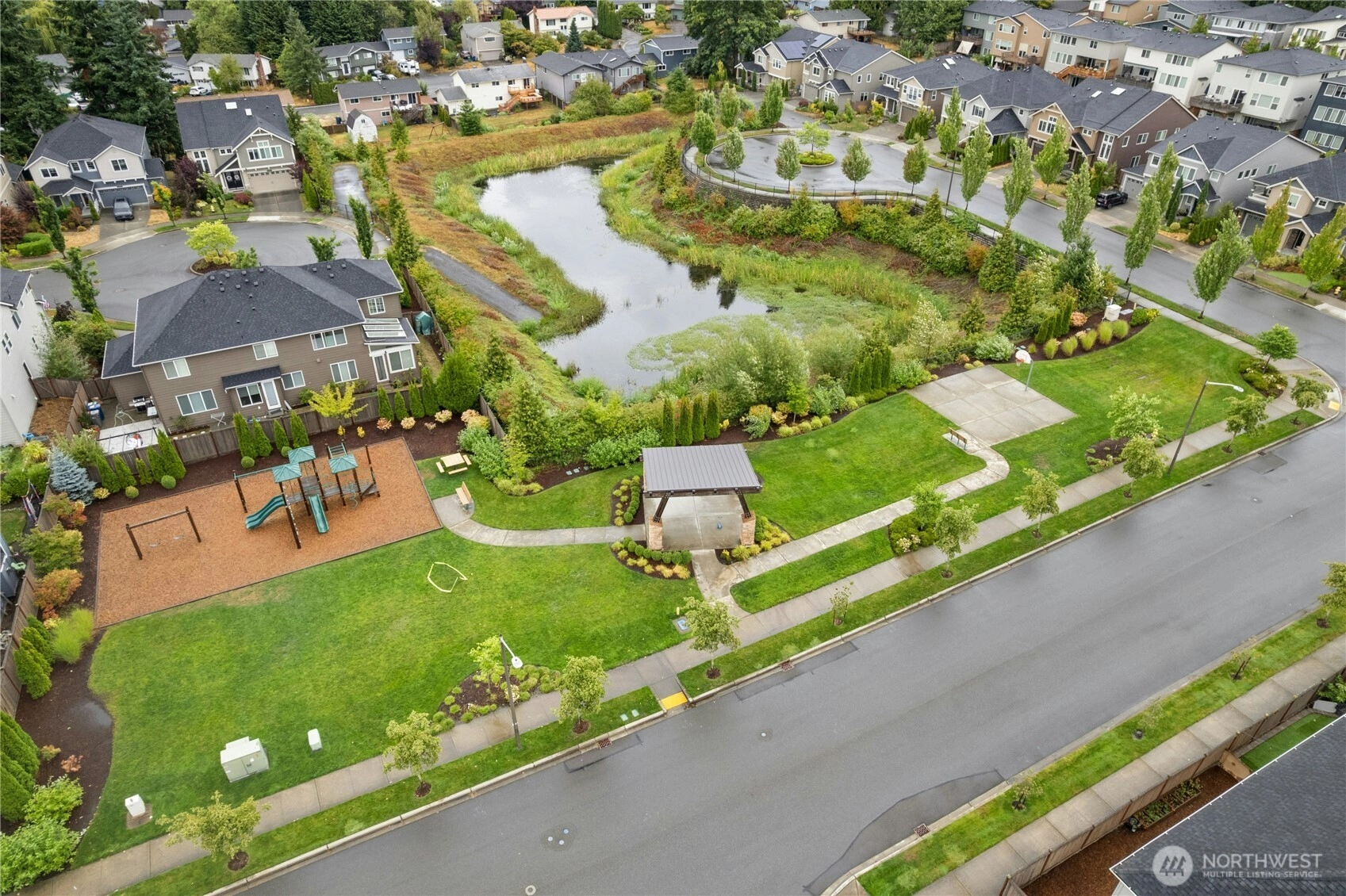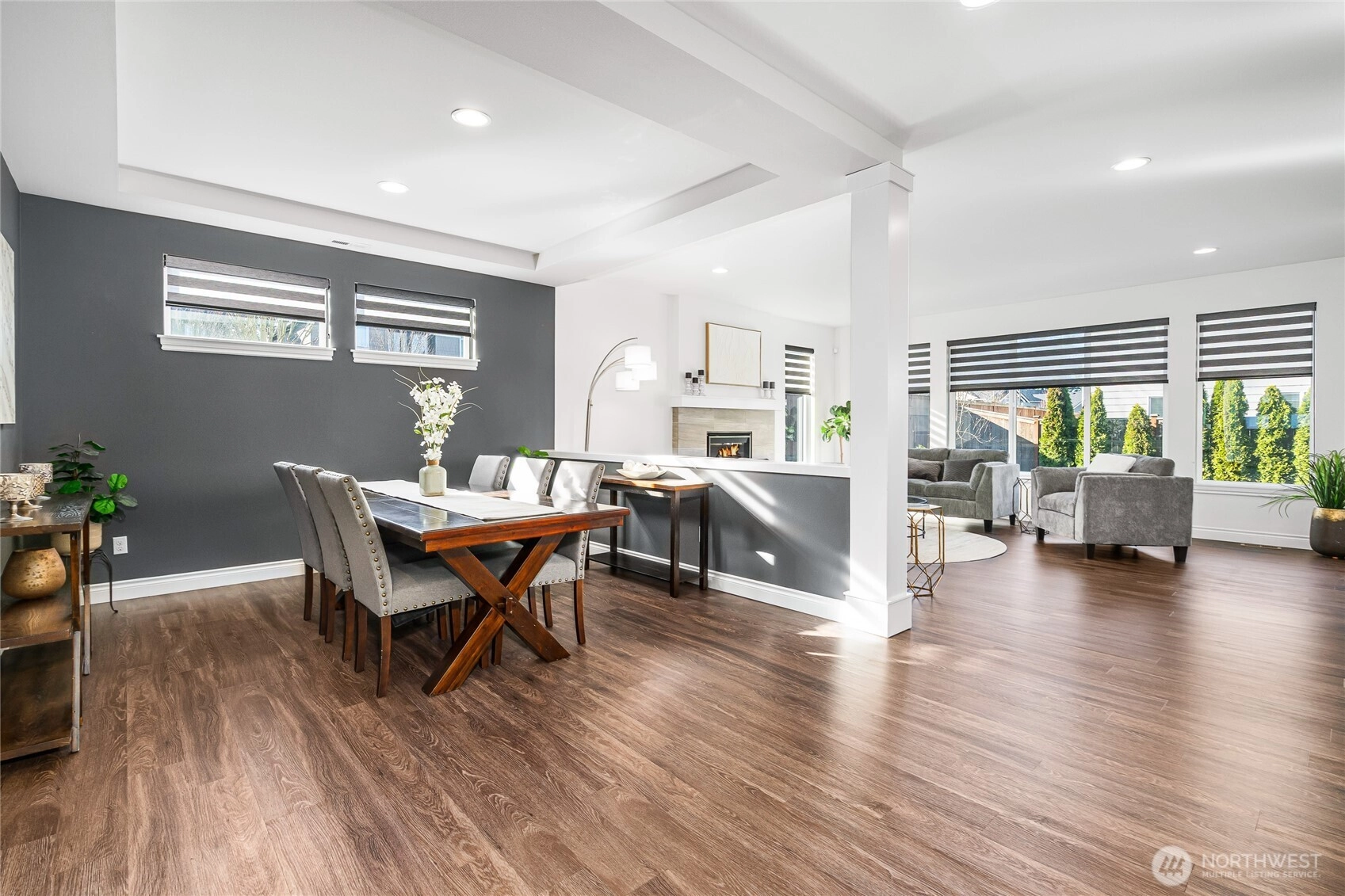 Spacious and thoughtfully designed 2-story home with approx. 3,740 sq ft, 5 bedrooms and 3 baths in the well-planned community setting of Vinterra Highlands. The open concept layout connects the kitchen, dining and living areas, creating functional gathering spaces for everyday living and entertaining. The kitchen is equipped with quartz counters, stainless appliances, large island with bar seating, and natural gas cooking. A main-floor bedroom with nearby ¾ bath offers flexible living options for guests, office or extended living needs. Upstairs bonus room with built-in speakers and Juliette balcony provides additional living or media space. Energy and comfort features include central A/C, high-efficiency forced air heat, tankless gas water heater and smart wiring. The attached 3-car garage includes an electric vehicle charging station and additional storage. Outdoor living features a covered patio and fully fenced yard. Community amenities include neighborhood playground, park, picnic areas, sport/basketball court and nearby trails. Convenient commuter access to I-405 and just minutes to Totem Lake shopping center and Woodinville Town Center with an abundance of shopping and dining options.
